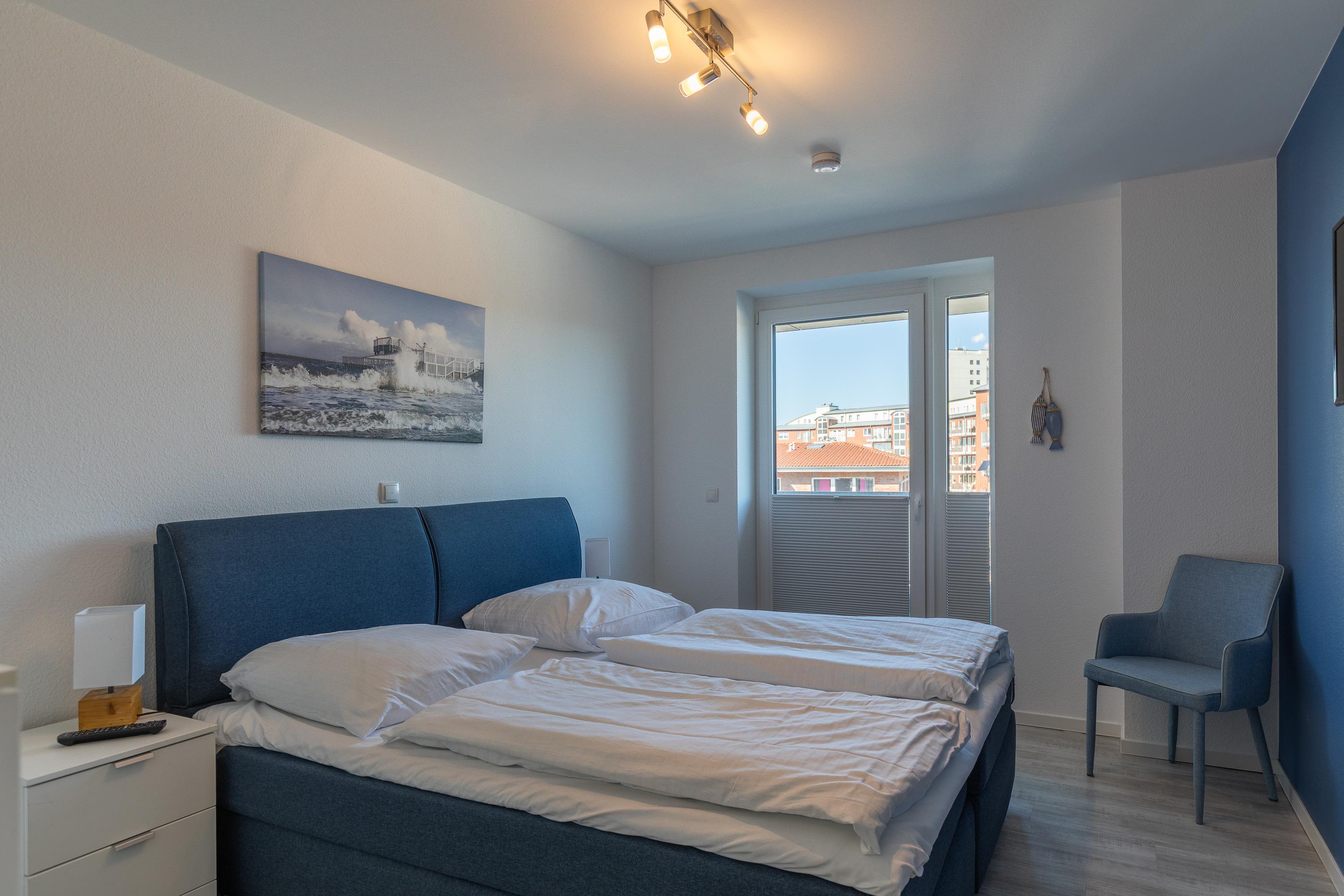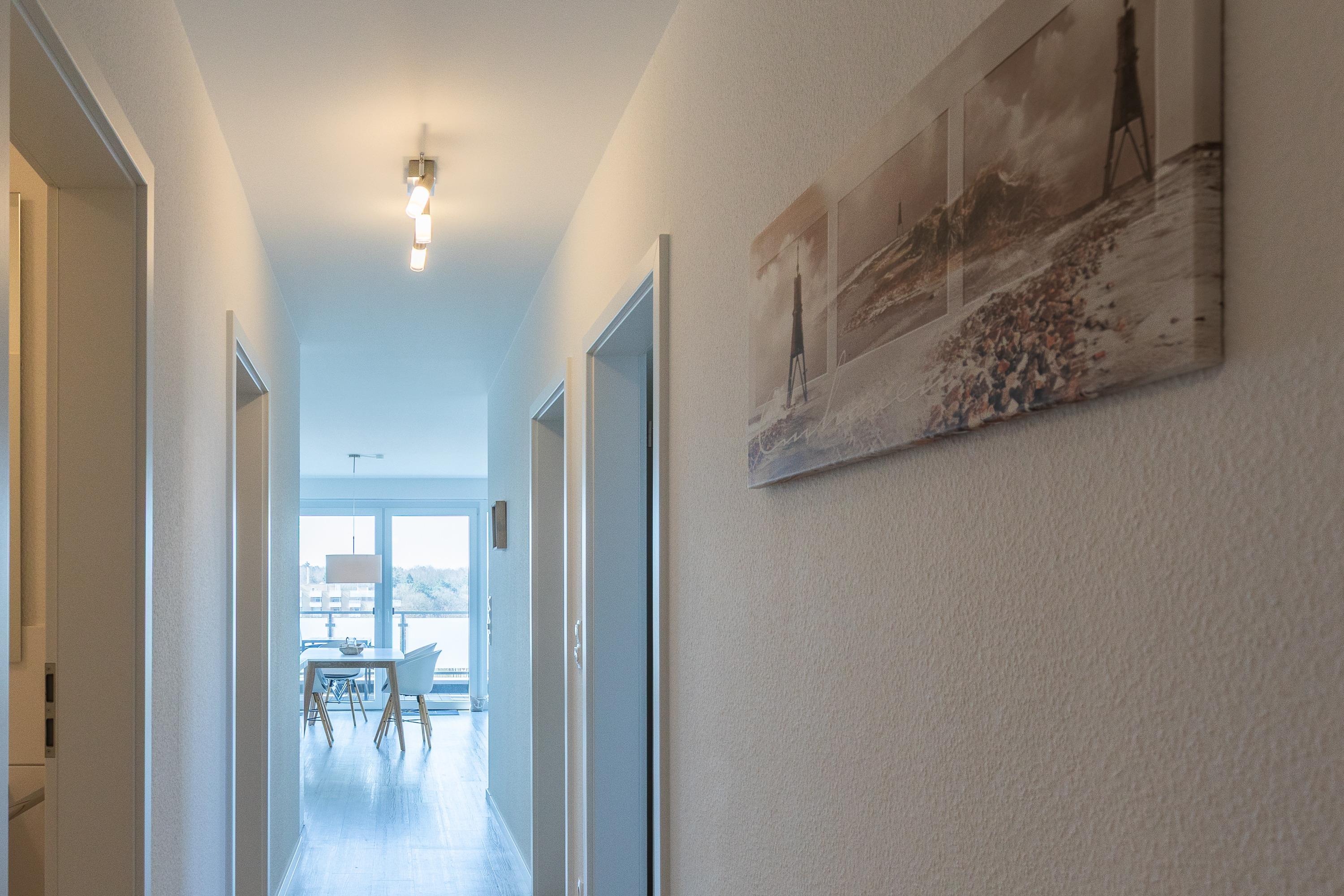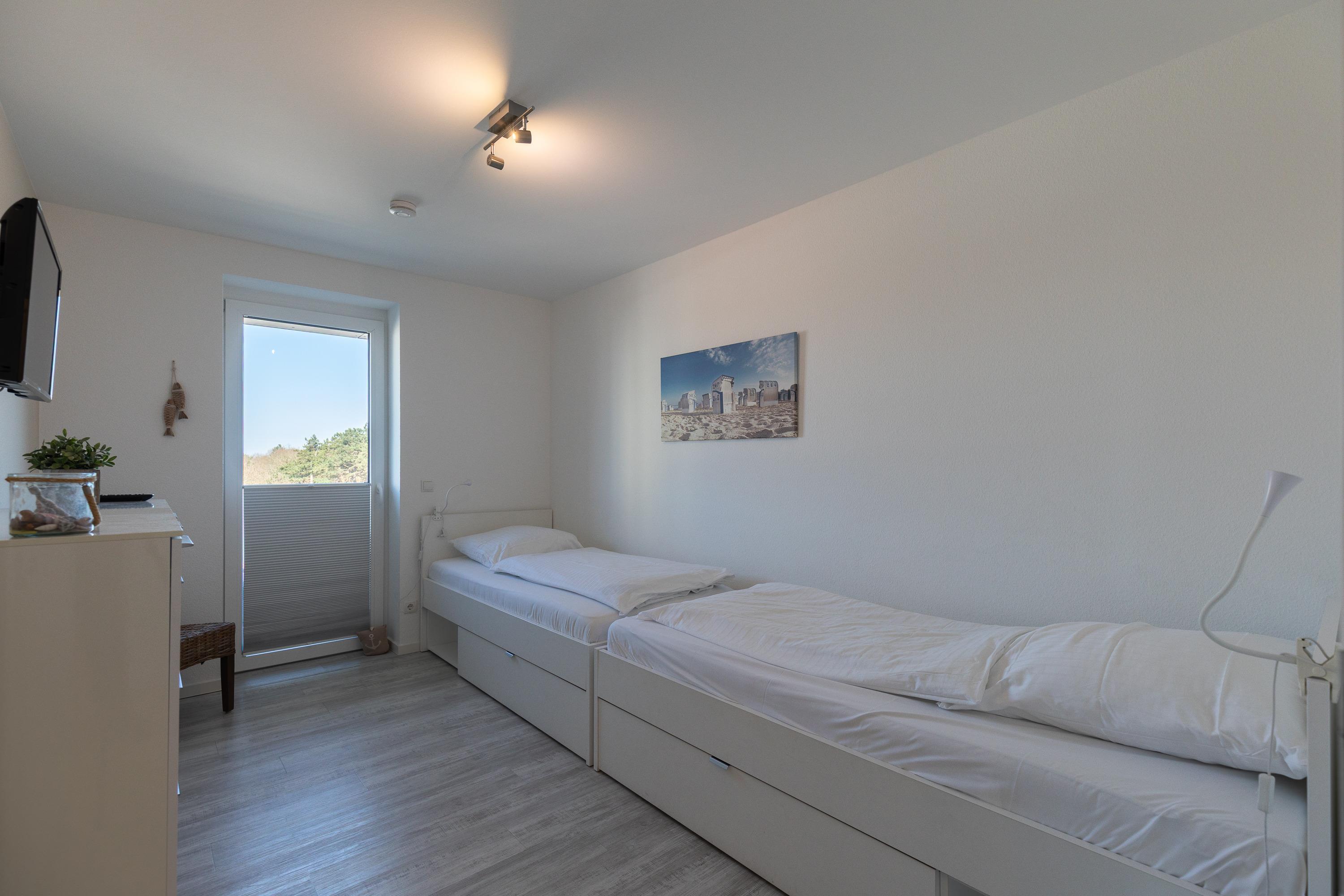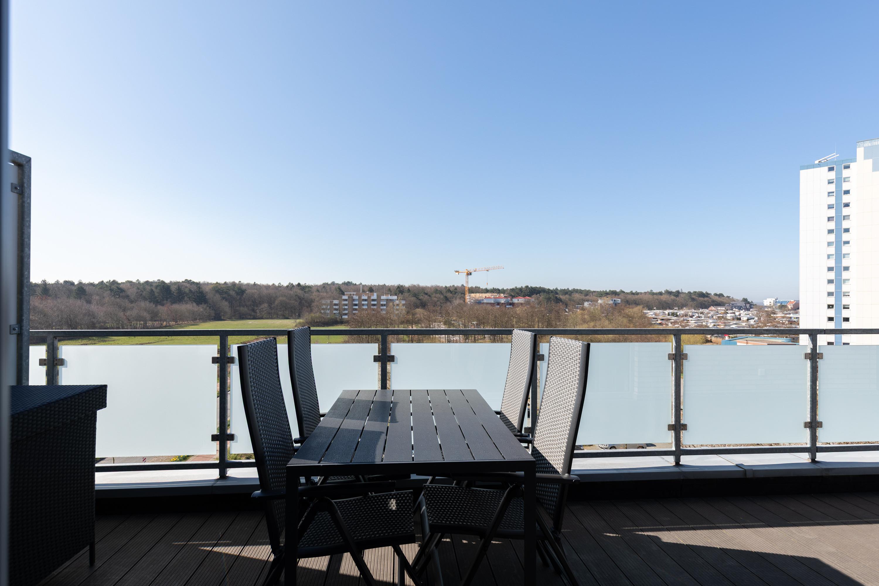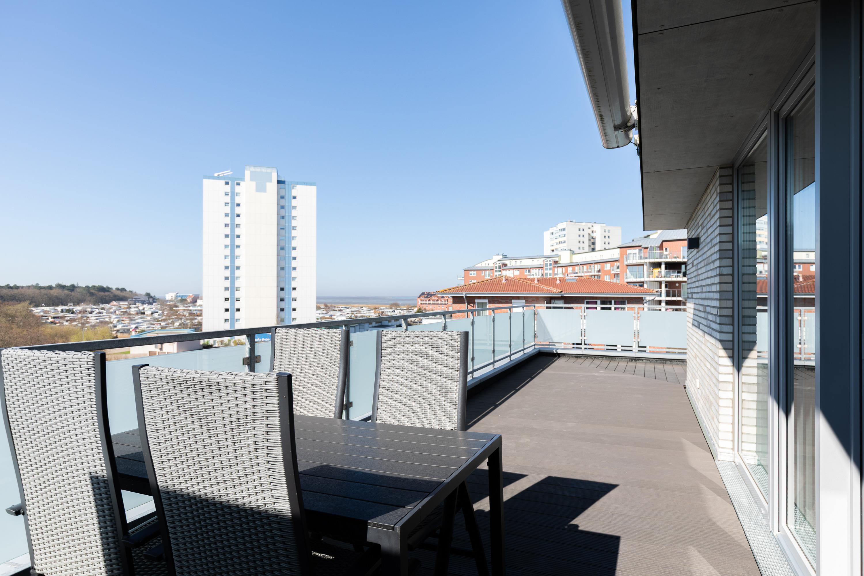 Moderne 3 Zimmer Penthouse Wohnung im 3. Obergeschoss für bis zu 4 Personen, 1 Schlafzimmer mit Doppelbett, TV und Zugang zur großen Dachterrasse, 1 Schlafzimmer mit 2 Einzelbetten, TV und direktem Zugang zur großen Dachterrasse, Wohnzimmer mit Blick Richtung Werner Wald und Nordsee (teil. Seesicht), Einbauküche (Backofen, Cerankochfeld, Mikrowelle, Kaffeemaschine, Wasserkocher, Toaster, Geschirrspüler), gemütlicher Sitzecke mit Ecksofa, Essplatz, TV und Zugang zur großen Dachterrasse, gegenüber der Schlafzimmer befindet sich ein begehbarer Kleiderschrank mit genug Stauraum für Ihr Gepäck im Urlaub, Bad mit 2 Waschbecken, Dusche, WC, Zugang zur gr0ßen Dachterrasse und eigener Sauna (kostenfrei), Gäste WC, Abstellraum mit Waschmaschine und Trockner (beides kostenfrei), große Dachterrasse mit Blick auf den Wernerwald und Teilseeblick auf die Nordsee, Fahrstuhl im Haus, reservierter PKW Stellplatz, Tiefgarage, Nichtraucherwohnung.