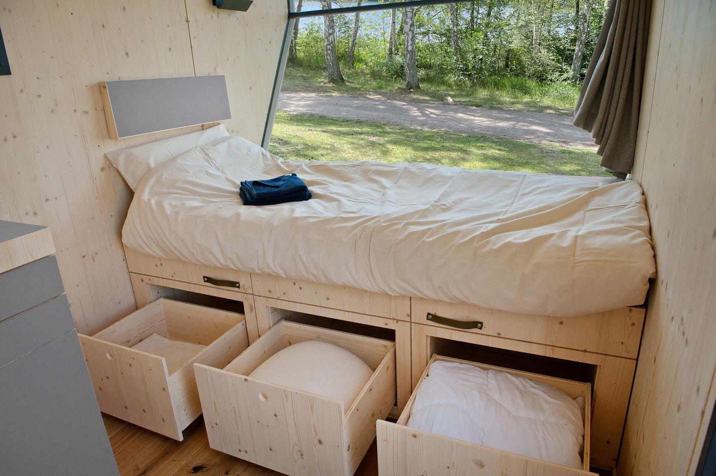 Die neuen Green Tiny Sleep Spaces sind ideal geeignet für Fahrradfahrer, Wanderer und andere Naturliebhaber, die nach einer nachhaltigen und stilvollen Übernachtungsmöglichkeit suchen. Auf fünf Quadratmetern findest du alles, was du für einen Kurzaufenthalt benötigst: ein komfortables Bett für zwei Personen, eine Kochnische mit Waschbecken und ausreichend Staumöglichkeiten. Duschen und Toiletten findest du in den Waschräumen des Campingplatzes. Die kleinen Geschwister der Green Tiny Houses vom Typ Pioneer werden ebenfalls in Schleswig-Holstein gebaut und bestehen ausschließlich aus wohngesunden Materialien. Außerdem bieten wir dir eine klimaneutrale Übernachtung dank Kompensation aller anfallenden CO2-Emissionen.