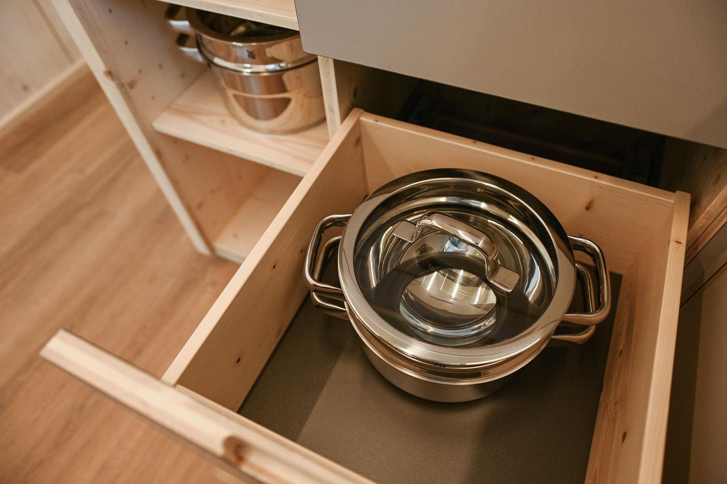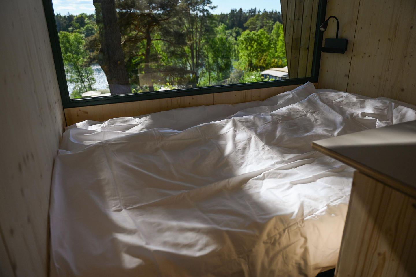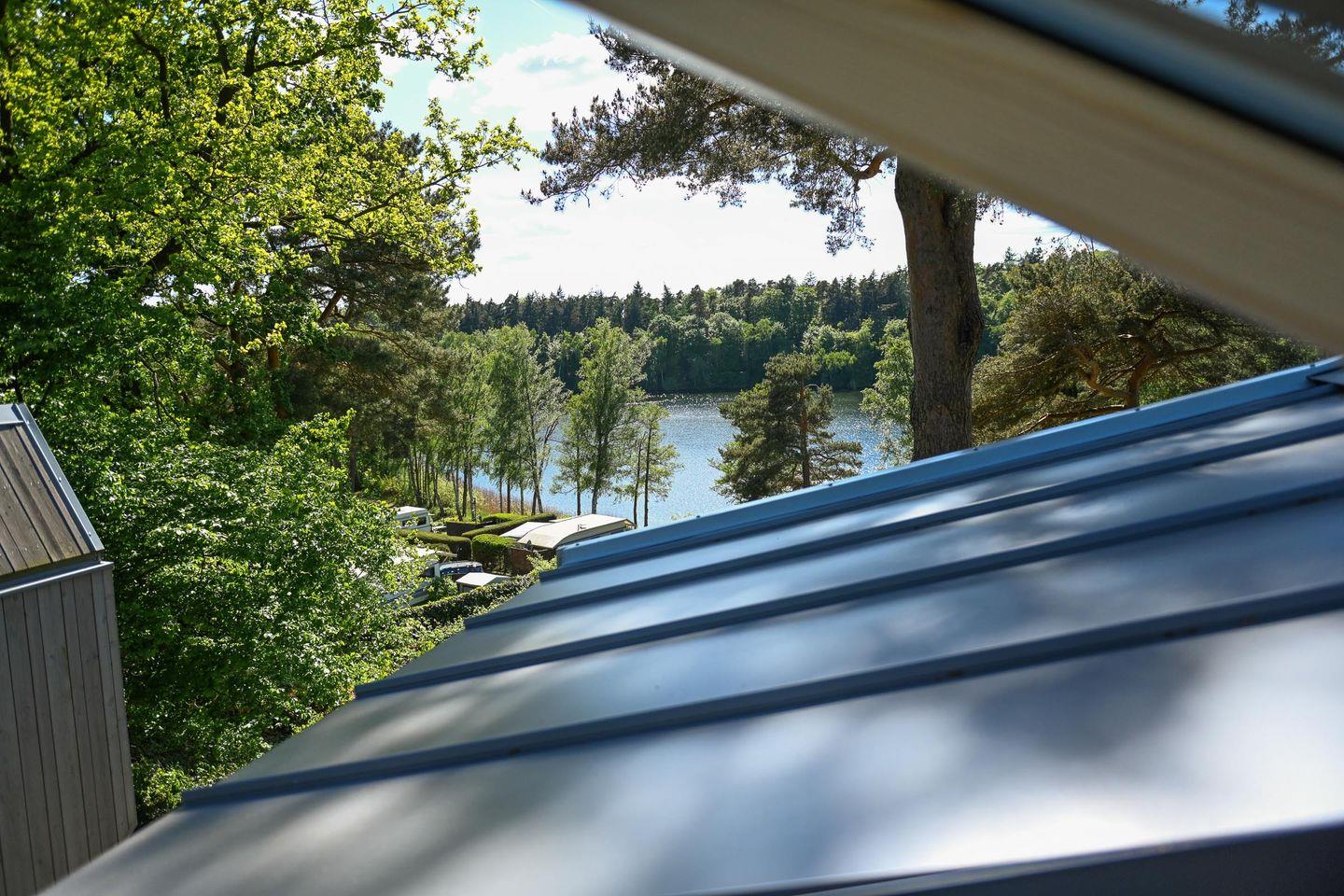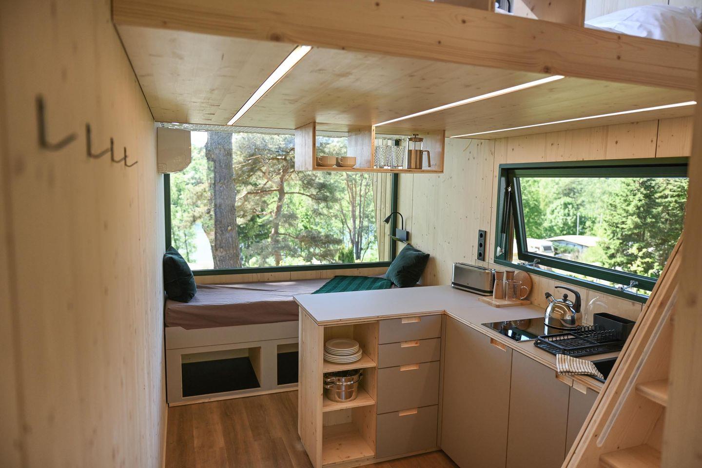 Direkt daneben liegt die kompakte, gut ausgestattete Küche in L-Form mit zwei Induktionsfeldern, einem klappbaren Fenster zur Terrasse und einem kleinen Tresen für entspannte Kochsessions. French Press, Toaster, Flötenkessel, Geschirr, Besteck, Töpfe, Pfanne und viele kleine Details wie Salz, Pfeffer, Spülmittel oder Schneidebrett machen das Kochen unkompliziert und angenehm. Über eine kleine Treppe erreichst du die Schlafebene mit einem 1,40?m breiten Bett, Dachfenster, Verdunklungsmöglichkeiten und einem Ausblick, der auch hier den See in Szene setzt. Das absolute Highlight: Vom Bett aus gelangst du direkt auf ein luftiges Relax-Netz, das über dem Wohnbereich schwebt – ein besonderes Erlebnis für bis zu zwei Personen.