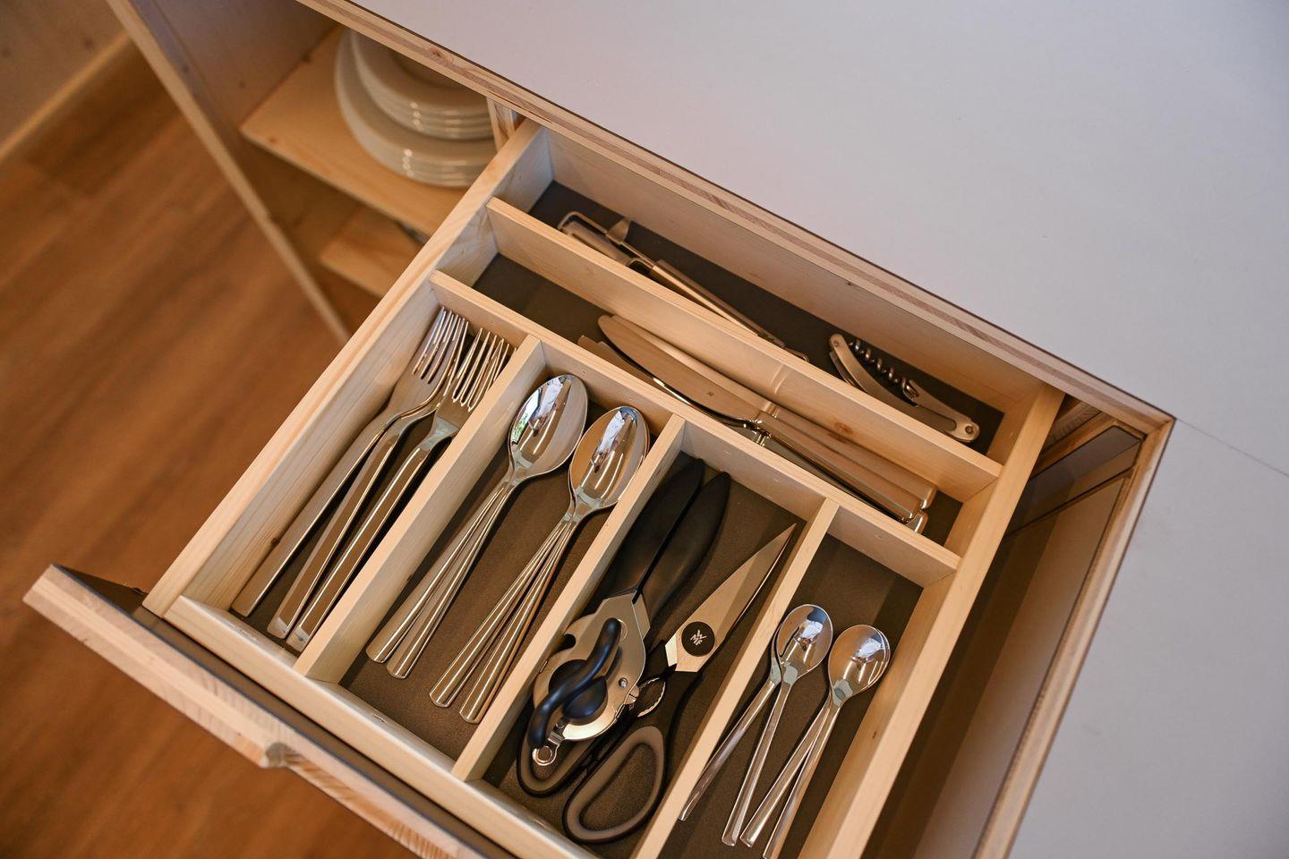 Mit einer Grundfläche von 20 Quadratmetern innen und zusätzlichen 20 Quadratmetern Terrasse in L-Form bietet das Tiny House überraschend viel Platz – ideal für Paare, kleine Familien, Freund*innen oder Alleinreisende. Die Terrasse ist möbliert mit einem Tisch und vier Stühlen, perfekt für ein gemeinsames Frühstück in der Morgensonne oder einen langen Sommerabend mit Blick auf den See. Innen findest du ein durchdachtes Wohnkonzept mit vielen cleveren Staufächern, einem hochwertigen Holzfußboden und einer hochwertigen Ausstattung. Im Zentrum des offenen Wohnraums steht ein großes Panoramafenster, das nicht nur den Blick freigibt, sondern auch Licht und Natur ins Haus holt. Das gemütliche Sofa davor lässt sich zum 1,40?m breiten Day Bed ausziehen und dient so als Schlafplatz für zwei zusätzliche Gäste.