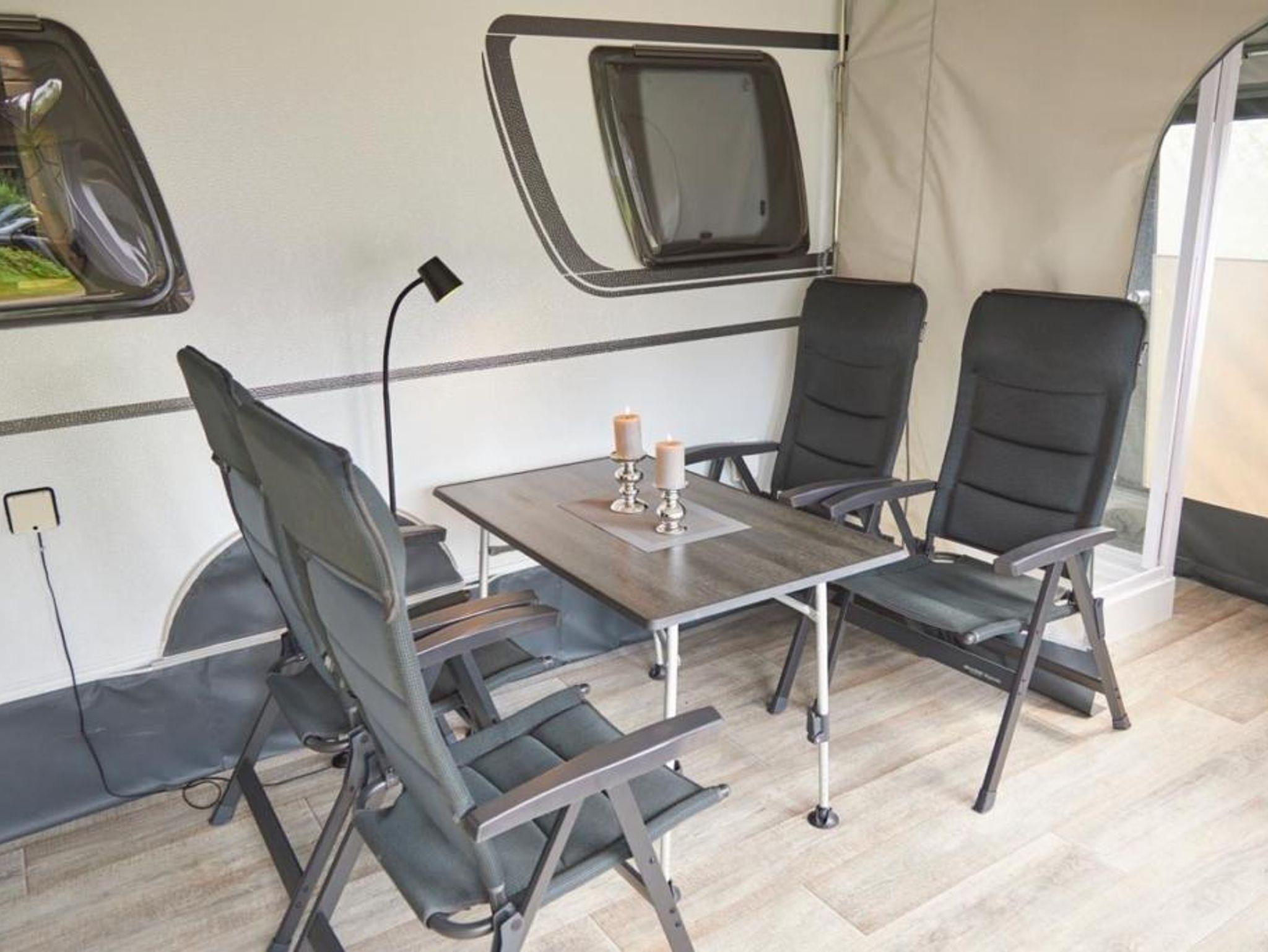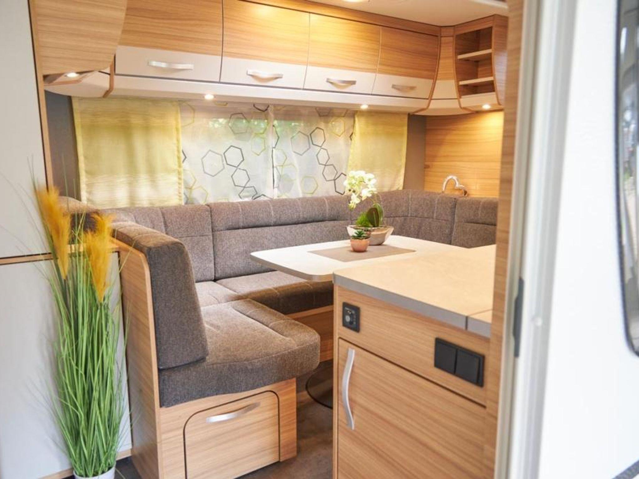 für vier Personen vollständig ausgestatteter Wohnwagen mit einer Sitzgruppe, TV, einer kleinen Küchenzeile inkl. Kühlschrank und Kochfeld. Kochgeschirr, Besteck und Teller sind vorhanden.