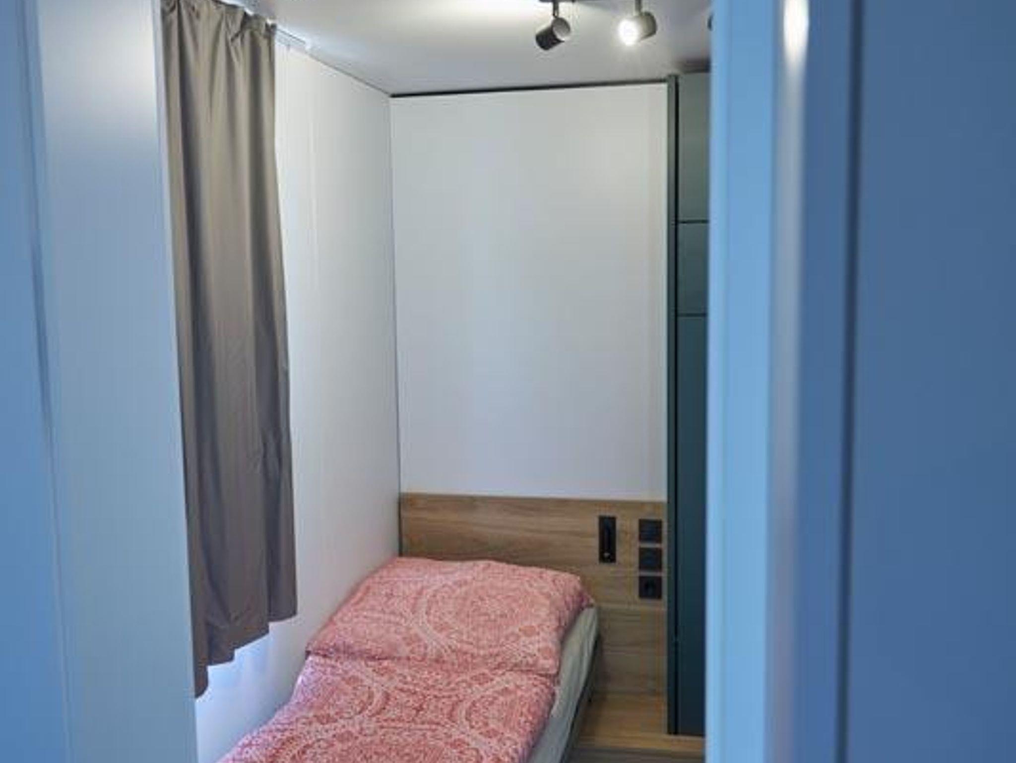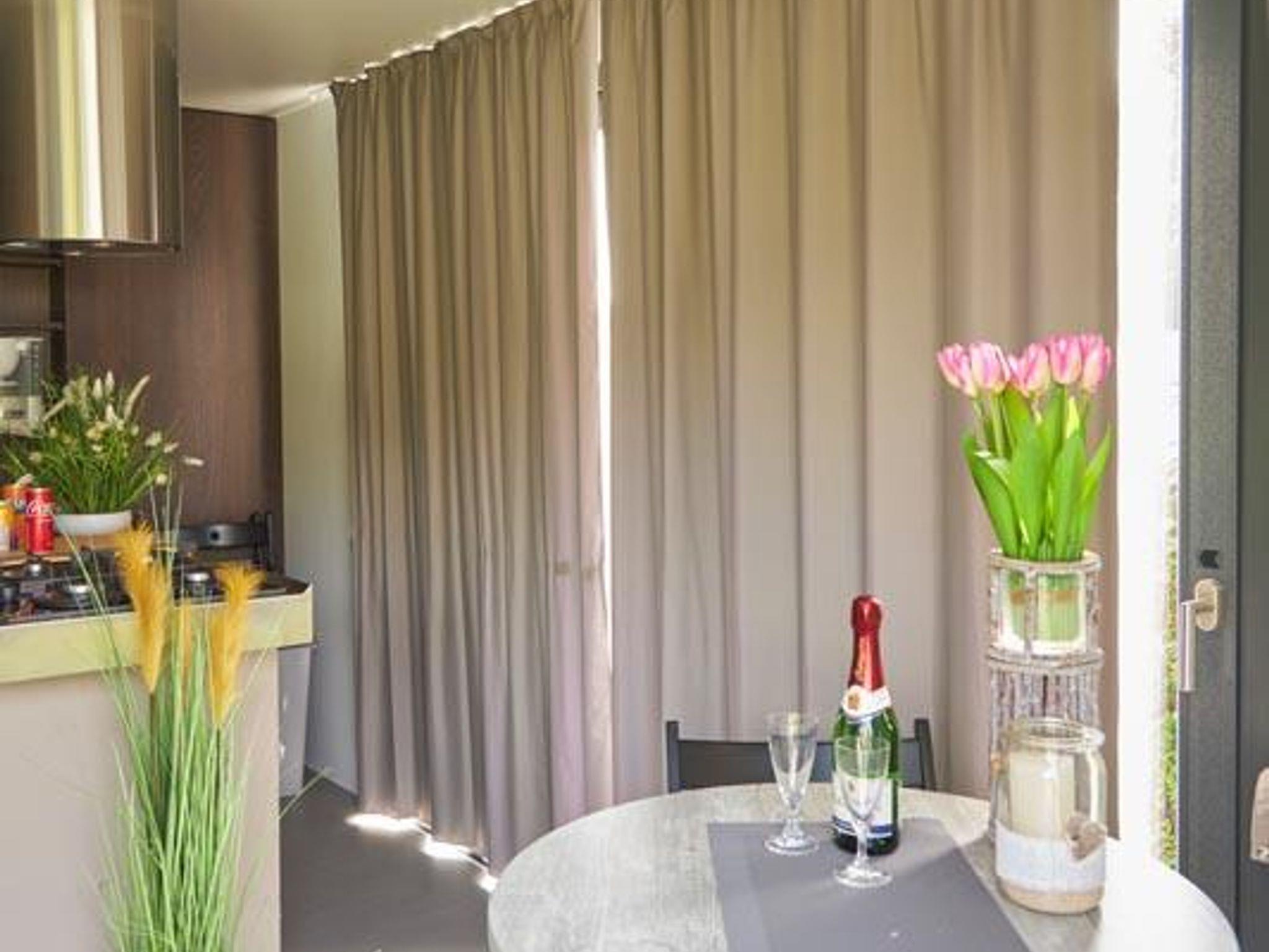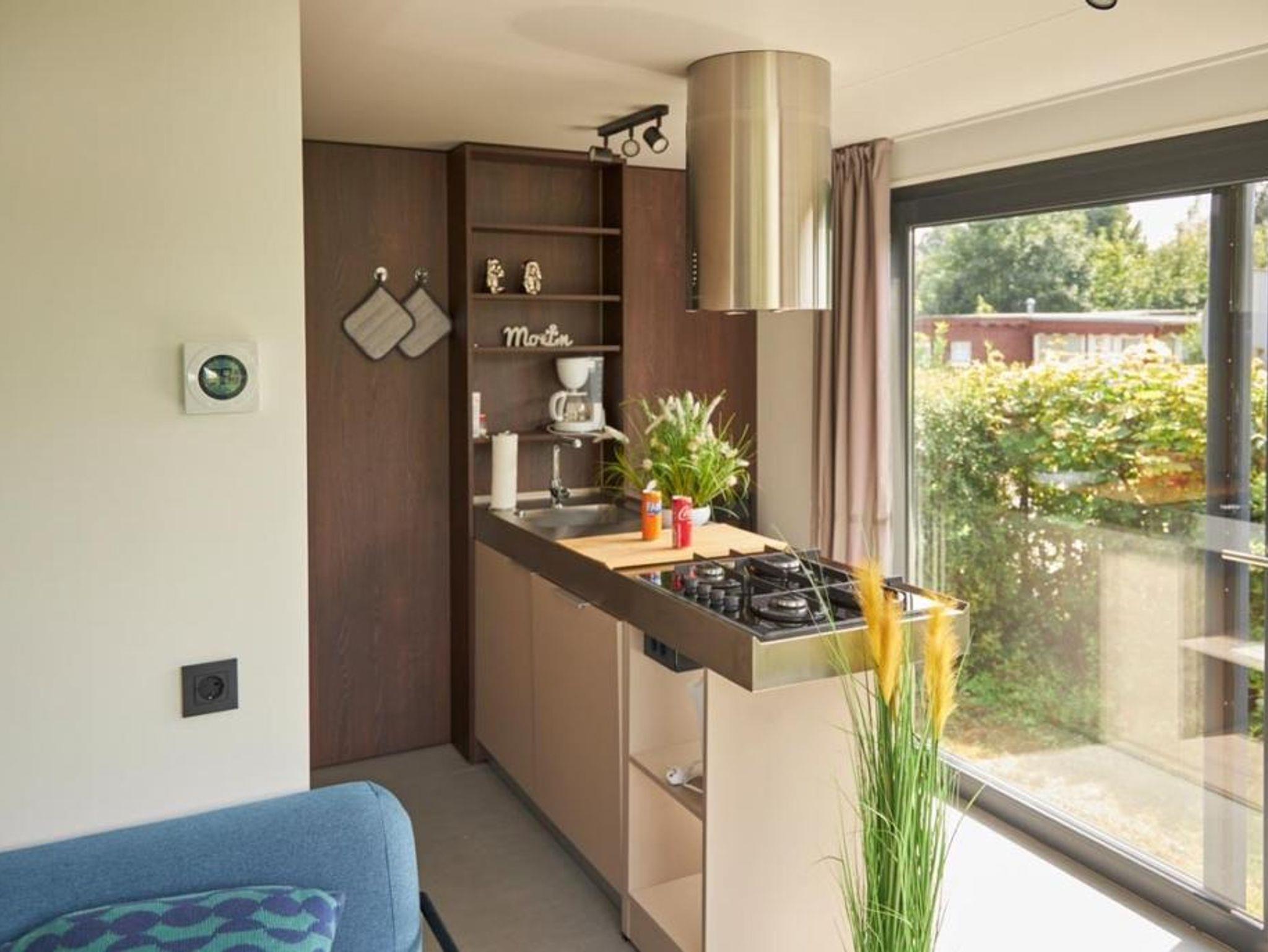 Das Mobilheim von Adria bietet einen luxuriösen Rückzugsort für bis zu 4 Personen und vereint Komfort und Stil auf gekonnt moderne Weise. Das Interieur ist elegant gestaltet und überzeugt mit hochwertigen Materialien und zeitgemäßen Annehmlichkeiten. Es verfügt über ein geräumiges Wohnzimmer mit gemütlichen Sitzmöglichkeiten und einem Flachbildfernseher sowie eine voll ausgestattete Küche mit modernen Geräten inklusive eines Geschirrspülers. Das Mobilheim bietet zwei Schlafzimmer, darunter ein Hauptschlafzimmer mit einem komfortablen Doppelbett und ein weiteres Zimmer mit zwei Einzelbetten, die bei Bedarf in den Wänden verschwinden können. Diese innovative Raumlösung schafft zusätzlichen Platz und Flexibilität, um den Wohnraum nach Belieben zu nutzen. Das Badezimmer ist modern gestaltet und bietet eine Dusche. Erleben Sie einen unvergesslichen Aufenthalt im Mobilheim „Adria“, wo Luxus, Komfort und kreative Raumgestaltung nahtlos miteinander verschmelzen.
