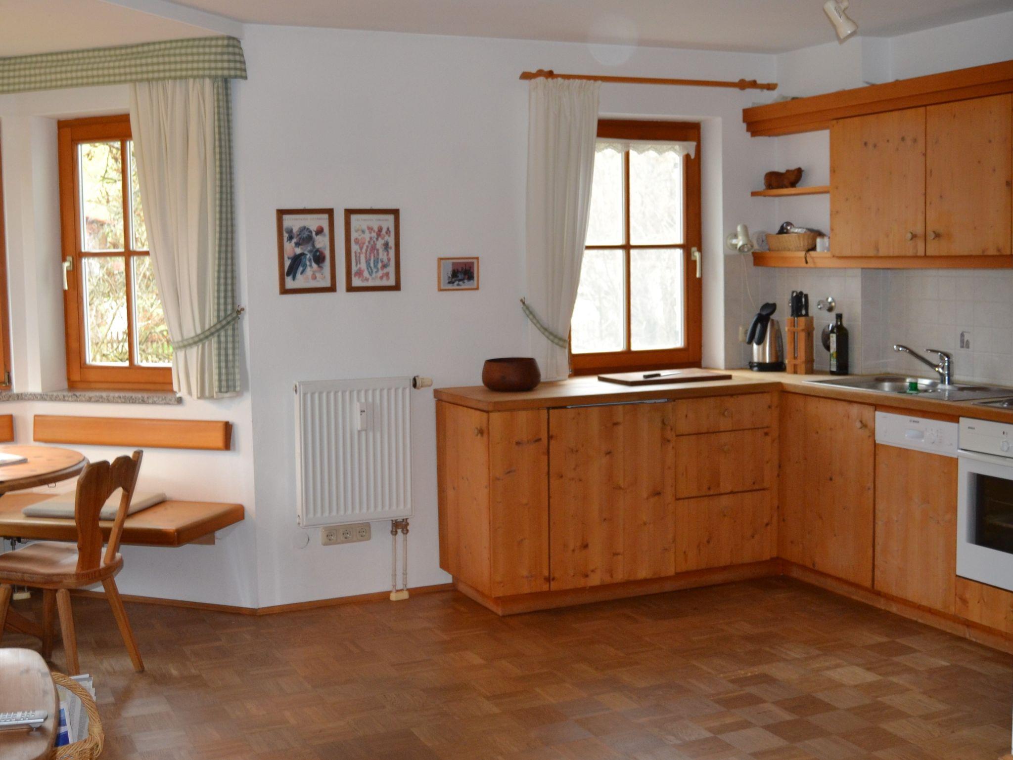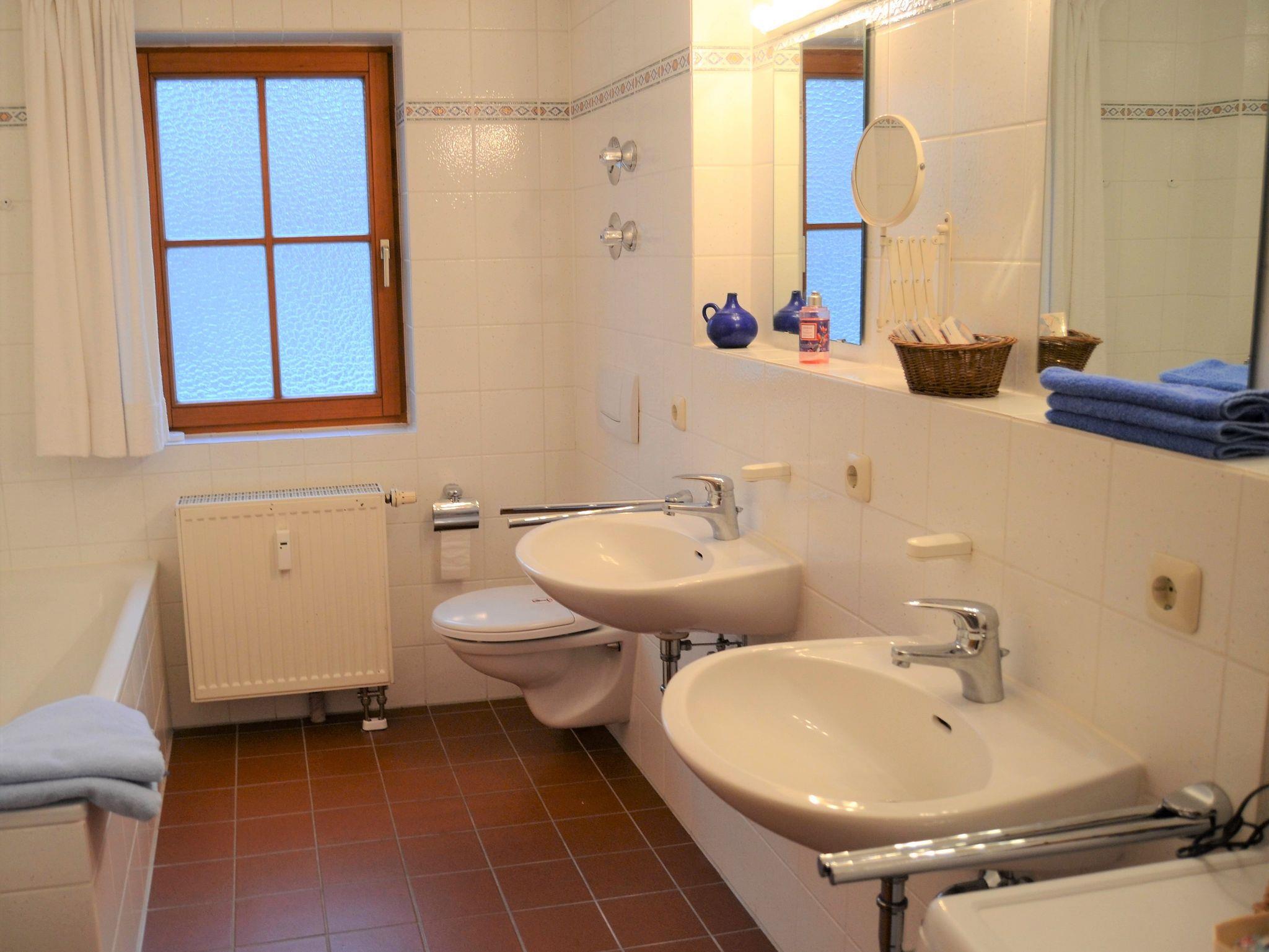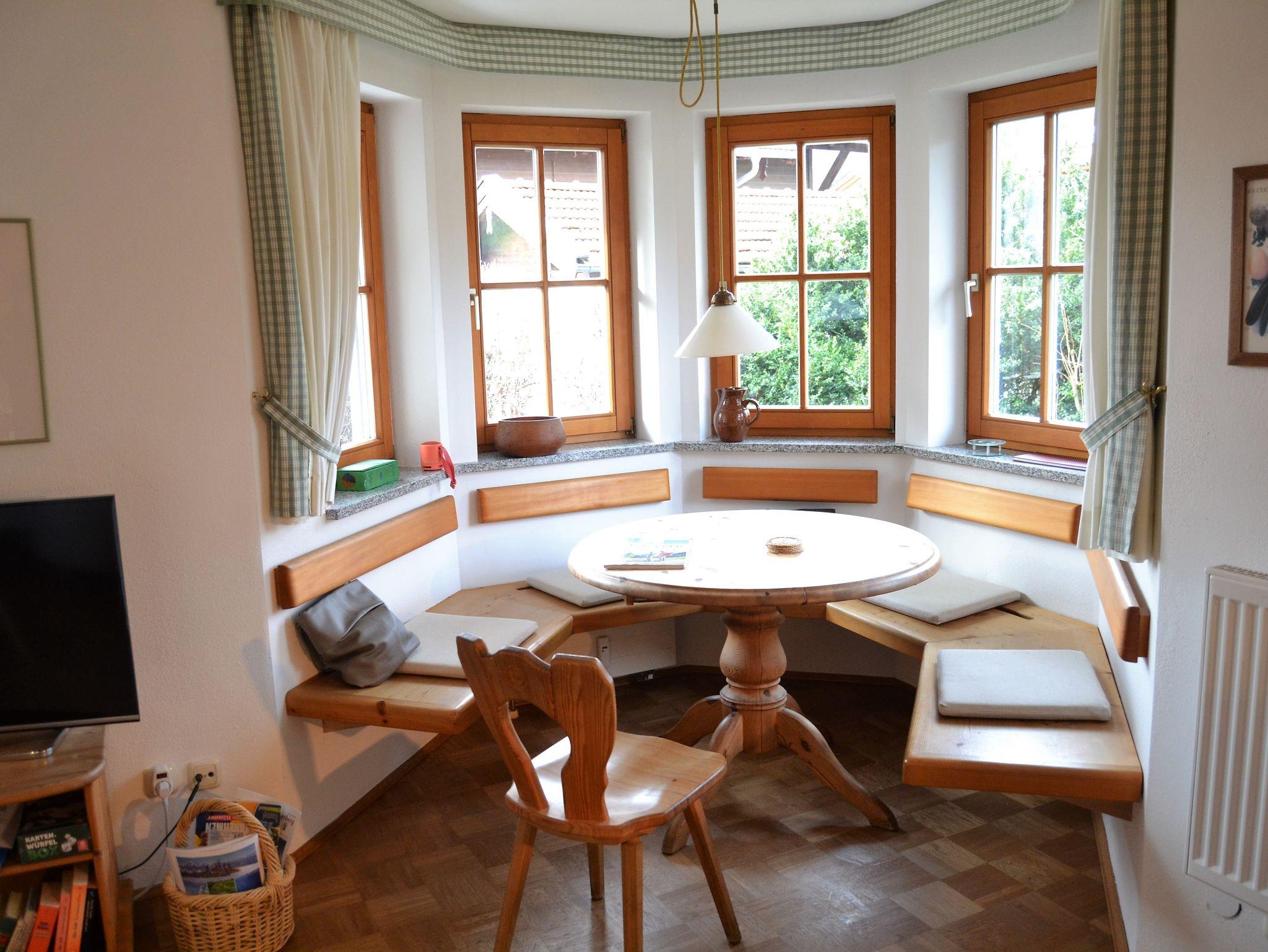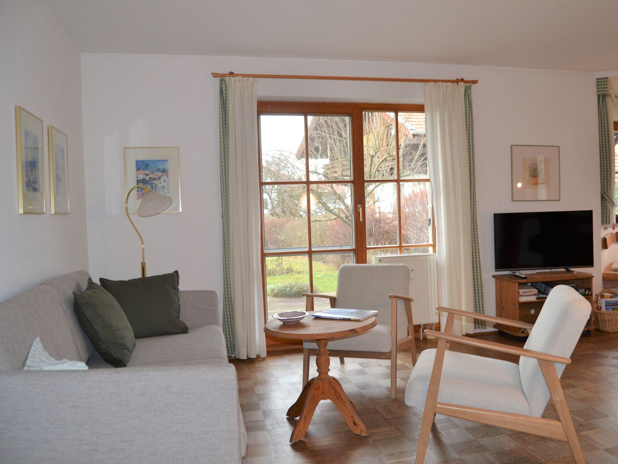 Die Ferienwohnung verfügt über eine gehobene Ausstattung und ist liebevoll eingerichtet. Im Mittelpunkt steht der große Wohnraum mit integrierter Küchenzeile und einem gemütlichen Essplatz im Erker auf der einen Seite sowie einem Wohnzimmerbereich mit Sofa und Sesseln auf der anderen. Hier liegt auch der Zugang zur Terrasse mit Gartenmöbeln und Liegestühlen. Die Küche ist vollständig ausgestattet mit Spülmaschine, Kühlschrank mit Eisfach, Herd mit 4 Kochplatten und Backofen, Kaffeemaschine, Wasserkocher, Toaster. Im großen Wohnzimmerbereich finden Sie einen Sat-TV, eine CD Anlage, eine kleine Bibliothek und Spielesammlung. Im Schlafzimmer stehen ein Doppelbett, 2 Nachtschränke und ein großer 5-türiger Schrank im bayerischen Landhausstil. Im 2. Schlafzimmer finden Sie ein Einzelbett, einen Sekretär sowie eine Kommode. Im Badezimmer mit separater Duschkabine, Badewanne und 2 Waschbecken steht auch eine Waschmaschine zur Verfügung.
