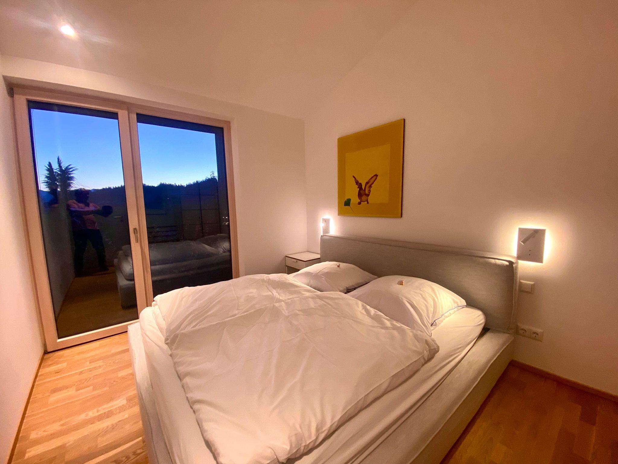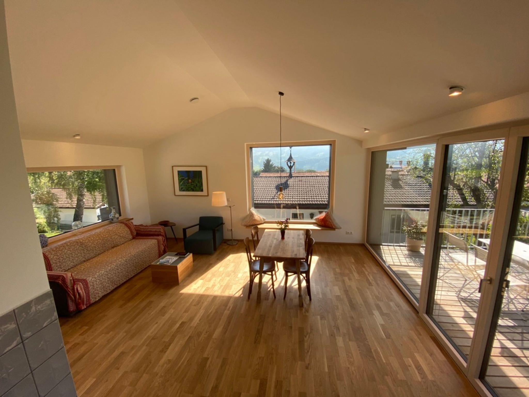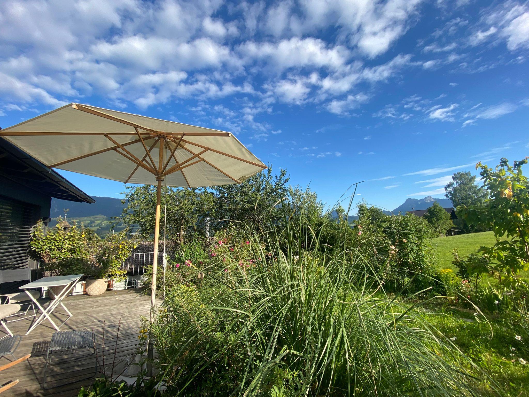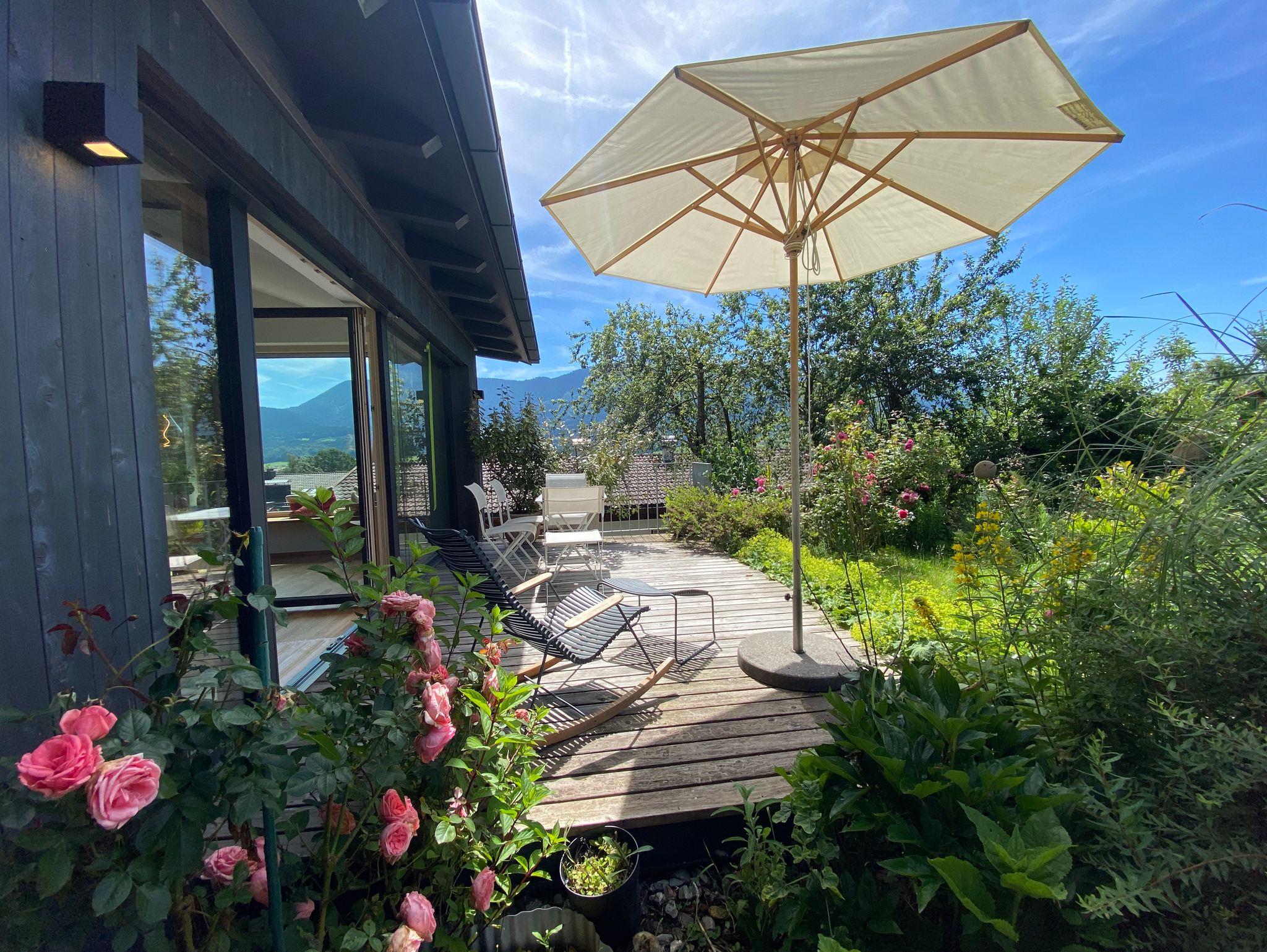 Einzigartige Lage mit unverbaubaren Bergpanoramablick, eigenem Garten, Schreinermöbeln, viele Rad-und Wanderwege vor der Haustüre. Ladestation für E-Autos und E-Bikes mit eigenem Solarstrom. Hochwertige Ausstattung ( Schreinerküche mit Spülmaschine Fussbodenheizung im Bad, Eichenparkett). Panoramafenster nach Osten, Süden, Westen. Die Wohnung ist mit Schreinermöbel und Designermöbel ausgestattet. Das energieeffiziente Haus ist aus heimischen Hölzern und komplett schadstofffrei.