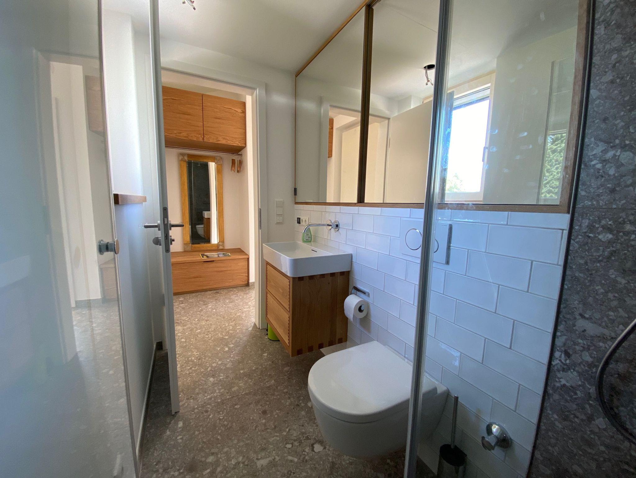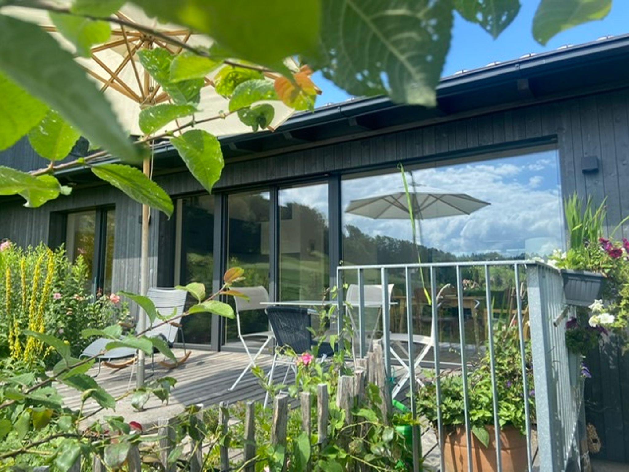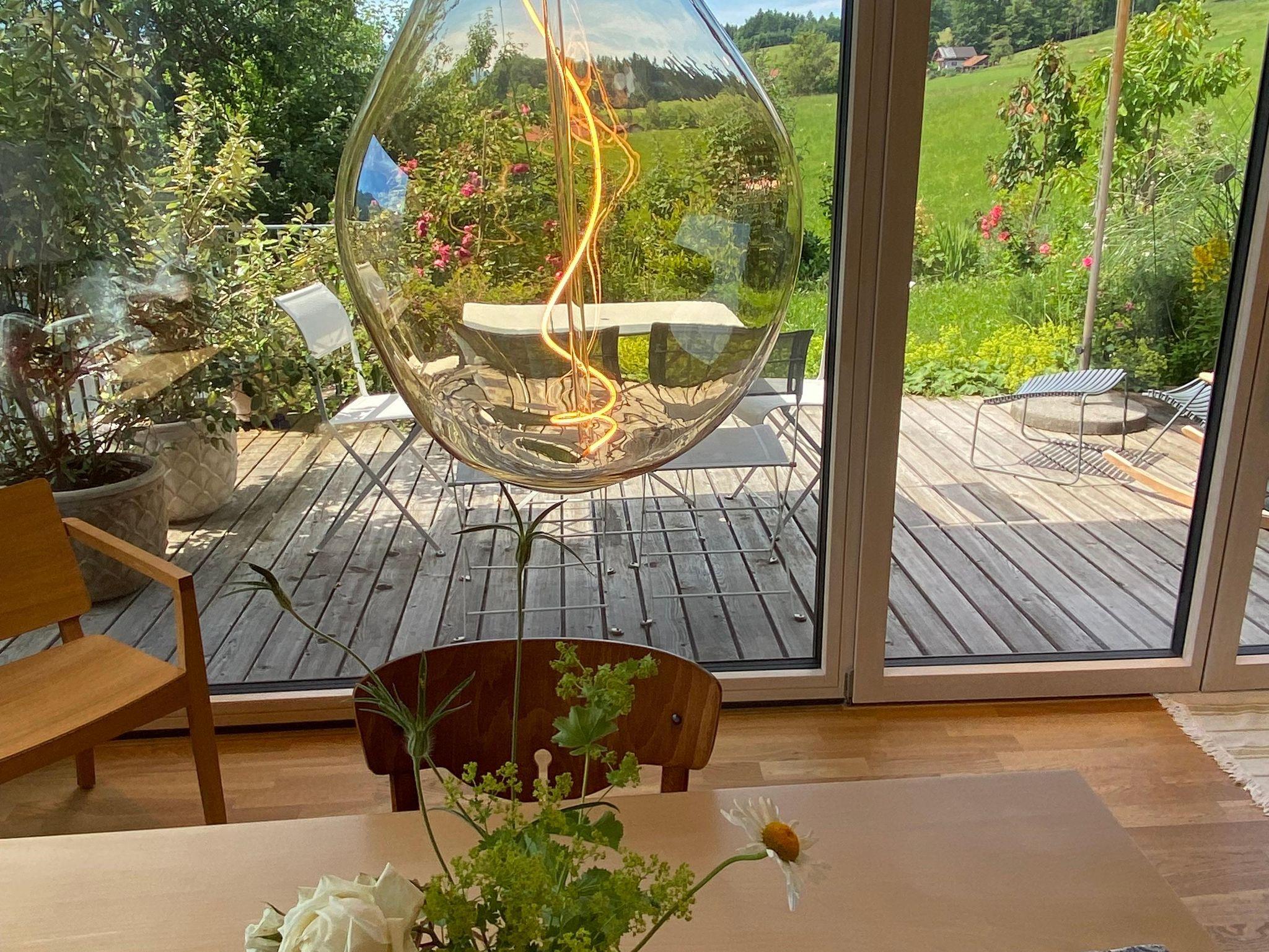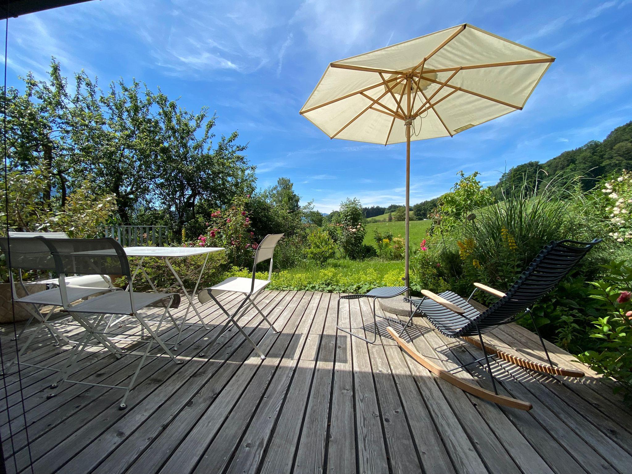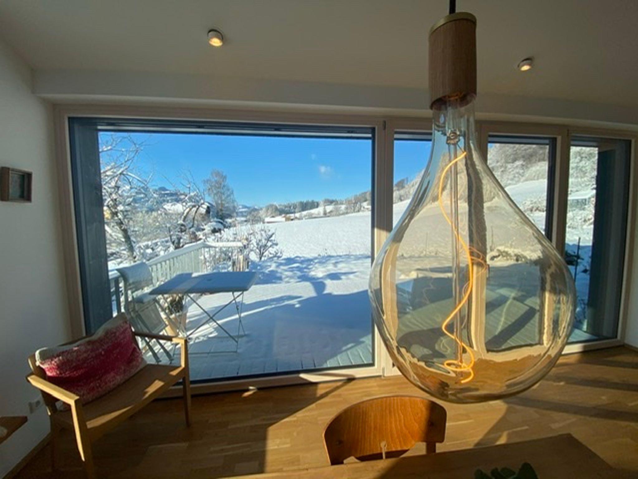 Einzigartige Lage mit unverbaubaren Bergpanoramablick, eigenem Garten, Schreinermöbeln, viele Rad-und Wanderwege vor der Haustüre. Ladestation für E-Autos und E-Bikes mit eigenem Solarstrom. Hochwertige Ausstattung ( Schreinerküche mit Spülmaschine Fussbodenheizung im Bad, Eichenparkett). Panoramafenster nach Osten, Süden, Westen. Die Wohnung ist mit Schreinermöbel und Designermöbel ausgestattet. Das energieeffiziente Haus ist aus heimischen Hölzern und komplett schadstofffrei.