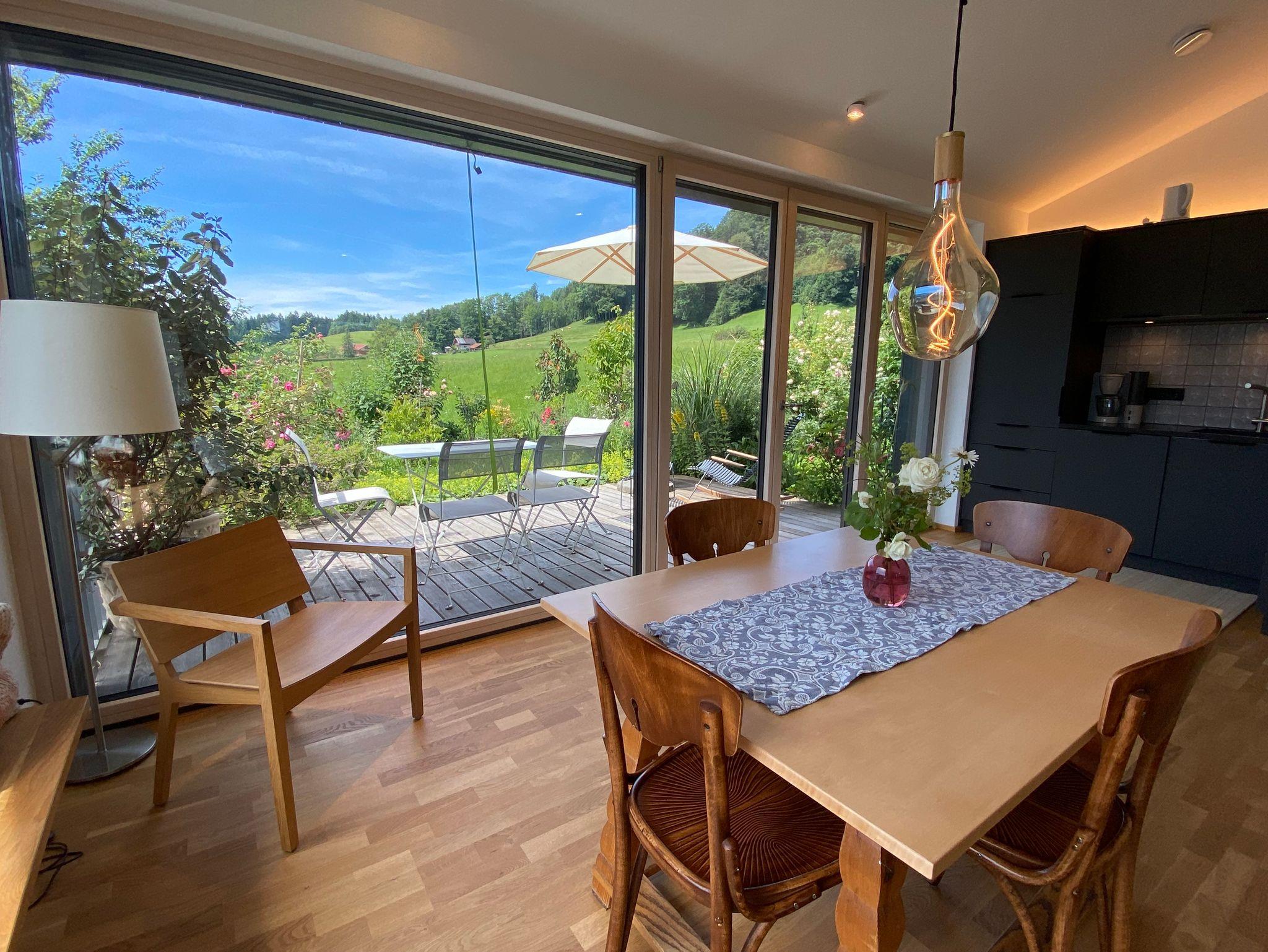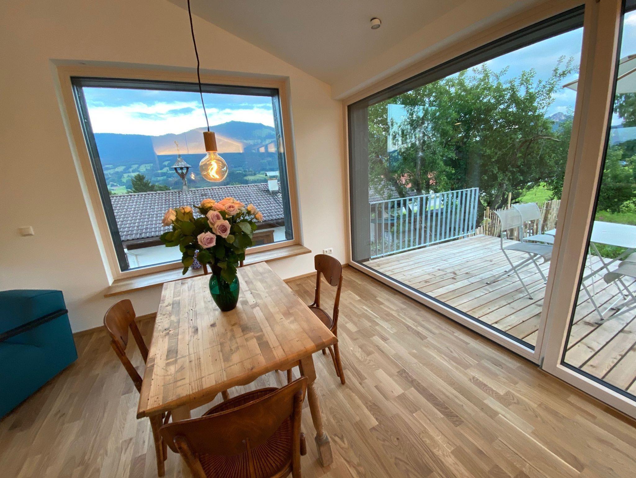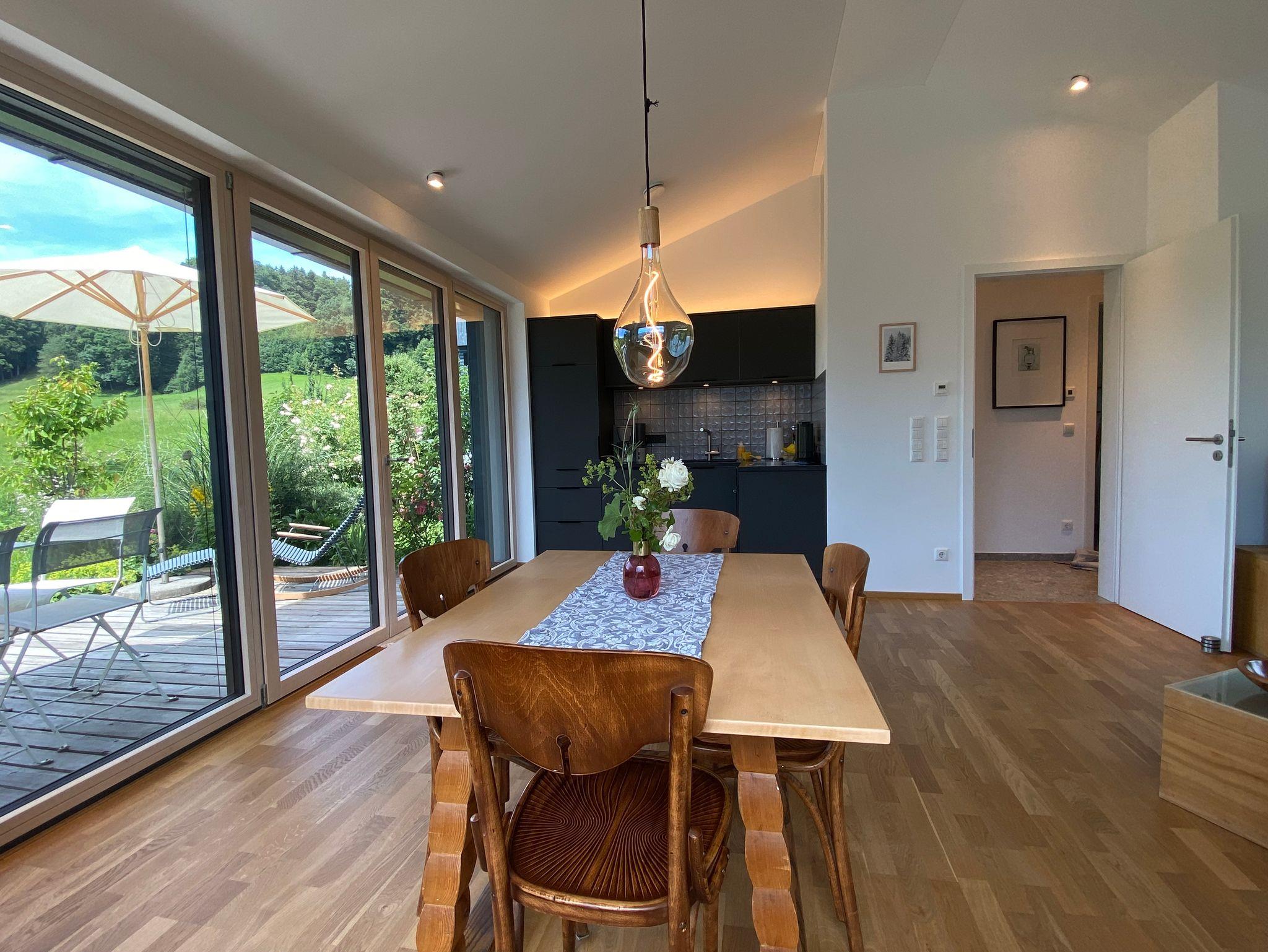 Im Juli 2020 wurde unser Ferienhaus im Archtiktenstil in Holzständerbauweise mit heimischen Hölzern fertiggestellt. Ökologische Holzhäuser sind frei von Giftstoffen und für Allergiker besonders geeignet. Das lichtdurchflutete 2-Zimmer Haus mit über 60 qm und eigener Terrasse und Garten mit alten Obstbäumen liegt absolut ruhig und uneinsehbar am westlichen Dorfrand von Törwang mit Blick auf die Hochries, den Heuberg und ins Inntal. Das Haus hat ein Schlafzimmer mit traumhaften Heuberg-Blick (Bett 180 x 200 cm), ein Bad mit Dusche / WC (und Fußbodenheizung) und einem großen Wohnraum mit ausziehbarer Couch (mit hochwertiger Federkernmatratze) auf der bequem 2 weitere Personen übernachten können, Designerküchenzeile und großen Panorama-Fenstern nach Osten, Süden & Westen. Elektrische Jalousien sind an allen Fenster vorhanden. Das Haus liegt in einer Sackgasse, abgesehen von einem Traktor, der mal vorbeifährt, gibt es so gut wie keinen Verkehr und somit absolut ruhig. Auf der großen Terrasse, die uneinsehbar ist, haben wir Liegen, Stühle, einen Tisch und Sonnenschirm und Sie können die vielen Vögel und die wunderbare Natur beobachten und es ist der perfekte Platz und die Zeit zu vergessen und Kraft zu tanken.