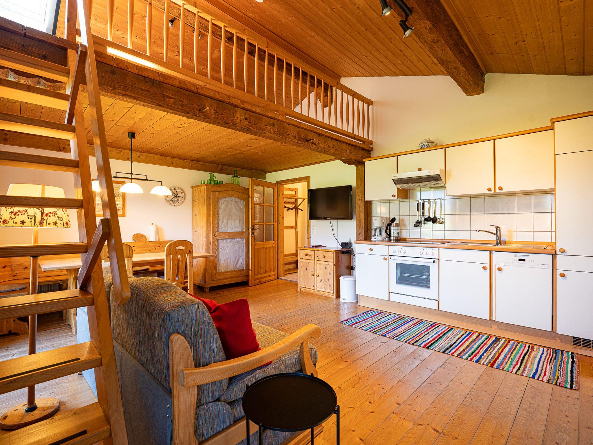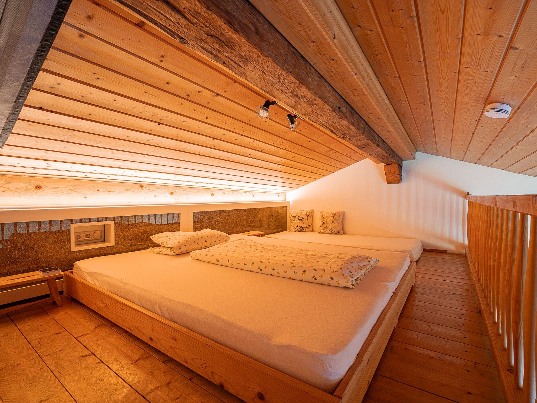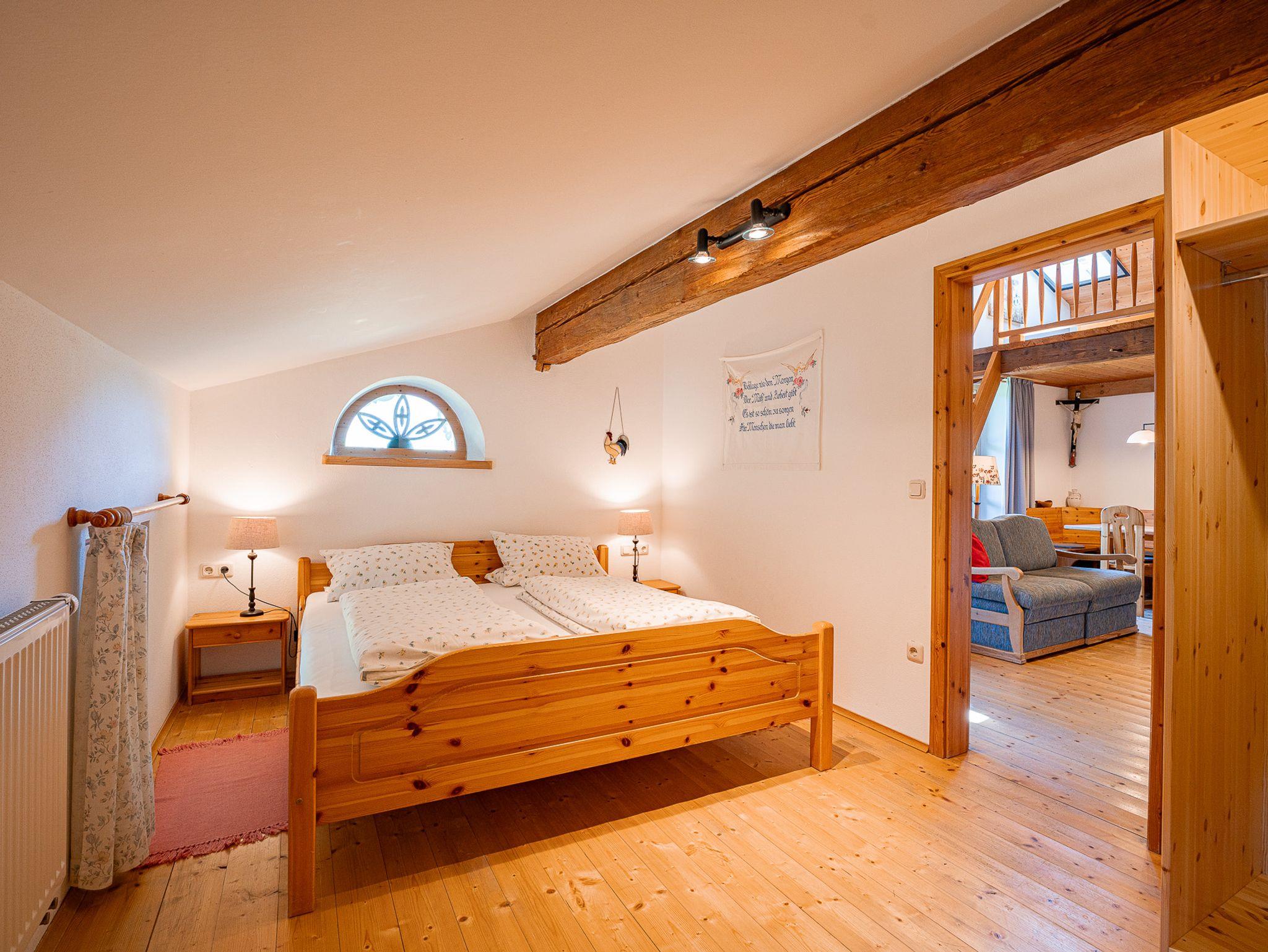 Die Galeriewohnung im 2. OG unseres Hofes erreichen Sie über einen eigenen Eingang. Sie besteht aus einem geräumigen Wohnraum mit Küchenzeile, großen Esstisch und Sofa. Die Wohnung beinhaltet außerdem ein modernes Bad und 2 separate Schlafzimmer. Ein offener Schlafraum mit Doppelbett oben in der Galerie und ein separates Schlafzimmer mit Doppelbett. Eine Besonderheit unserer Galeriewohnung ist der gemütliche Südbalkon mit herrlichen Ausblick auf unser heimisches Bergpanorama.