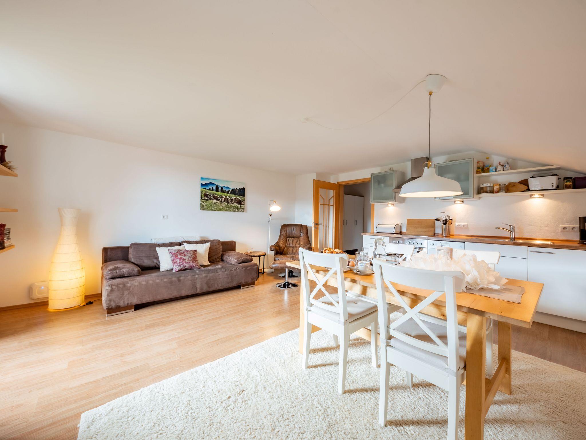Diese moderne Dachgeschosswohnung in unserem Bauernhaus steht Ihnen für bis zu fünf Personen zur Verfügung. Ein großes Schlafzimmer mit Galerie ist mit einem Doppelbett und drei weiteren Schlafmöglichkeiten ausgestattet. Gefrühstückt wird an dem Holztisch im Wohnraum, in dem sich auch die Küchenzeile mit Kochherd, Ofen, Kaffeemaschine, Wasserkocher, Kühlschrank und Geschirrspülmaschine befindet. Für einen gemütlichen Abend sorgt die große Couch, die ausgezogen zu einem Bett umfunktioniert werden kann, oder Sie verbringen den lauen Sommerabend auf dem zur Bergseite ausgerichteten Balkon. Das Bad ist mit einer Dusche und einer Waschmaschine ausgestattet.