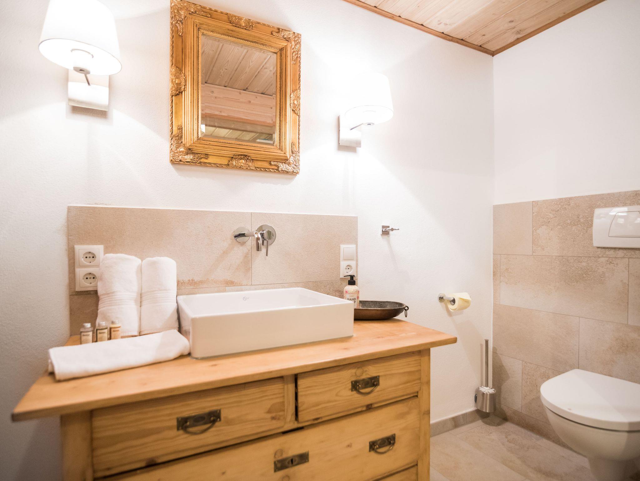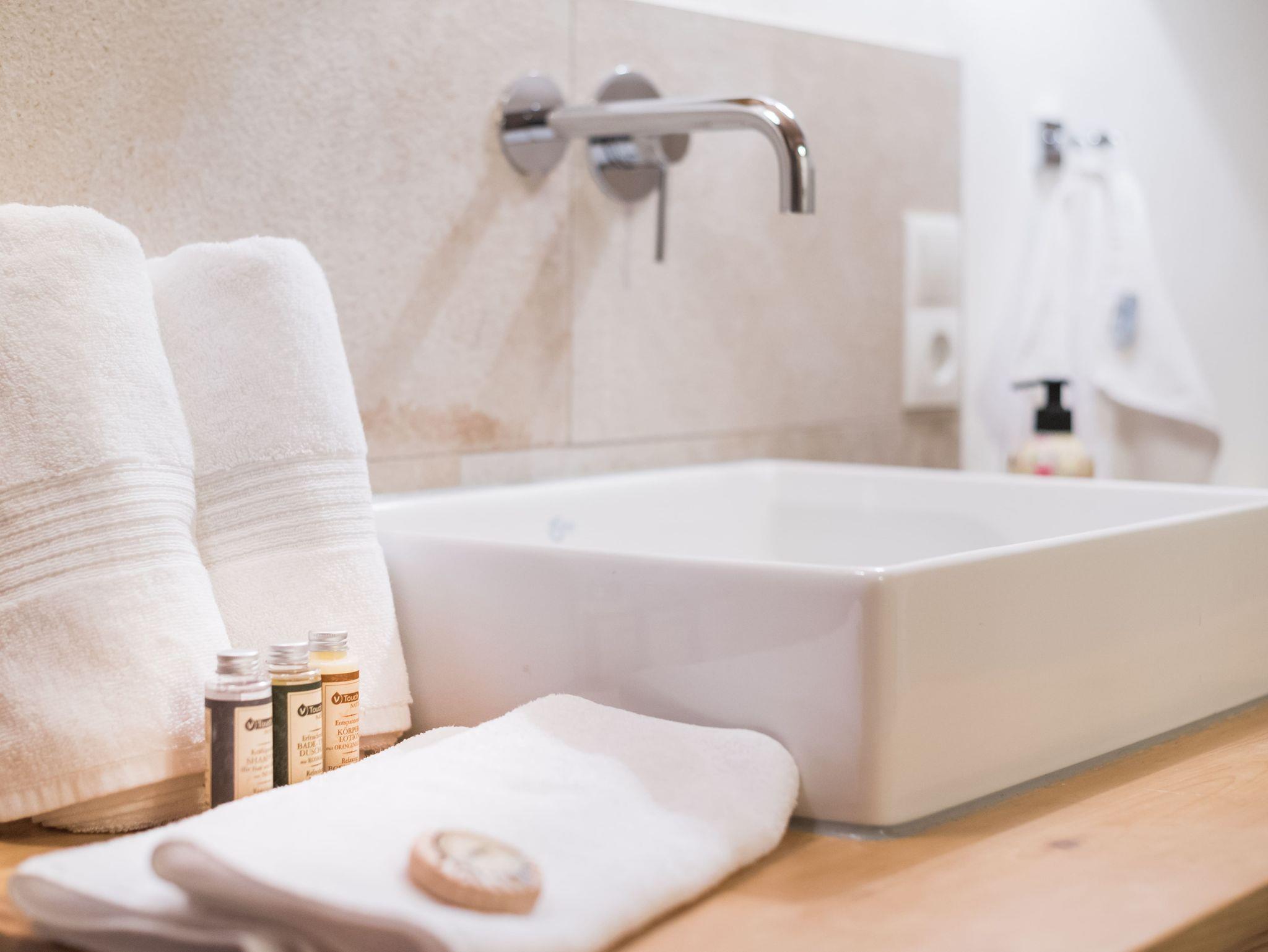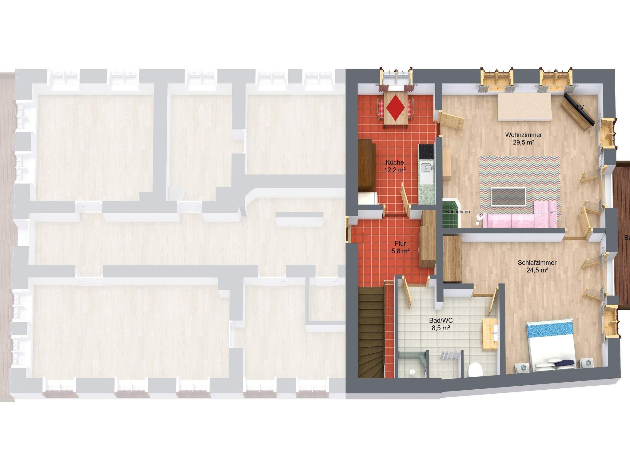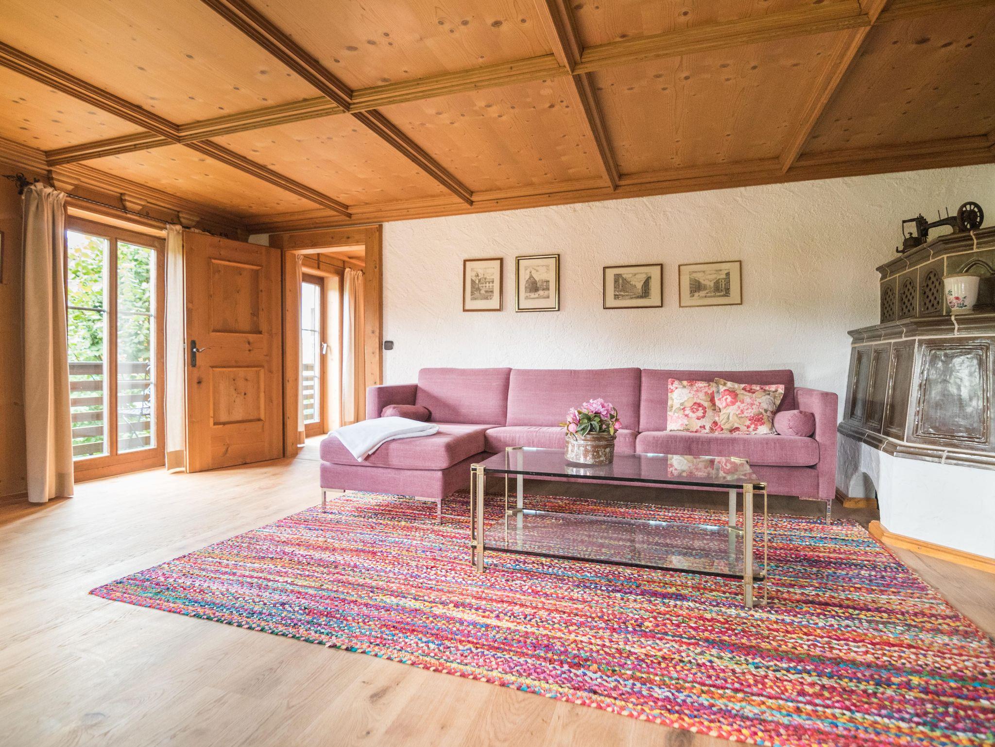 befindet sich im ersten Obergeschoss der hinteren Hälfte des Schusterhäusls. Es verfügt über einen Balkon mit Blick zum Garten, ein Schlafzimmer mit King-Size Bett. Ein luxuriöses Bad in Naturstein inkl. Föhn, Glasdusche und Handtüchern. Darüber hinaus stehen Ihnen eine neue, vollausgestattete Küche mit Altholzdecke inklusive Anrichte und Esstisch zur Verfügung. Das sehr geräumige Wohnzimmer ist teilweise holzvertäfelt. Ein Kachelofen, SMART-TV und einer großen Eckcouch sind hier einige Highlights. Auf Wunsch können wir Ihnen hier noch ein komfortables Bett 180 x 180 cm für 2 weitere Gäste anbieten.