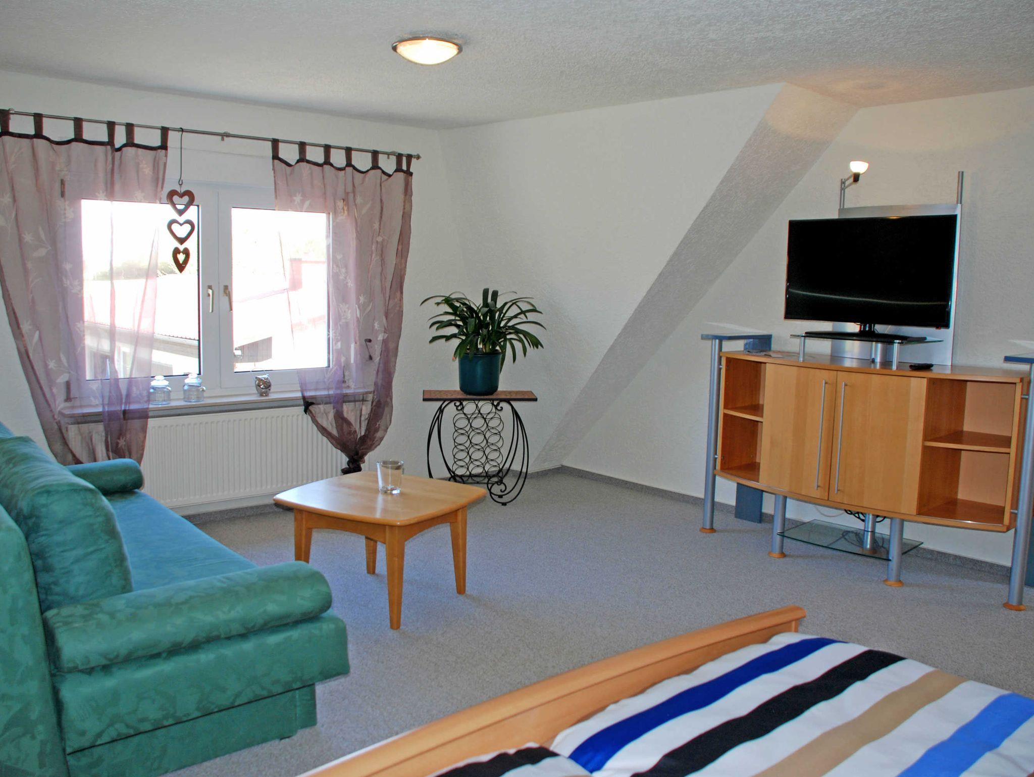 Unsere modern und freundlich eingerichtete Ferienwohnung im Obergeschoss (60 m²) bietet Platz für bis zu maximal 4 Gäste. Im 30m² großen Wohn-/Schlafraum mit Flachbild TV steht ein Doppelbett und eine Couch für Sie zur Verfügung. Separat gibt es zusätzlich eine Doppelschlafcouch.