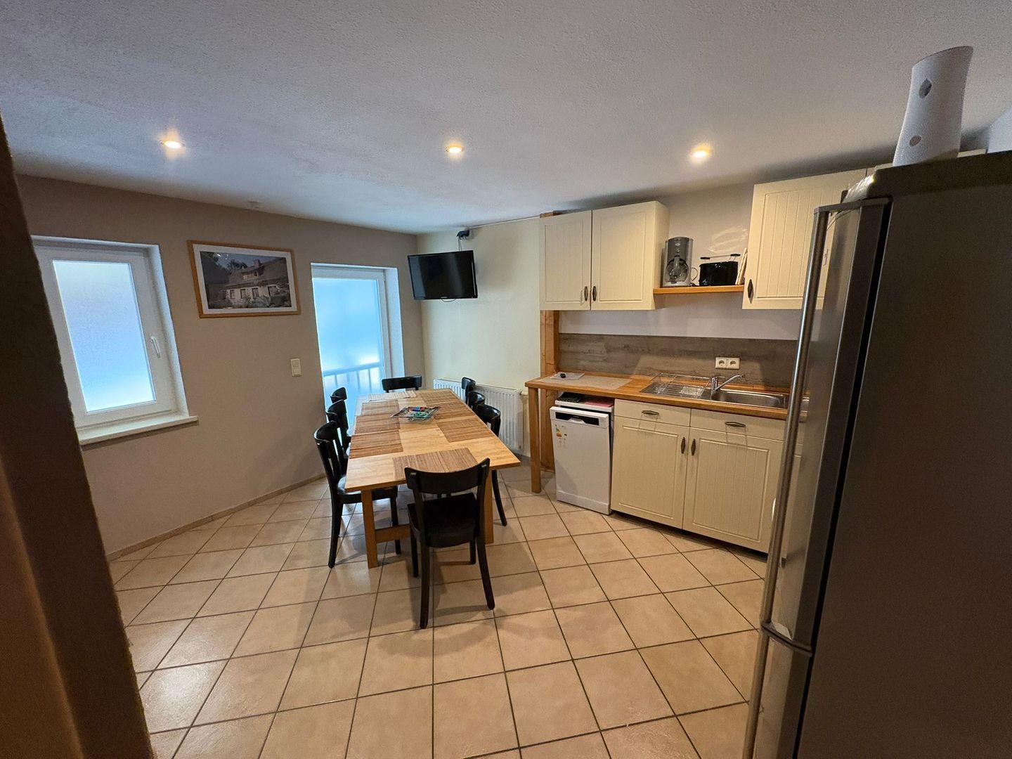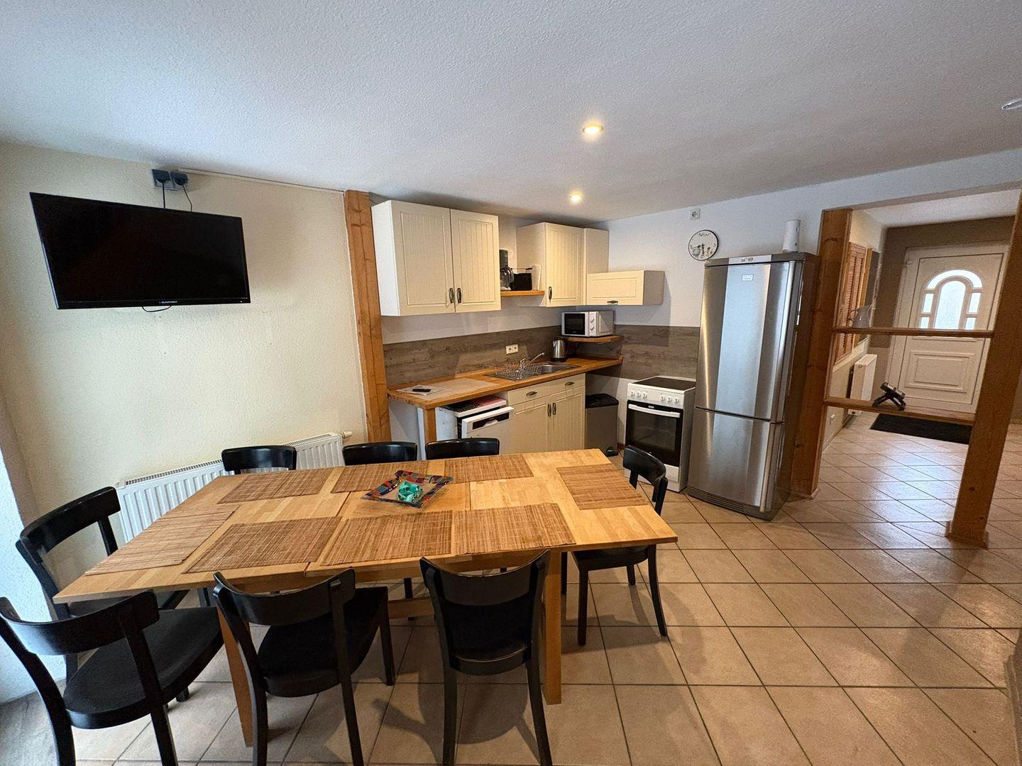 Die abgeschlossene Küche mit eigenem Esstisch ist umfassend ausgestattet und lässt kaum Wünsche offen: Ceranherd mit Elektro-Backofen, Mikrowelle, Kühlschrank, extra Gefrierschrank, Spülmaschine, Kaffeemaschine, Wasserkocher sowie allerlei Küchenutensilien, Geschirr und Besteck stehen zur Verfügung. So wird das Kochen und Genießen im Kreis Ihrer Liebsten zu einem Vergnügen. Für Familien mit Babys gibt es entsprechende Möglichkeiten, und die Nutzung einer eigenen Waschmaschine sorgt für zusätzlichen Komfort auch bei längeren Aufenthalten.