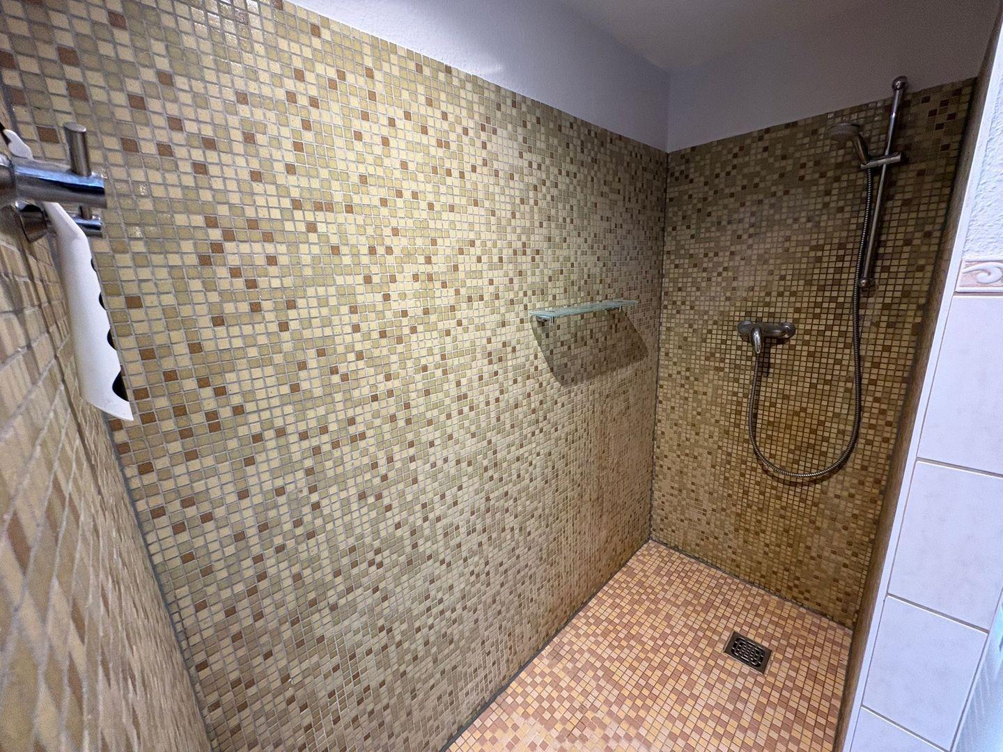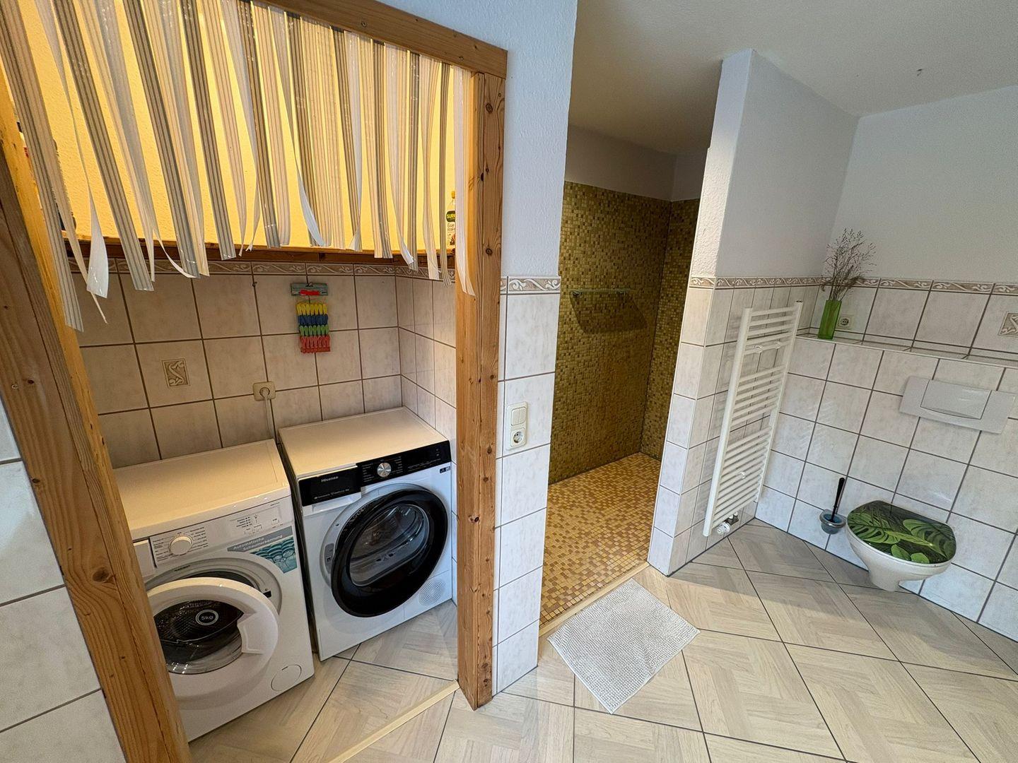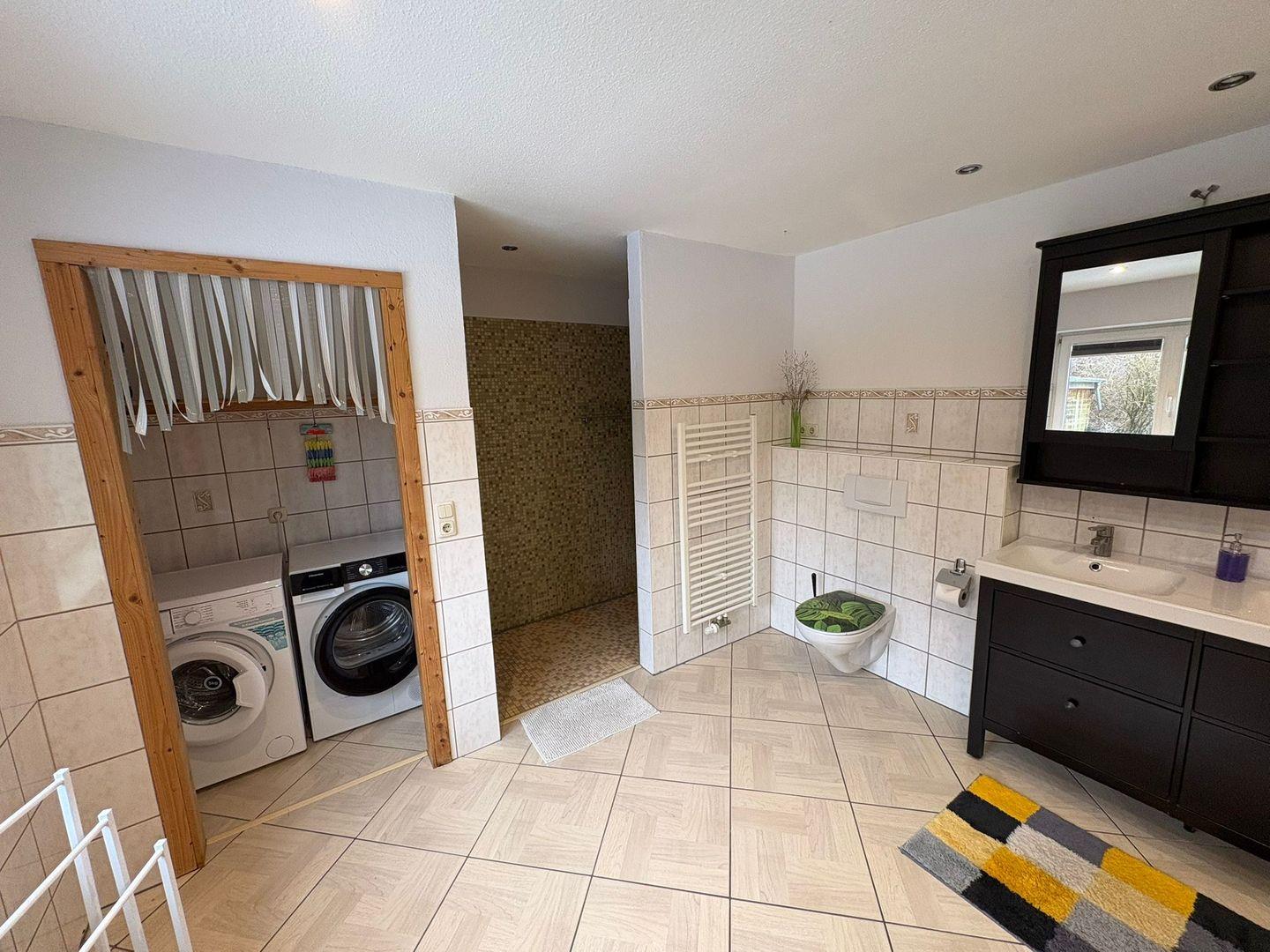 Das Badezimmer ist mit einer offenen Dusche, Waschbecken, großem Spiegel und selbstverständlich mit Fenster ausgestattet. Zusätzlich steht ein separates Gäste-WC zur Verfügung, um den Alltag mehrerer Gäste zu erleichtern. In allen Räumen sorgt die Zentralheizung für angenehme Temperaturen und Rauchmelder garantieren Sicherheit für alle Bewohner.