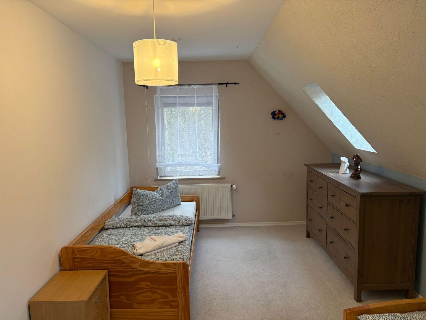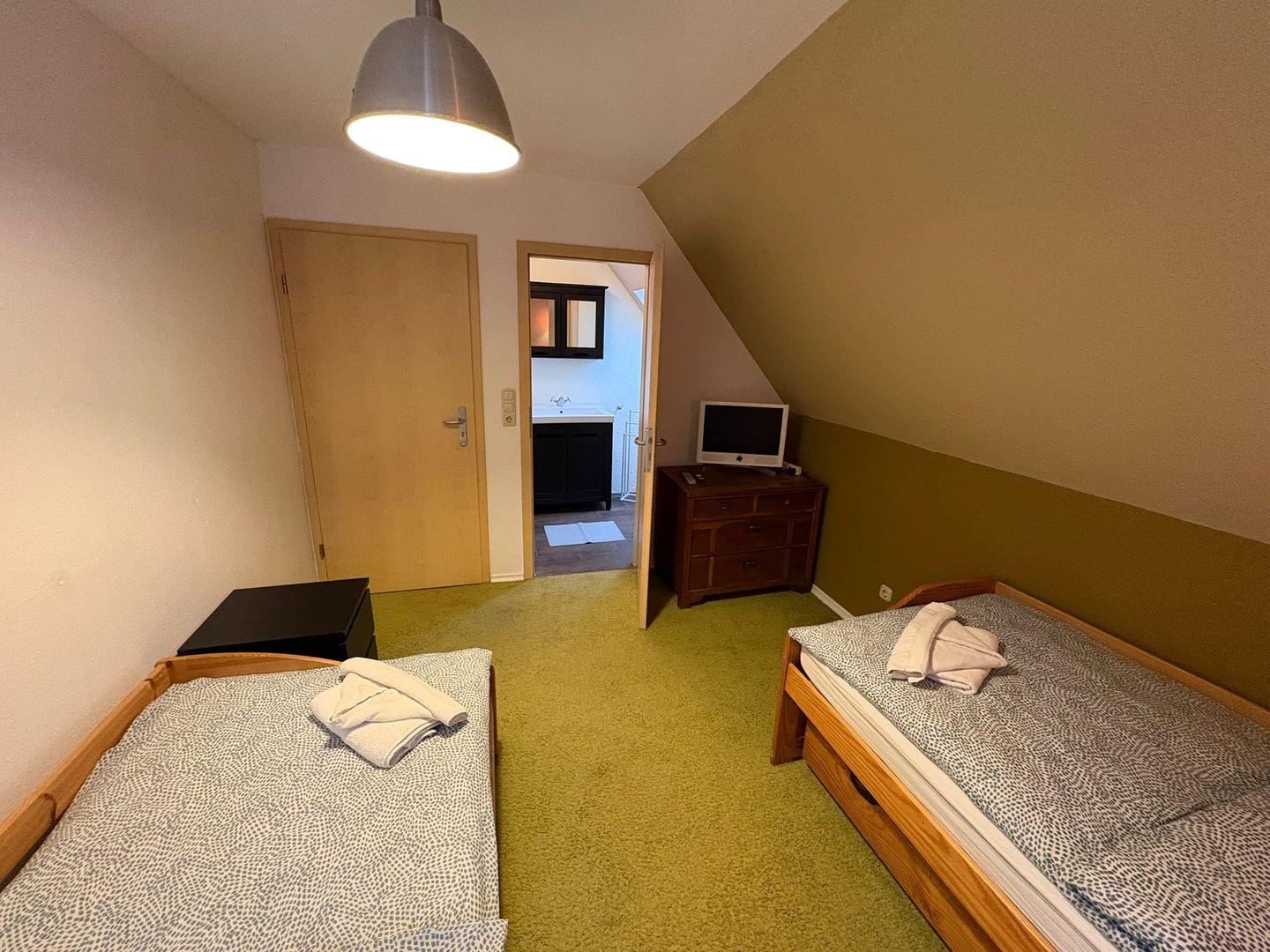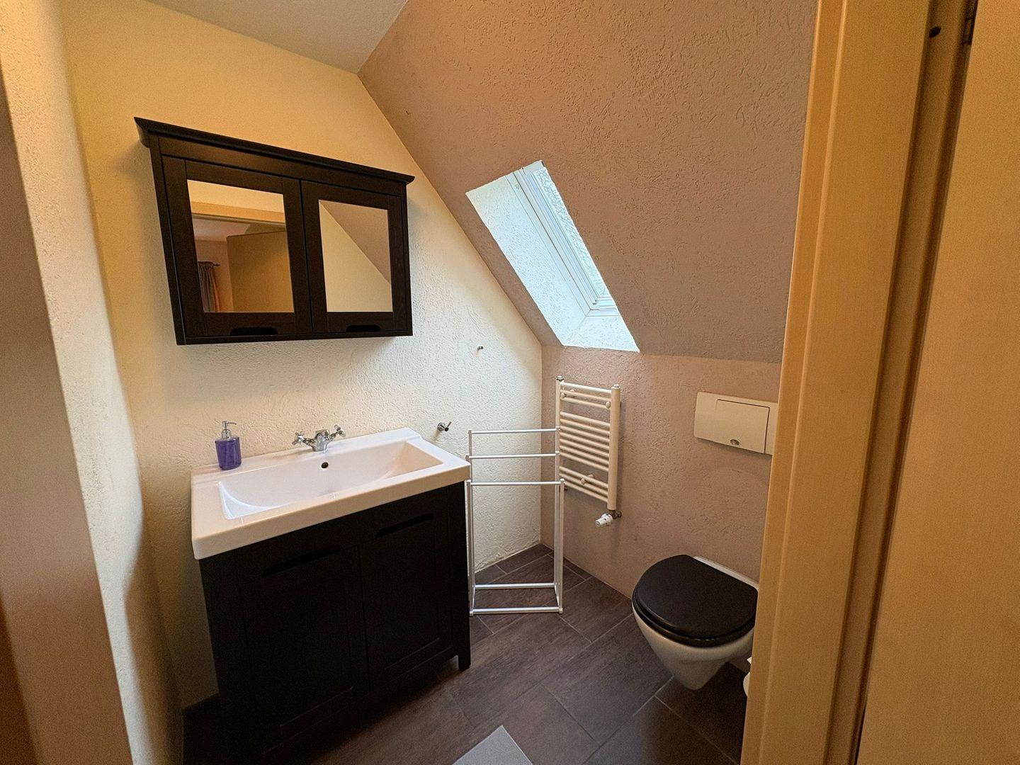 Das Badezimmer ist mit einer offenen Dusche, Waschbecken, großem Spiegel und selbstverständlich mit Fenster ausgestattet. Zusätzlich steht ein separates Gäste-WC zur Verfügung, um den Alltag mehrerer Gäste zu erleichtern. In allen Räumen sorgt die Zentralheizung für angenehme Temperaturen und Rauchmelder garantieren Sicherheit für alle Bewohner.