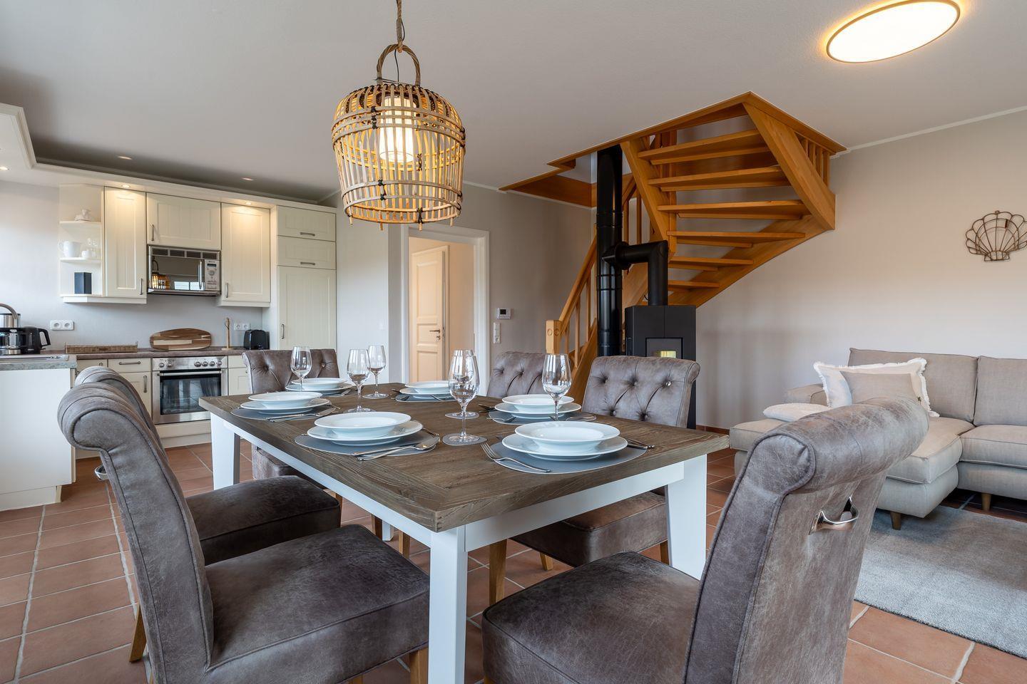 Die Unterkunft erstreckt sich über drei Etagen und bietet Ihnen eine moderne Gestaltung sowie zahlreiche Annehmlichkeiten, die Ihren Aufenthalt so komfortabel wie möglich gestalten. Im Erdgeschoss finden Sie den lichtdurchfluteten Wohnbereich, der offener zur voll ausgestatteten Küche gestaltet ist. Hier können Sie gemeinsam kochen und den Aufenthalt genießen. Die Küche verfügt über viele hilfreiche Utensilien einschließlich eines Ceranherds, Backofens, Mikrowelle und Kühlschrank mit Gefrierfach, sodass Sie hier alles Nötige finden, um Ihre Lieblingsgerichte zuzubereiten.