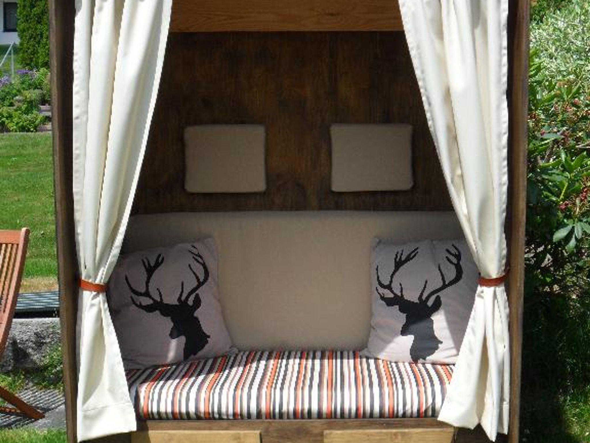 Im stimmungsvollen Garten mit Bayerwald-Strandkorb, Tisch, Stühlen und
