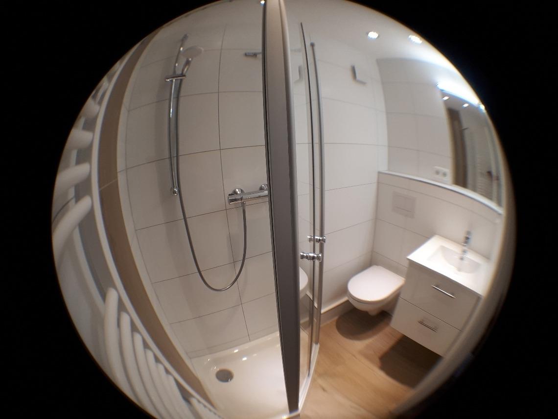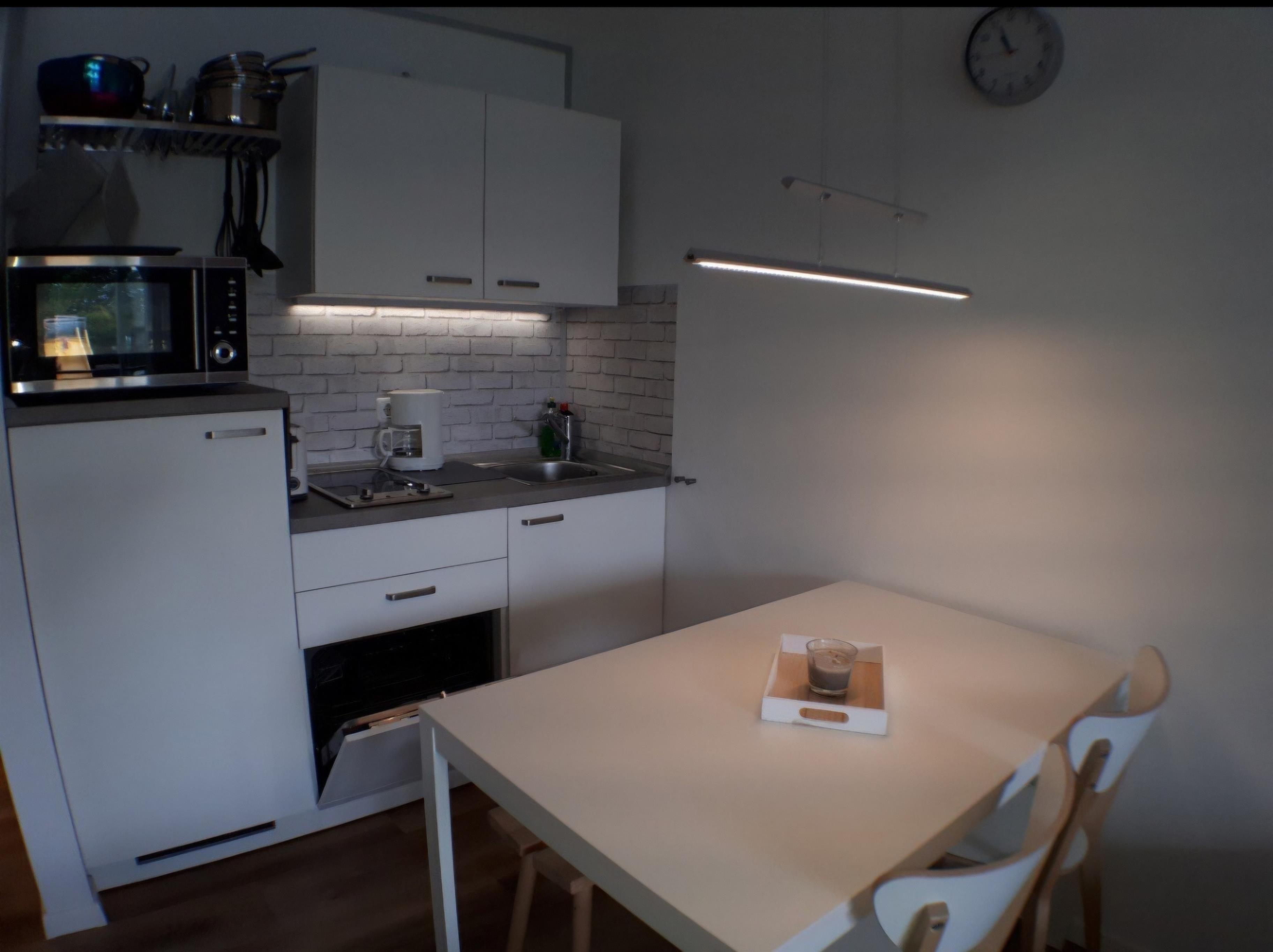 Sie verfügt über eine moderne, umfassend ausgestattete funktionale Einbauküche. Diese beinhaltet u. a. einen Kühlschrank, eine Geschirrspülmaschine, eine Mikrowelle mit Backofenfunktion, einen Toaster, eine Kaffeemaschine und einen Wasserkocher.
