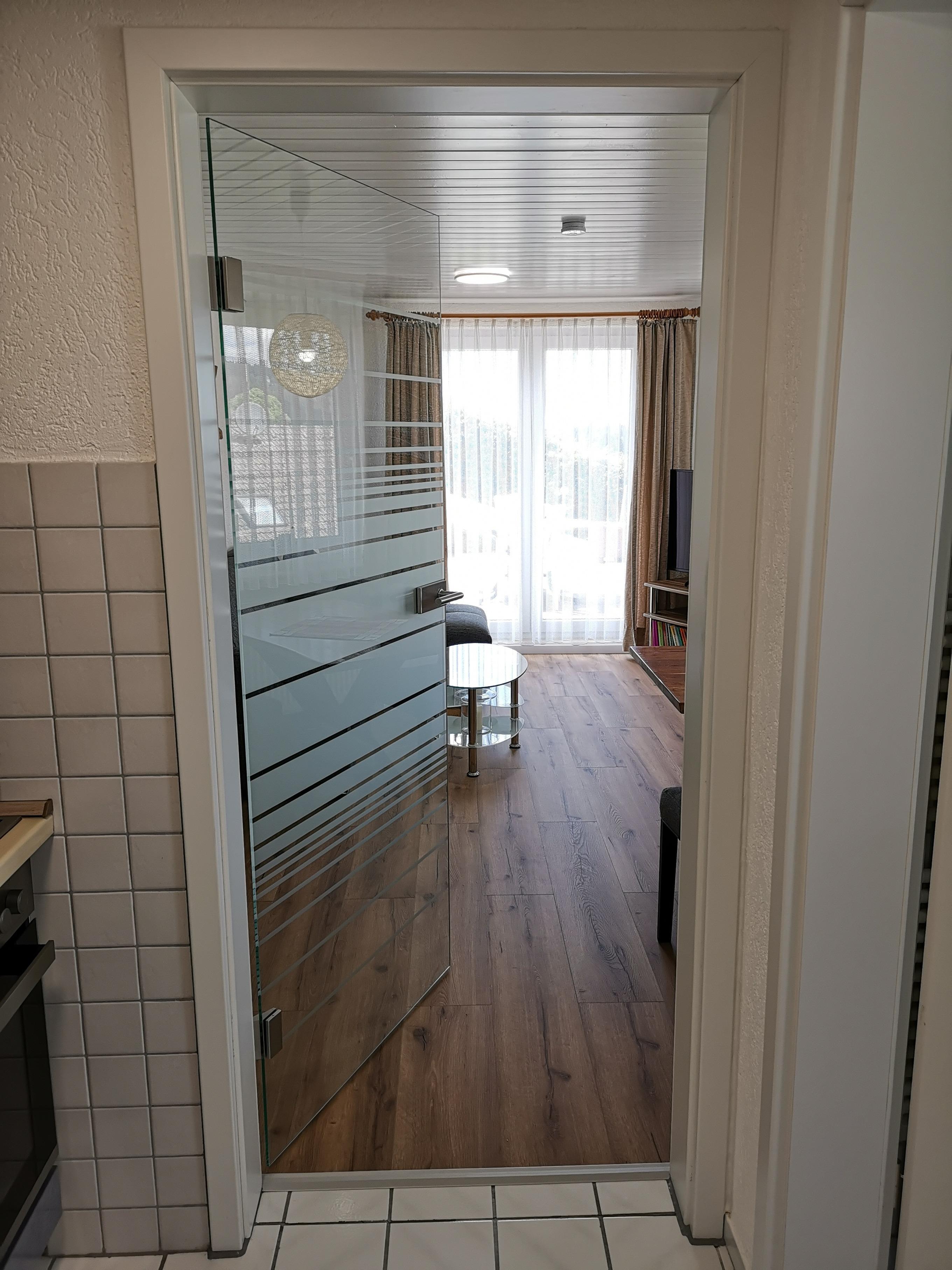 Unsere helle Ferienwohnung verfügt über eine Küche, ein Bad mit Dusche und Tageslicht, einen Wohn-/Essbereich und ein separates Schlafzimmer.