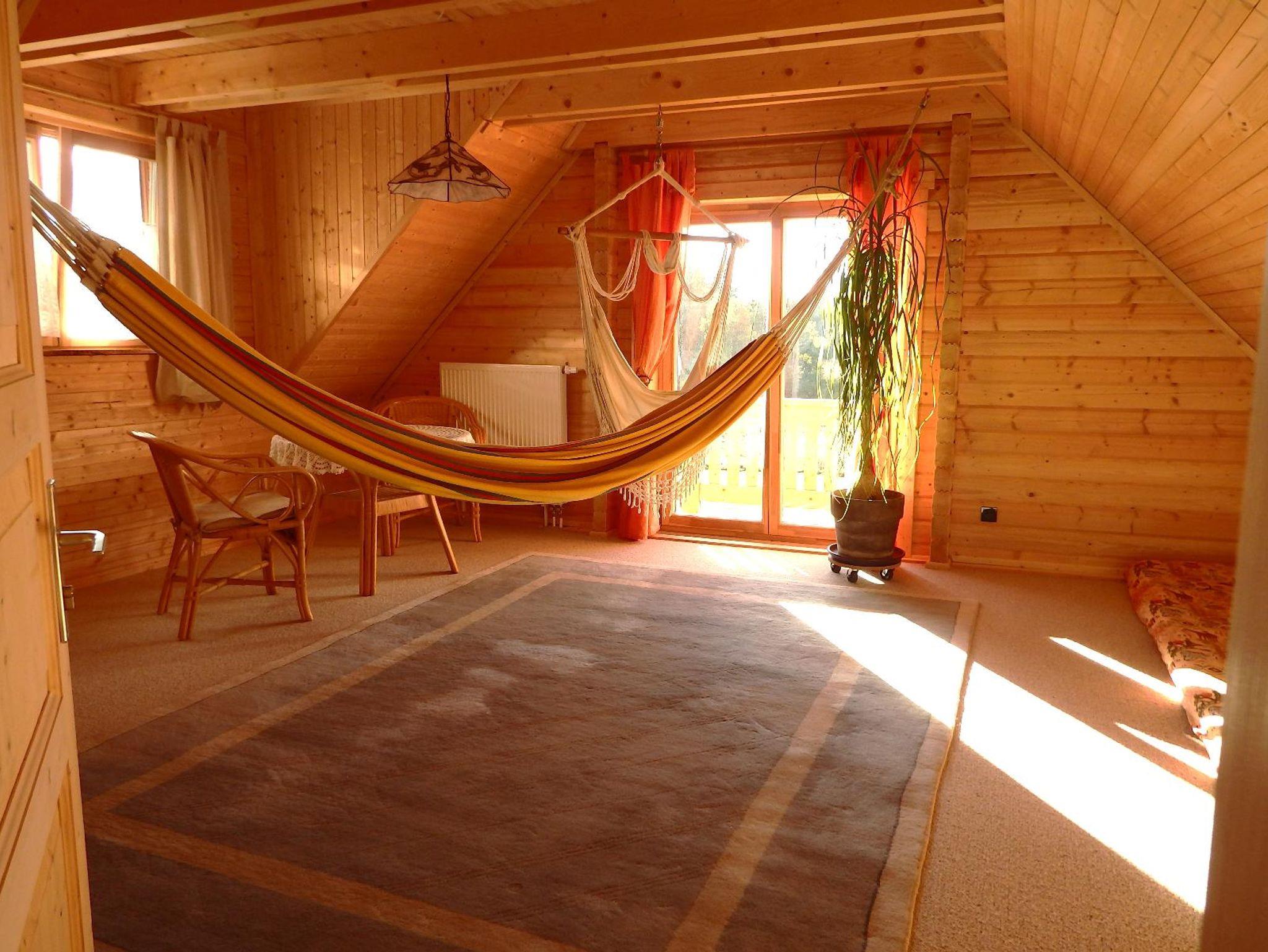 Das neue, als Altersruhesitz für die Besitzer gedachte Holzhäuschen ist ideal geeignet für Menschen, die sich in Ruhe zurückziehen und Natur genießen wollen. Hängematte und -sessel im OG bieten einen phantastischen Ausblick auf das Naturschutzgebiet Klosterfilz, in dem zu bestimmten Zeiten Wildtiere wie Hirsche, Rehe und Füchse beobachtet werden können. Auch Grünspecht, Drosseln, Neuntöter und viele mehr tummeln sich auf den Grünflächen vor dem Haus.