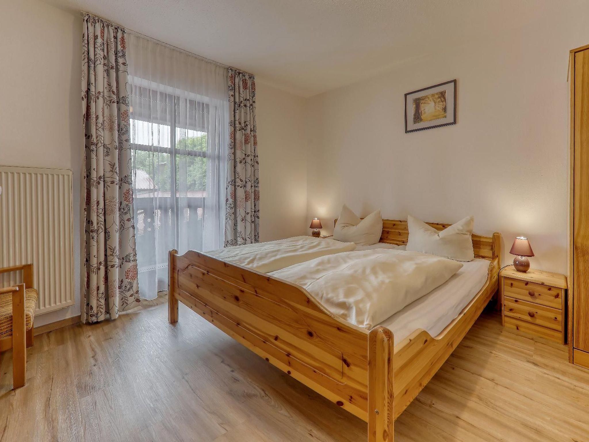 Die schöne, geräumige Ferienwohnung B mit 75qm Wohnfläche liegt im 1. Stock und bietet Platz für bis zu 5 Personen. Das erste Schlafzimmer ist mit einem gemütlichen Doppelbett eingerichtet, das andere mit einem Doppelbett und einem Einzelbett. Das gemütliche große Wohnzimmer ist mit Fernsehcouch, Fernseher, Essecke und Diele mit großer Küchenzeile ausgestattet. In der Küche ist eine Kaffemaschine, ein Wasserkocher, ein Kühlschrank, ein Herd und Backofen vorhanden. Hand-, Bade- und Geschirrtücher werden kostenlos gestellt. Außerdem gibt es kostenlose Begrüßungsgetränke und Sie können das W-Lan frei nutzen. Das Bad ist mit Dusche und WC ausgestattet. Des Weiteren haben Sie einen großen Balkon auf der Sie die Sonne genießen können. Auch buchbar als Wohnung für 2 Personen mit getrennten Schlafzimmern.