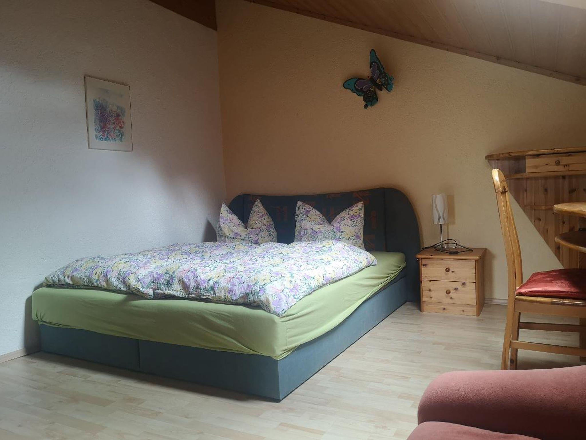Die geräumige Ferienwohnung ist durch den Dachgeschosscharakter besonders gemütlich. Sie verfügt über 2 Schlafzimmer mit je einem Doppelbett, einer Küche, einem Wohnzimmer mit Essecke und einem großen Bad mit Dusche und WC.