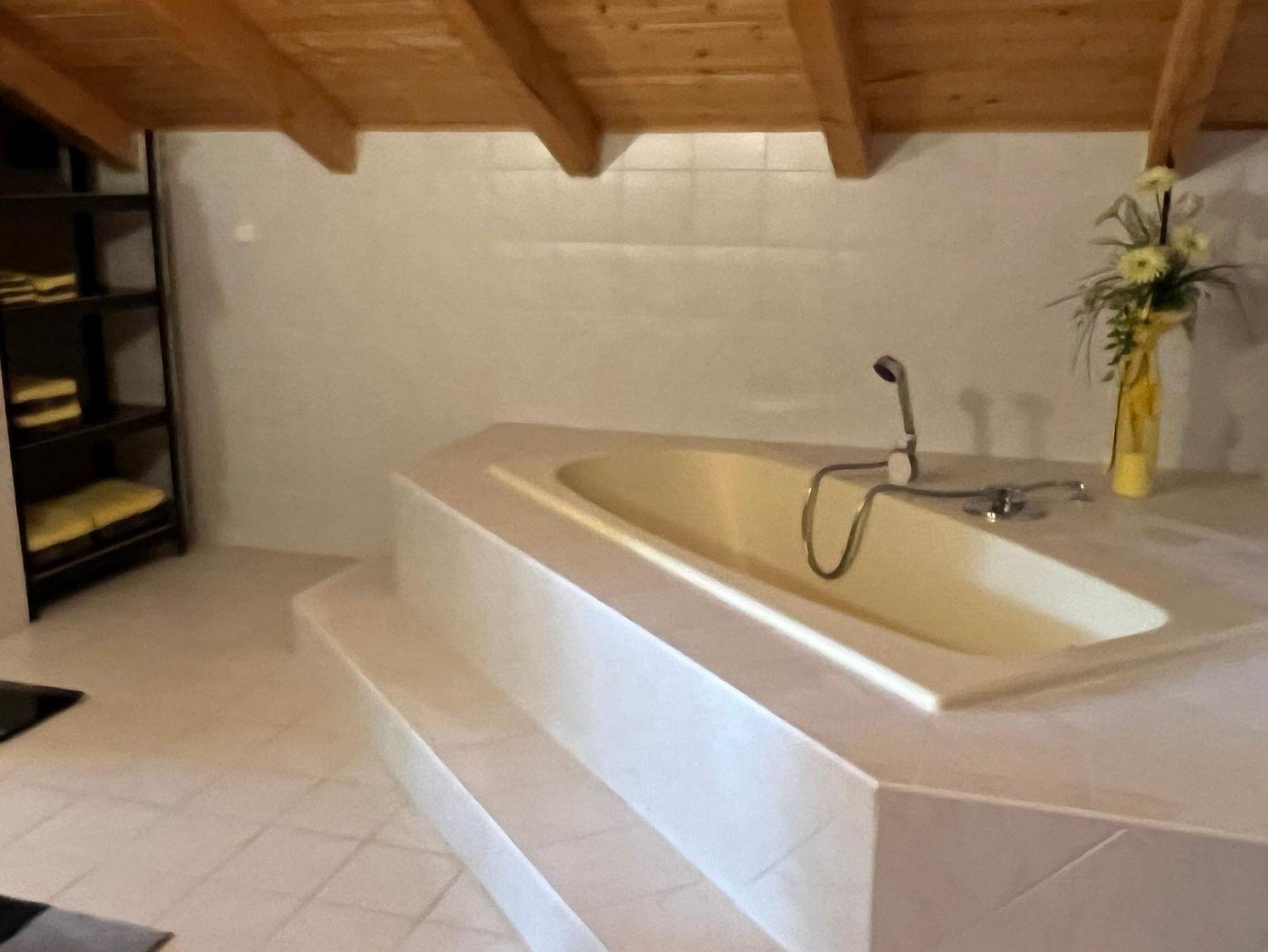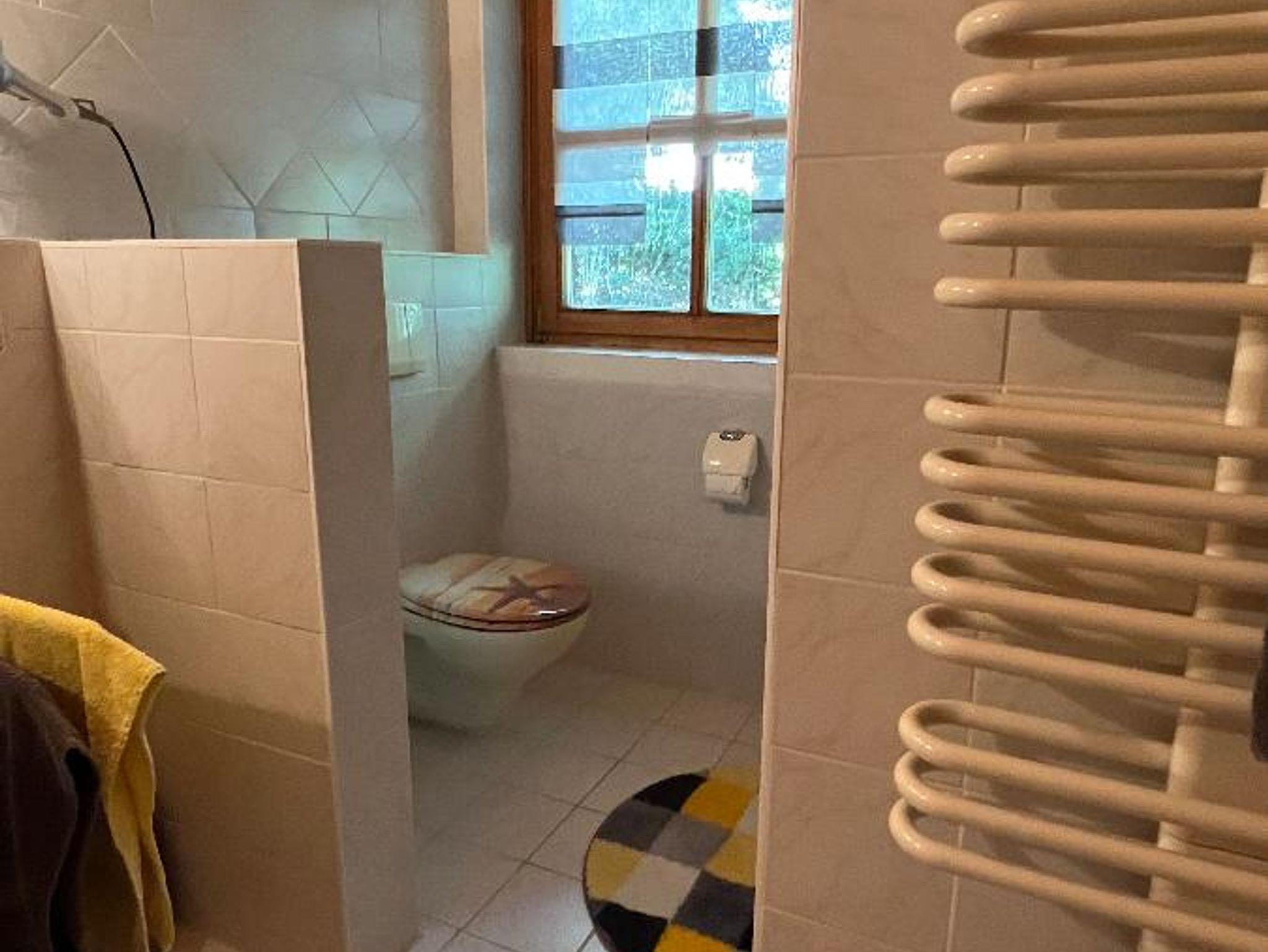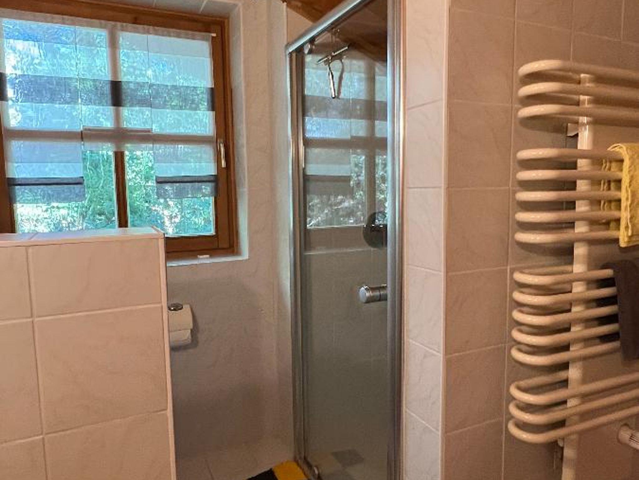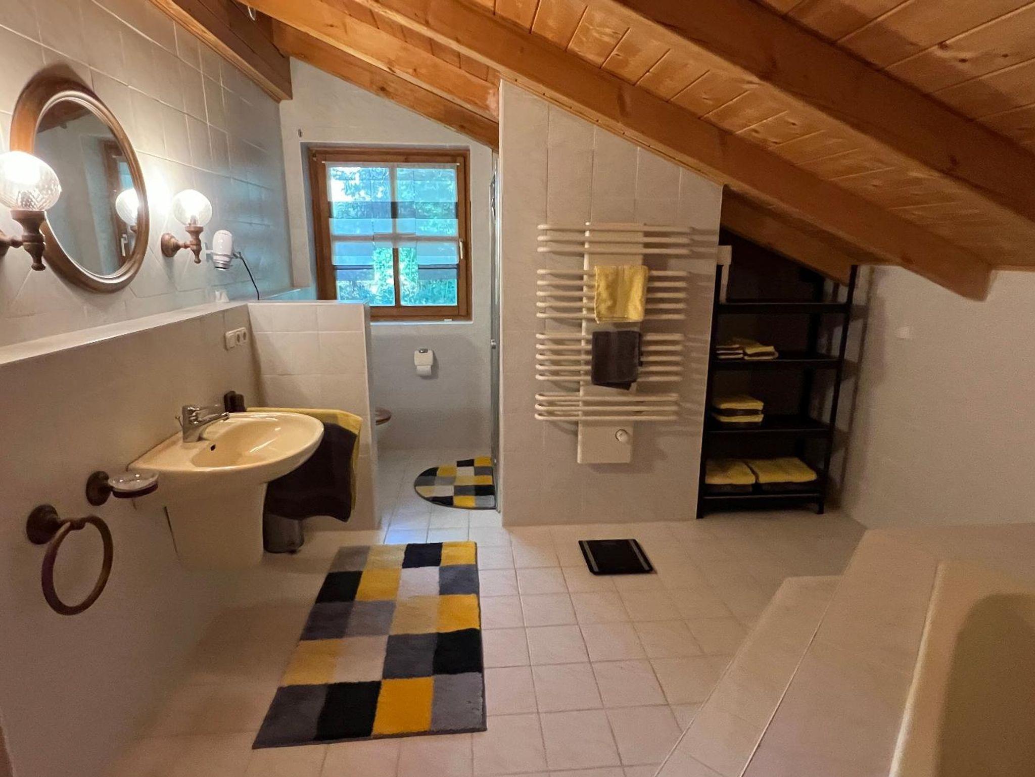 Das Badezimmer mit Wanne, Duschkabine, Föhn, Handtuchtrockner und WC lässt keine Wünsche übrig.