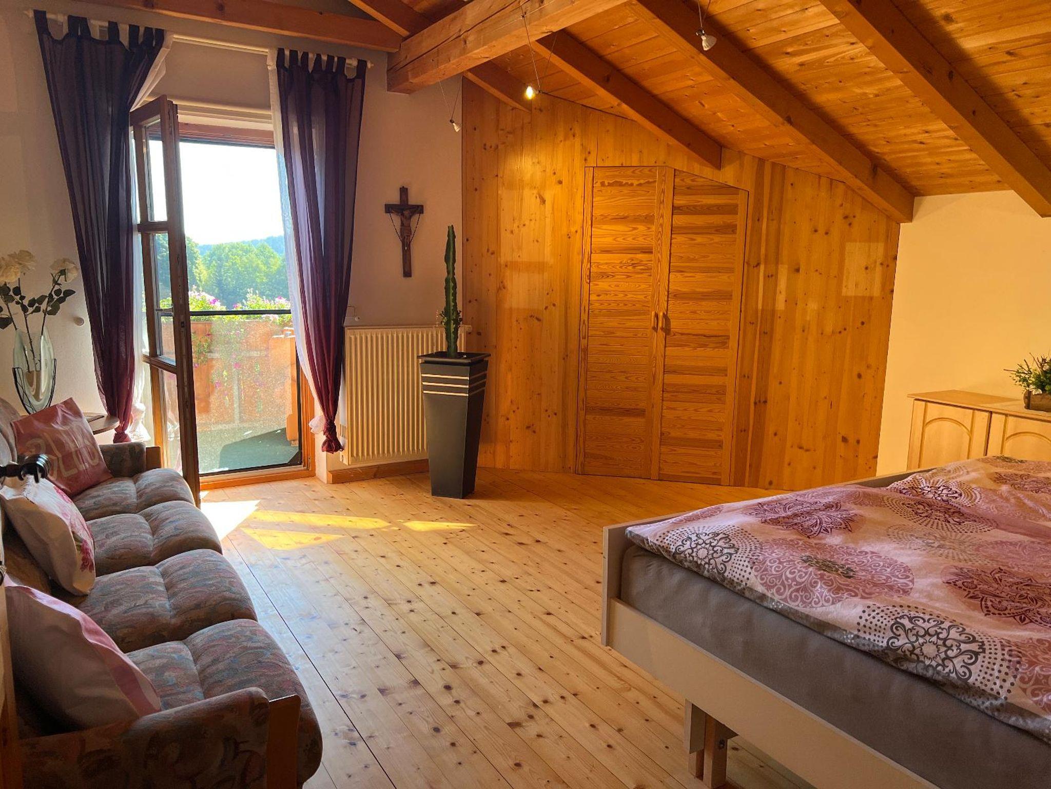 Unsere gemütliche Ferienwohnung Ausblick befindet sich im Haus der Vermieter im 1. Stock (Mansarde) und bietet Platz für 2-4 Personen und ein Babybeistellbett.