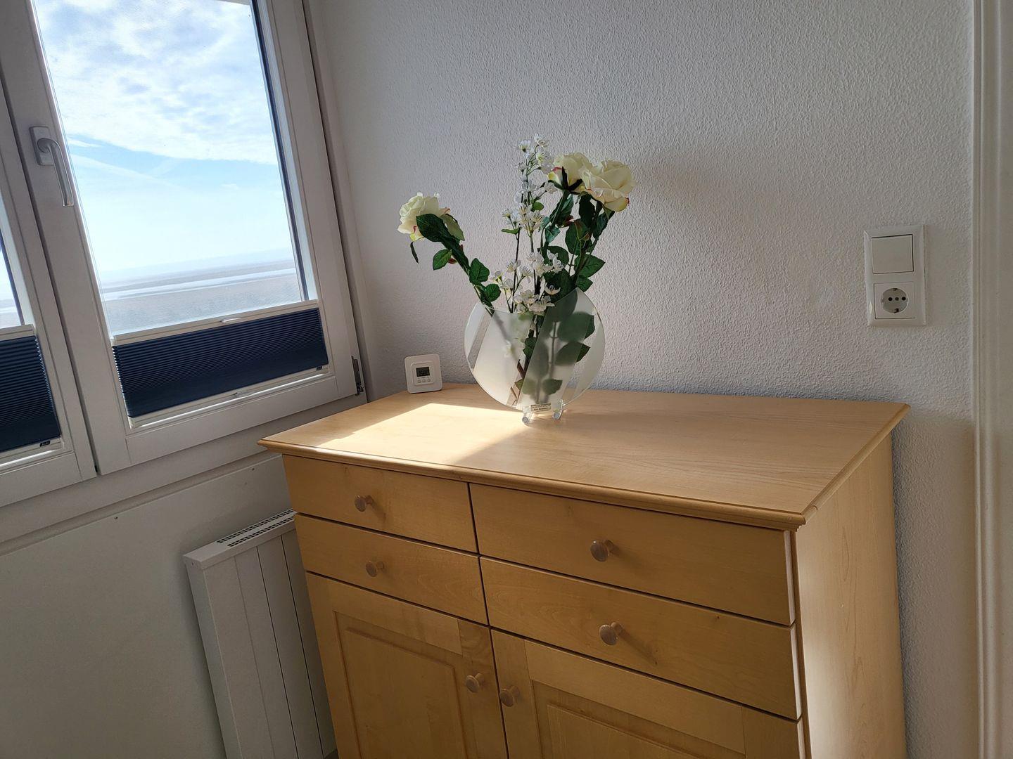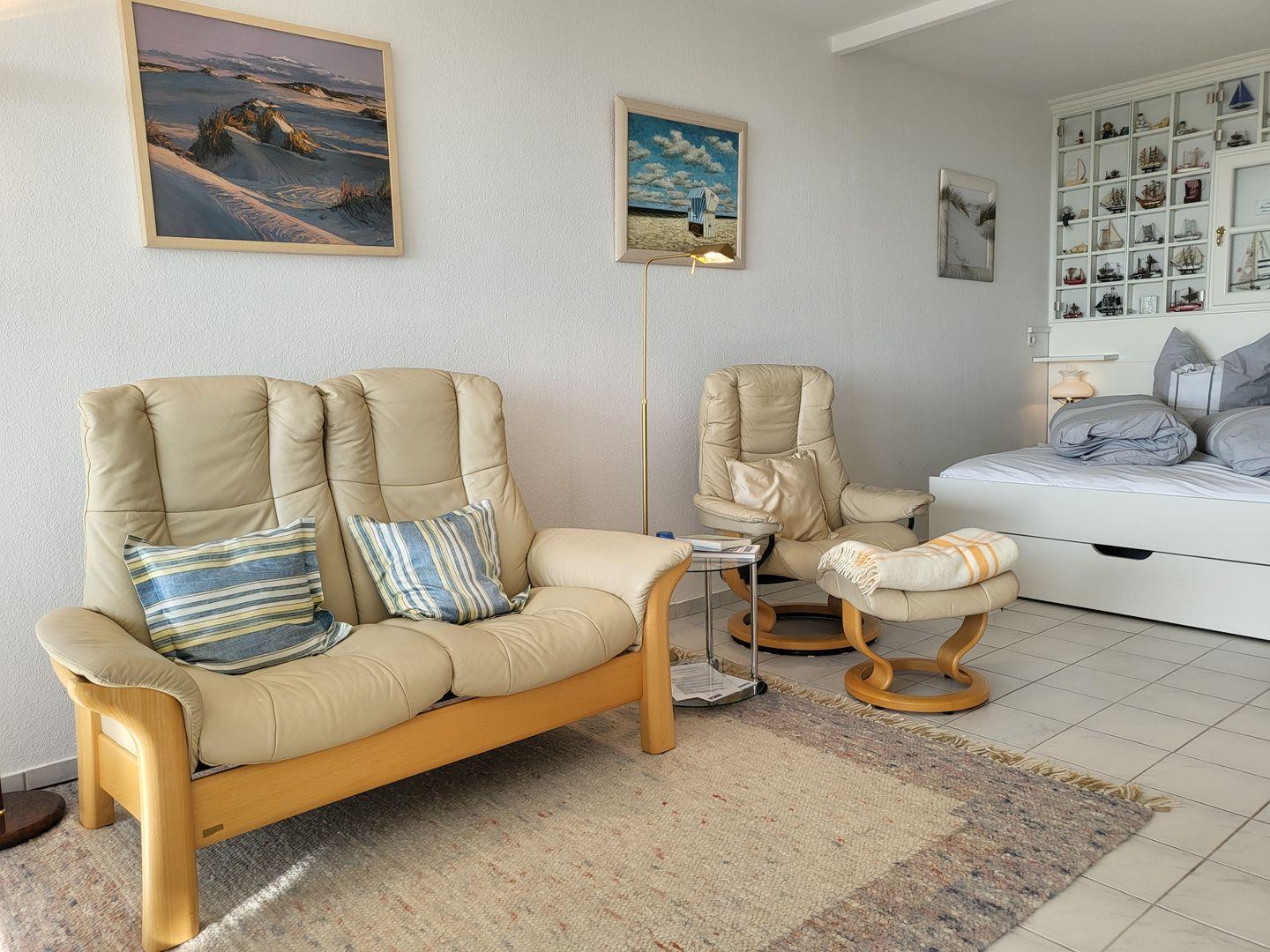 Balkon mit Strandkorb und Tisch mit 2 Stühlen. Auf insgesamt 47m² befindet sich ein großes Wohnzimmer mit Schlafnische und einem 160x190 cm breiten Doppelbett. Der Einstieg ist nur von einer Seite oder über das Fussende möglich. Ein weiteres Zimmer ist ausgestattet mit einem Einzelbett, einer Kommode. Beide Räume haben Verdunklungsrollos und Insektenschutzgitter, sodass auch im Sommer einem Ausschlafen nichts im Wege steht. Bequeme Stressless-Sitzmöbel sorgen für Entspannung nach langen Spaziergängen oder Fahrradtouren. Die Küche ist ausgestattet mit einem 4-Feld-Ceran-Kochfeld, Dunstabzugshaube, Backofen, Spülmaschine, Kühlschrank, Kaffeefiltermaschine, Nespressokapselmaschine, Wasserkocher und Toaster. Das renovierte Badezimmer mit Dusche glänzt durch einen Spiegelschrank mit viel Stauraum, einem Kosmetikspiegel und einem Haarföhn.