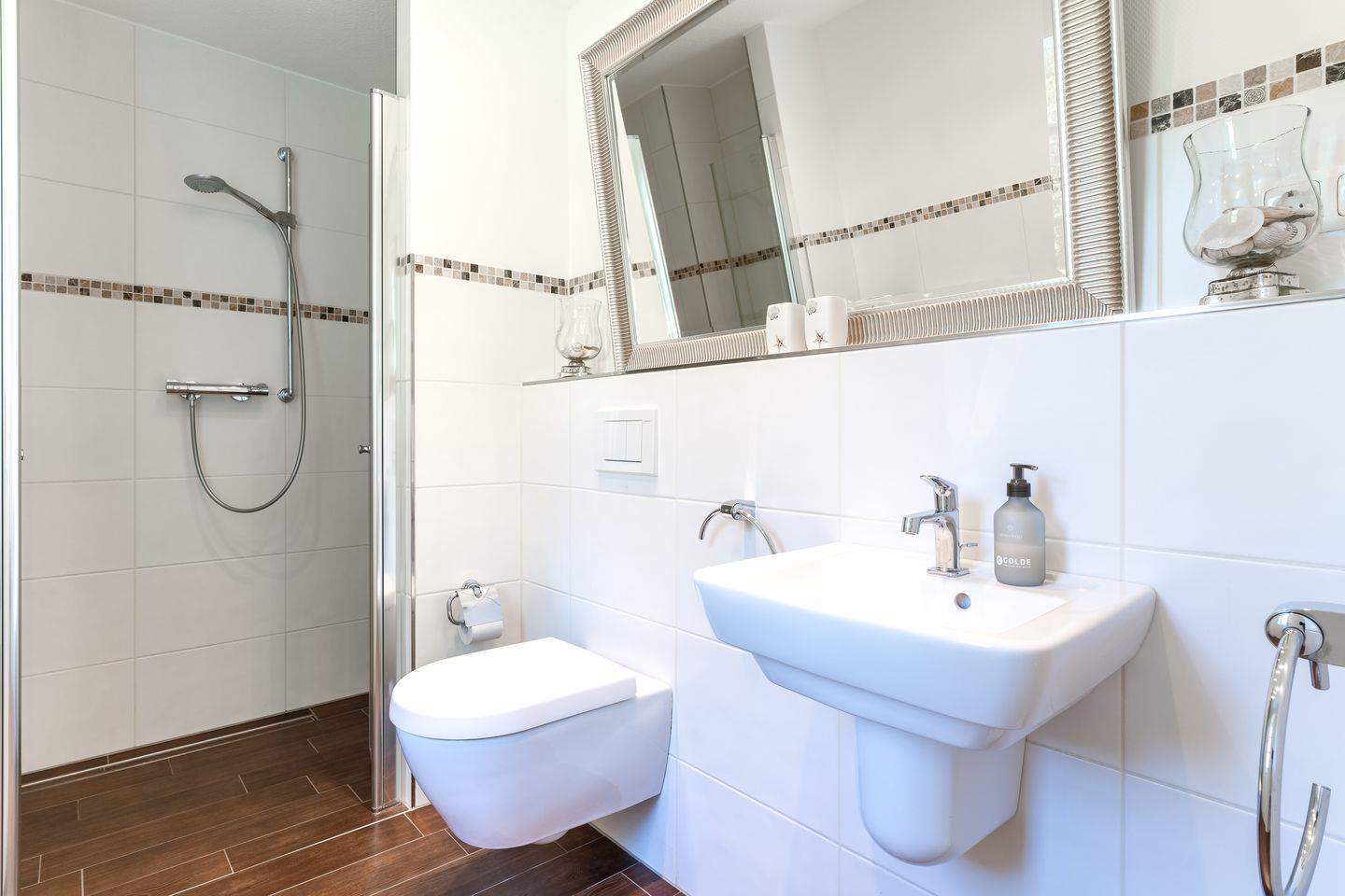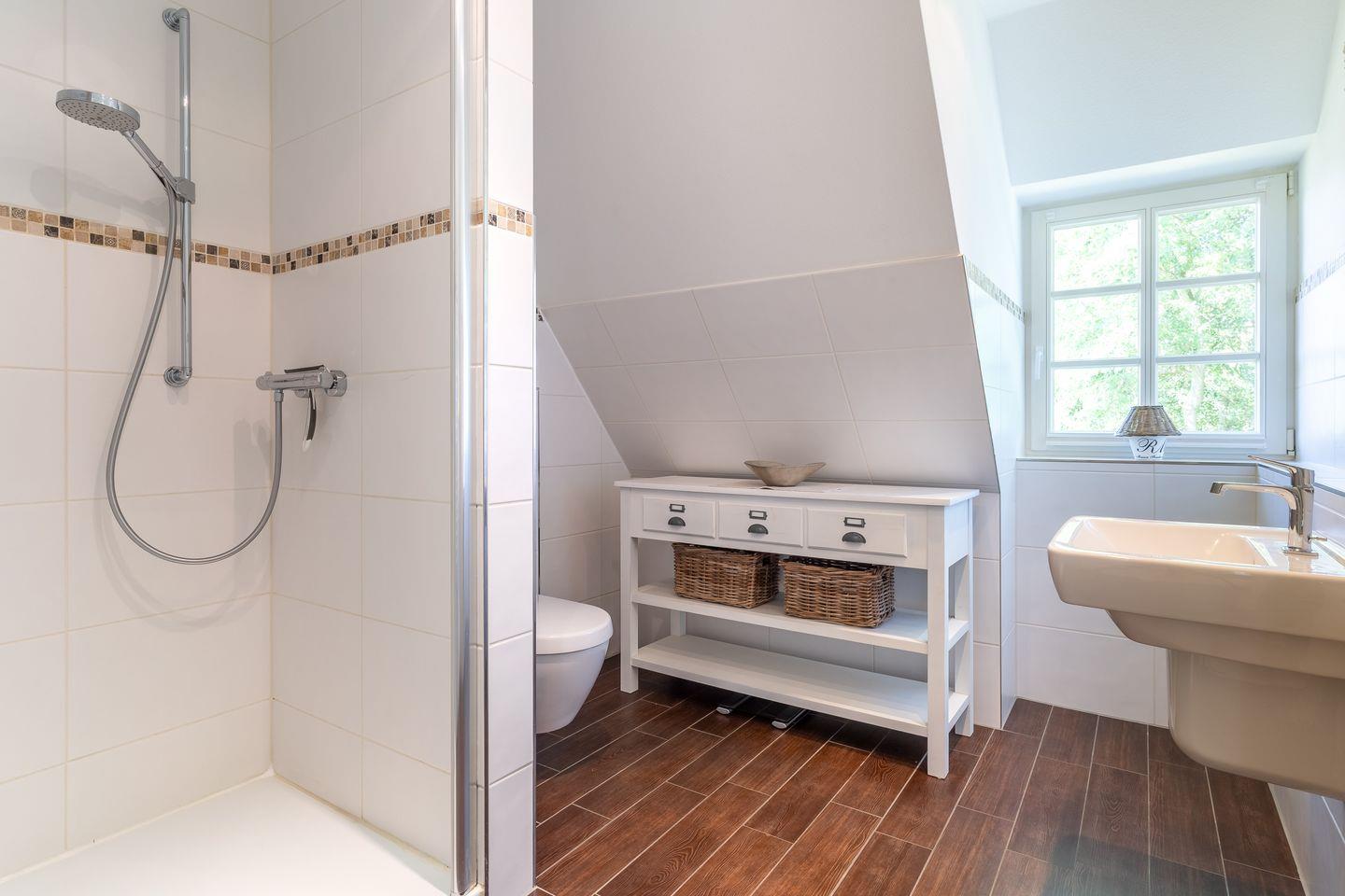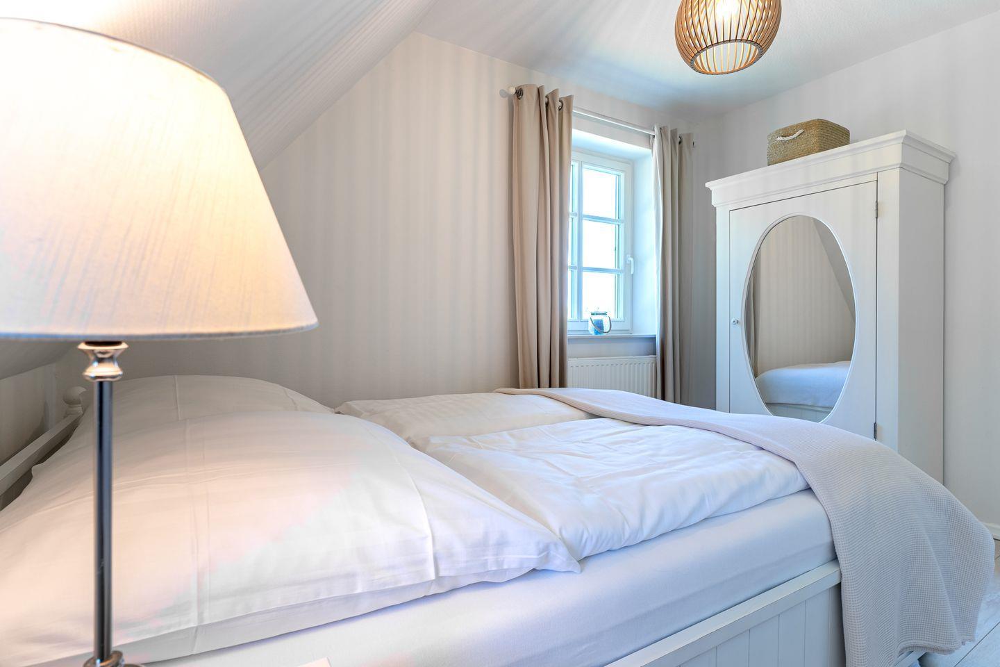 Über eine Holztreppe gelangen Sie ins Obergeschoss, wo zwei Schlafzimmer mit jeweils einem Doppelbett für erholsamen Schlaf sorgen. Ein geräumiges Bad mit Dusche ist ebenfalls im Obergeschoss vorhanden. Im urigen Dachgeschoss steht ein weiteres Einzelbett zur Verfügung.