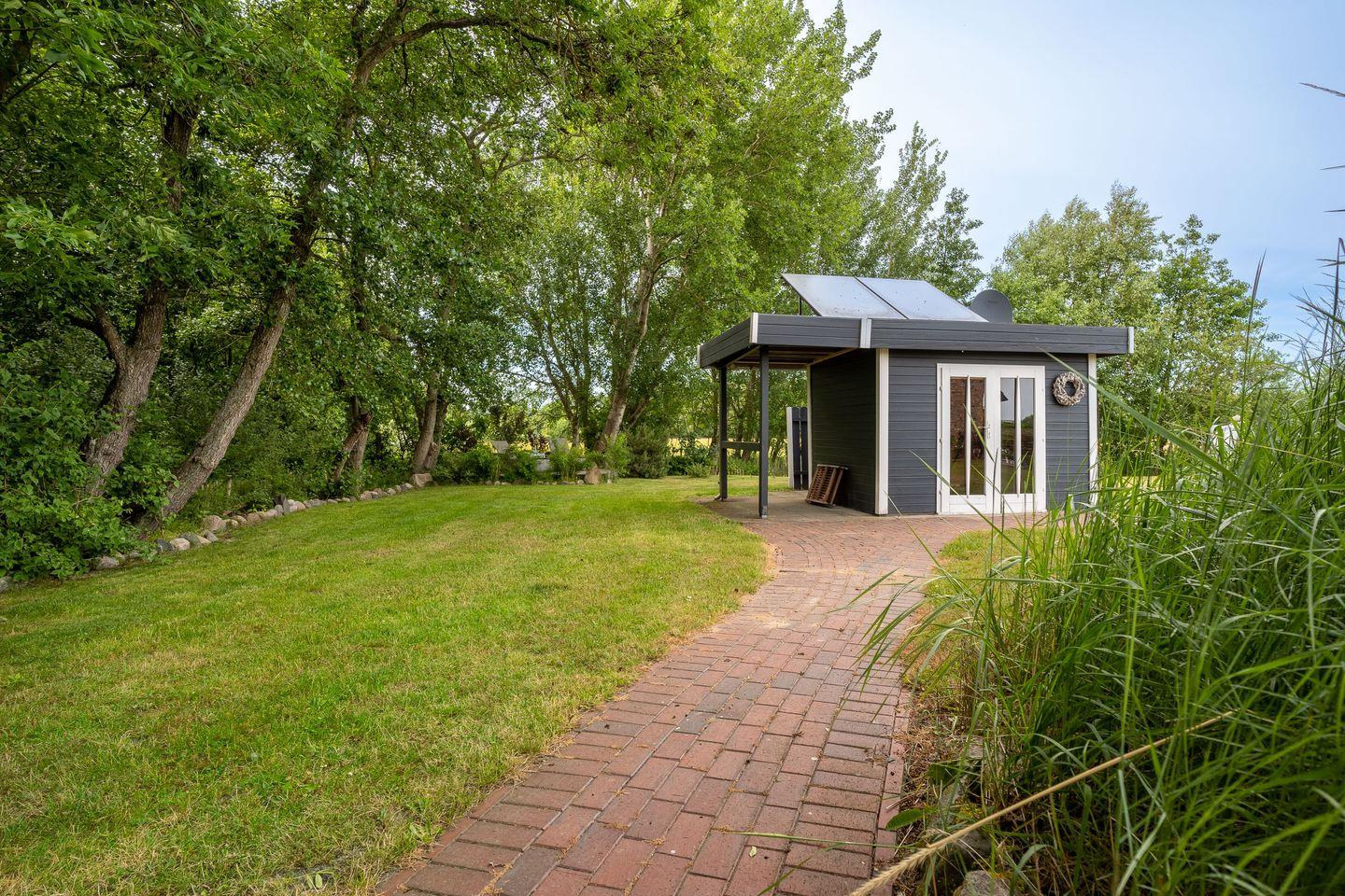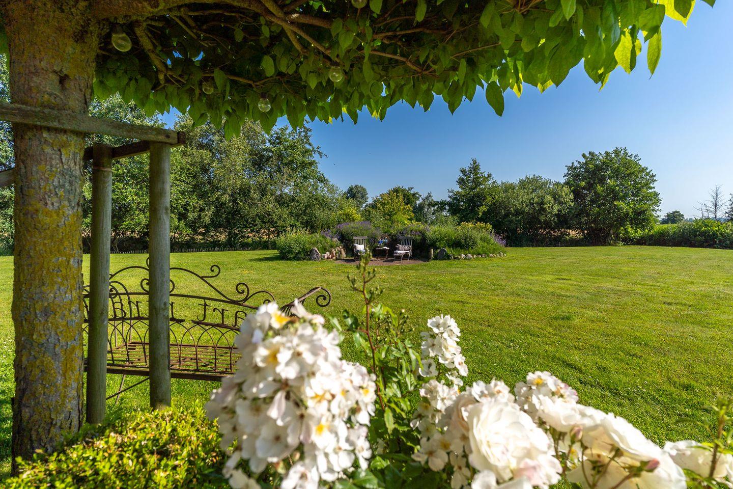 Im Ferienhaus ist die Mitnahme von maximal einem Hund gestattet. Der Garten wird durch zwei Wasserläufe am Ende des Grundstücks begrenzt.
