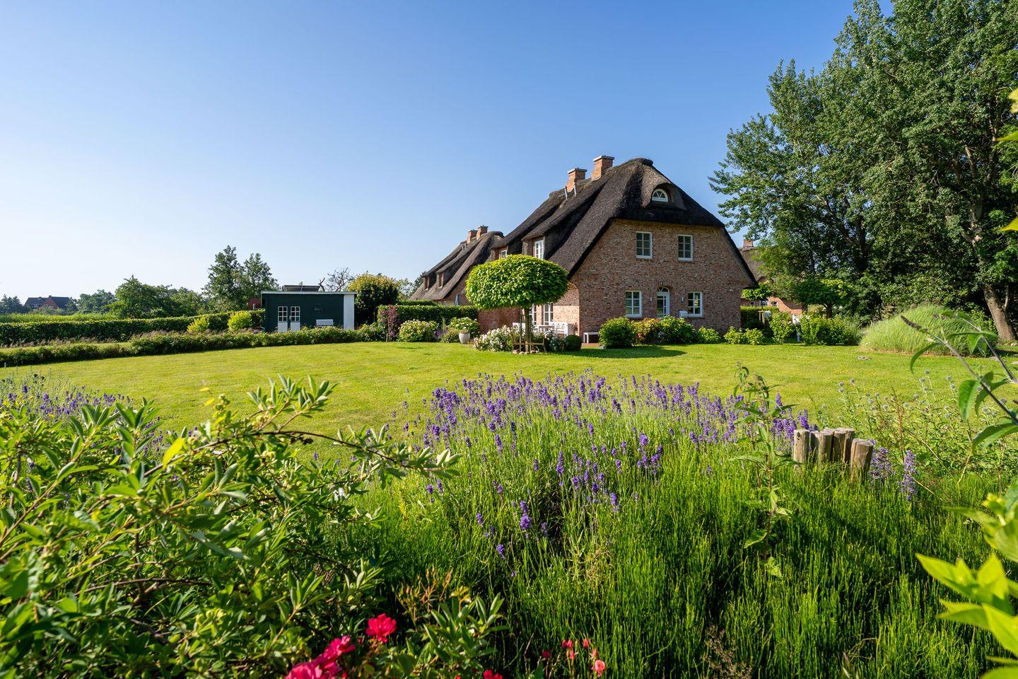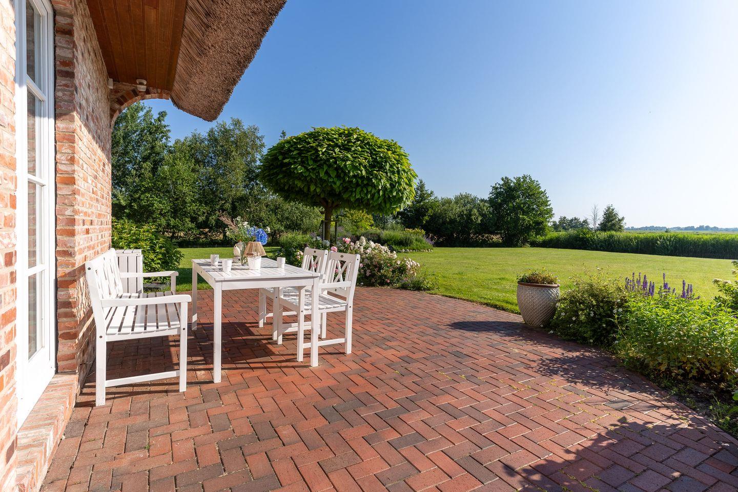 Die liebevoll eingerichtete Haushälfte unter Reet bietet ca. 100 m² Wohnfläche und Platz für 5 Personen im Ortsteil Böhl, in unmittelbarer Nähe zum Böhler Strand an der Nordsee. Das Haus liegt auf einem ca. 2.000 m² großen Grundstück mit einer Rasenfläche und verfügt über vier Terrassen, die mit heimischen Pflanzen geschmückt sind und sowohl sonnige als auch schattige Plätzchen bieten. Hier können Sie einen traumhaften Weitblick genießen, während Sie auf den Gartenmöbeln entspannen.