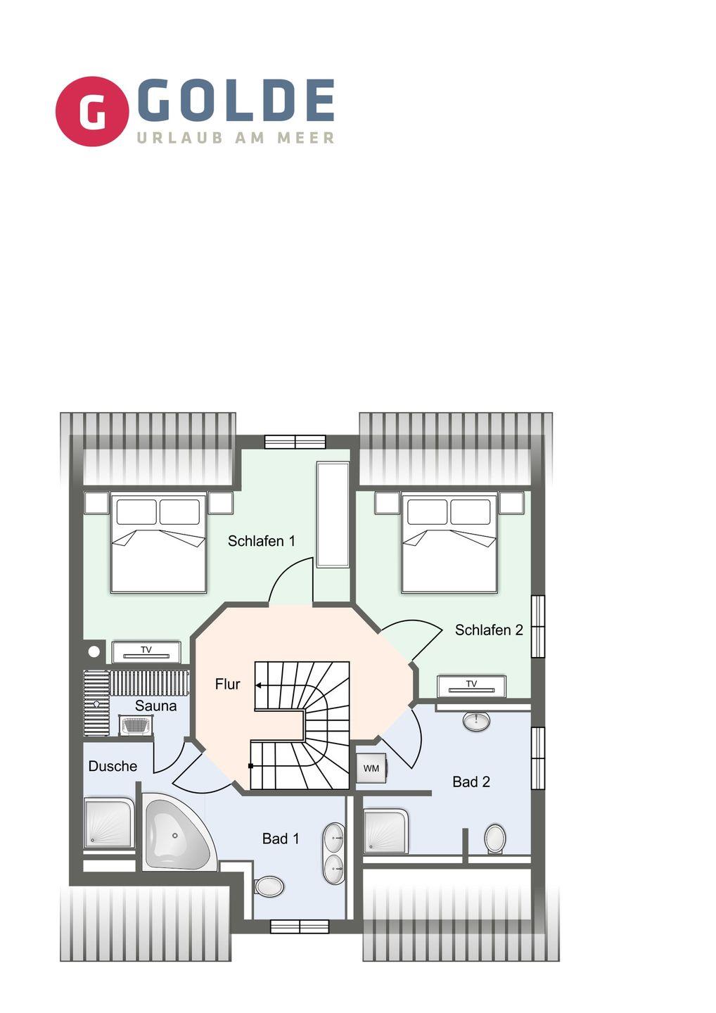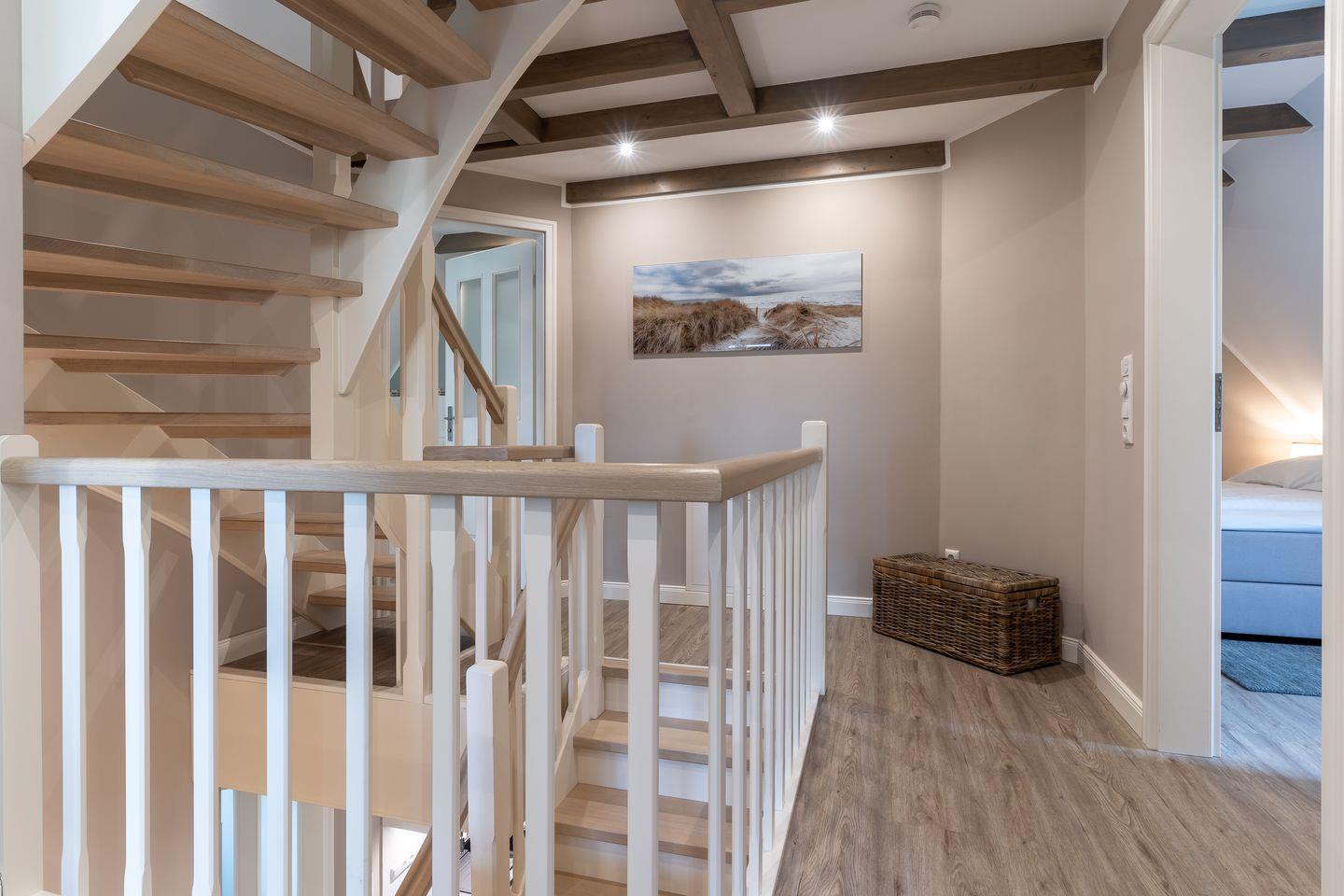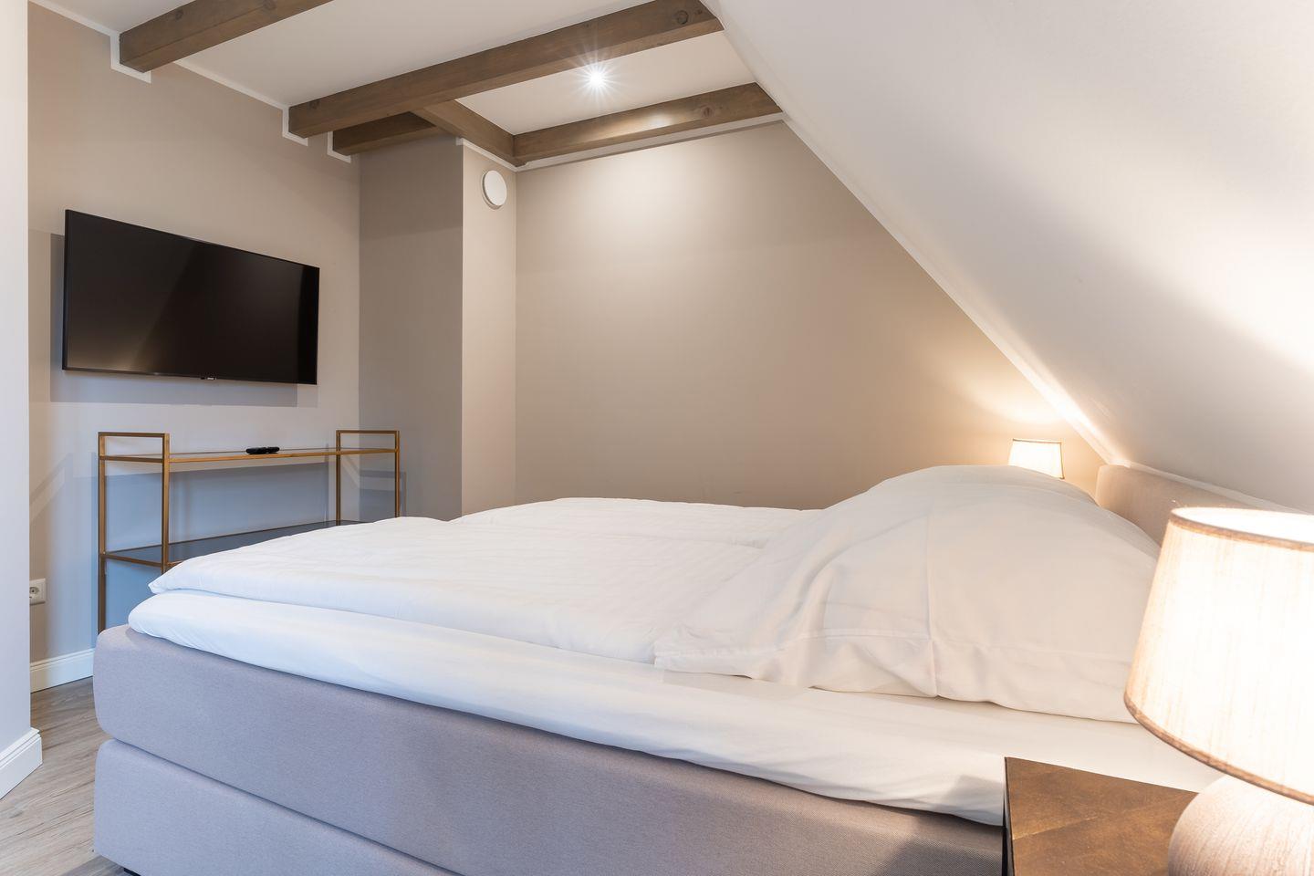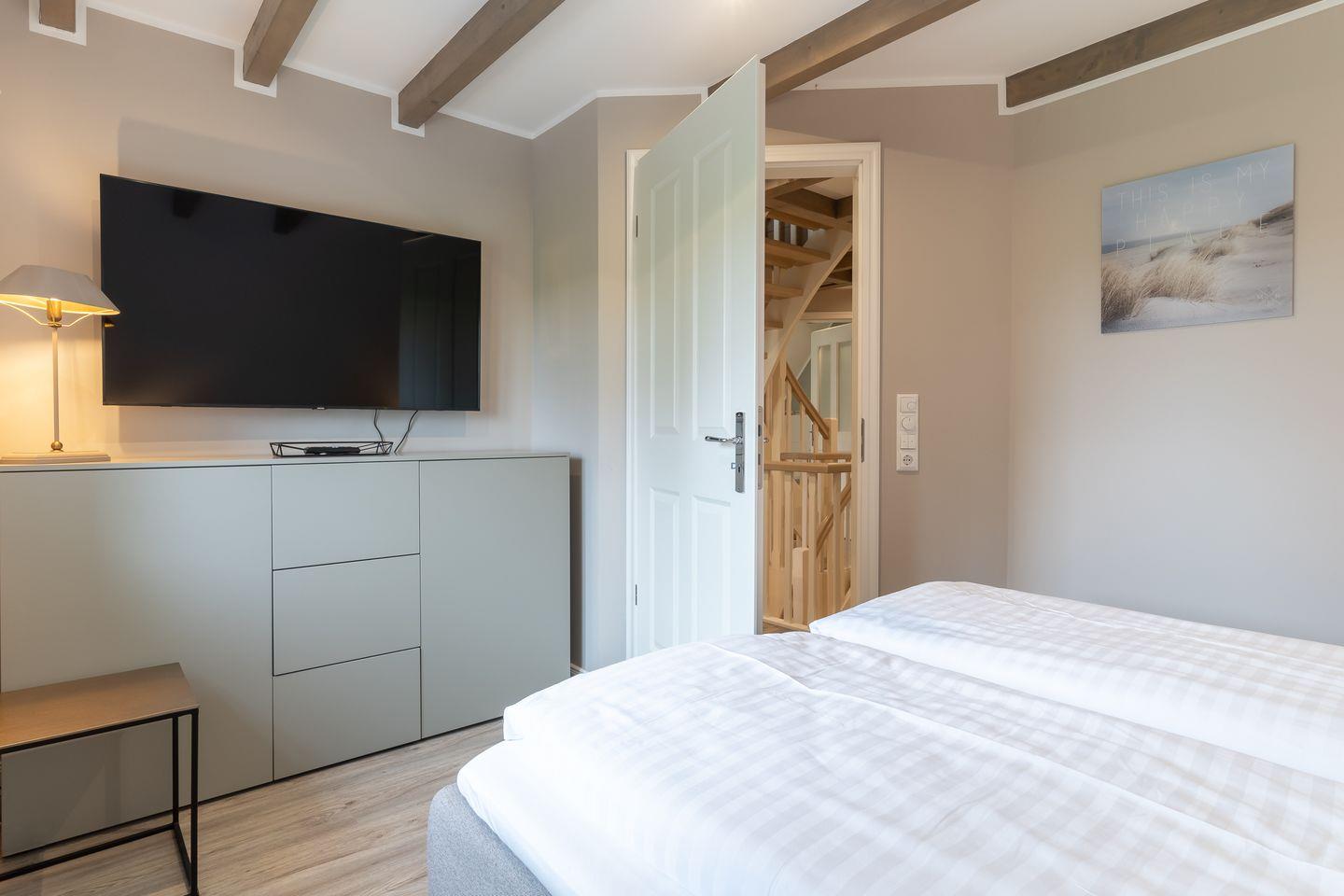 Das Obergeschoss beherbergt zwei Schlafzimmer, welche je mit einem komfortablen 180x200cm Boxspringdoppelbett samt Topper ausgestattet sind. Ein Schlafzimmer verfügt über einen großen Kleiderschrank, das andere über eine Kommode. Die Schlafzimmer verfügen zudem über je einen Flachbild-TV.
