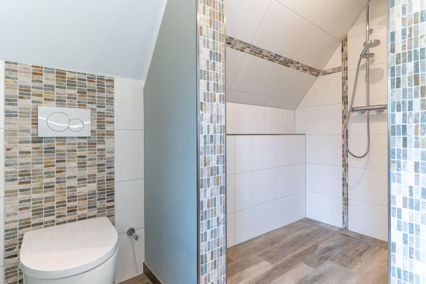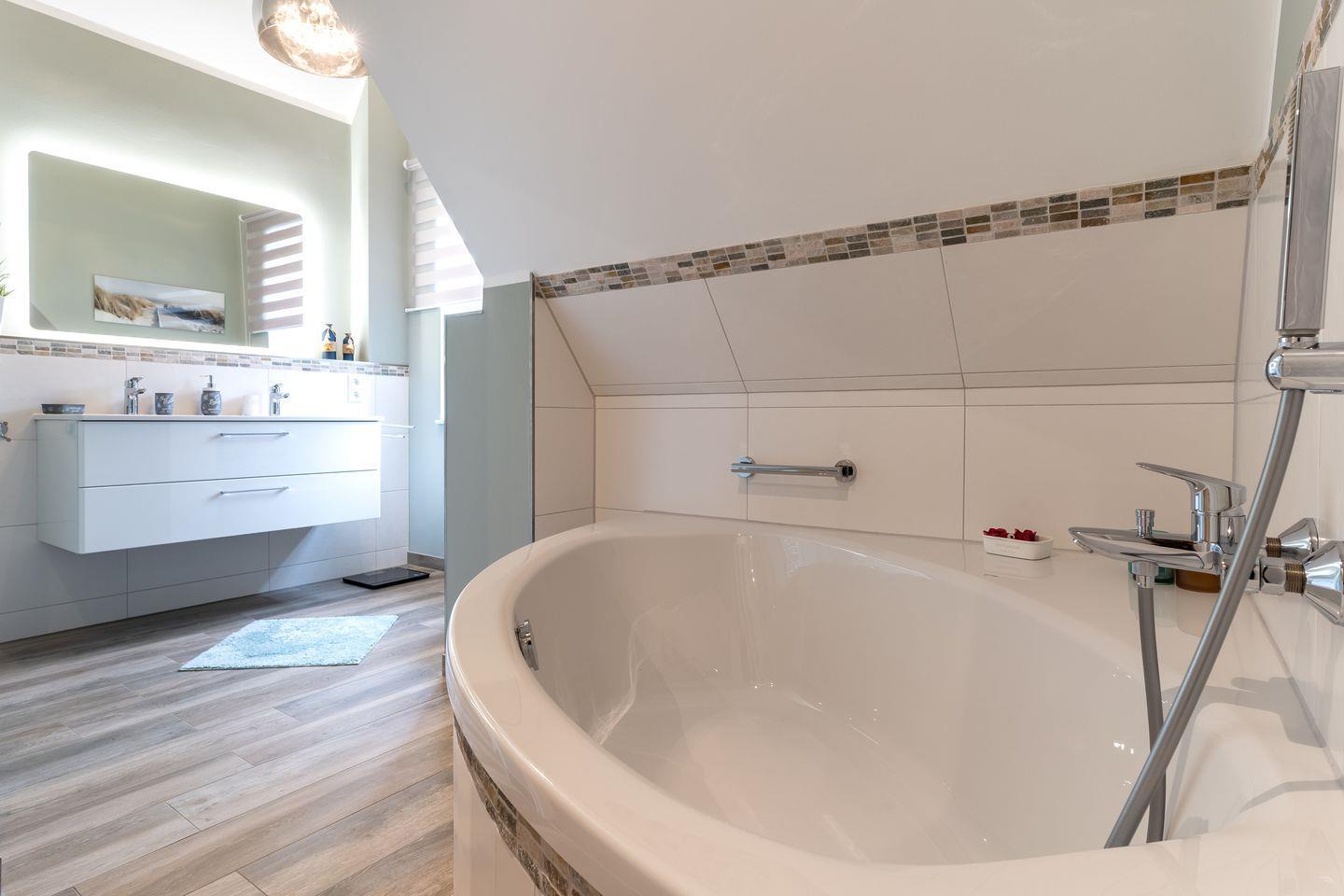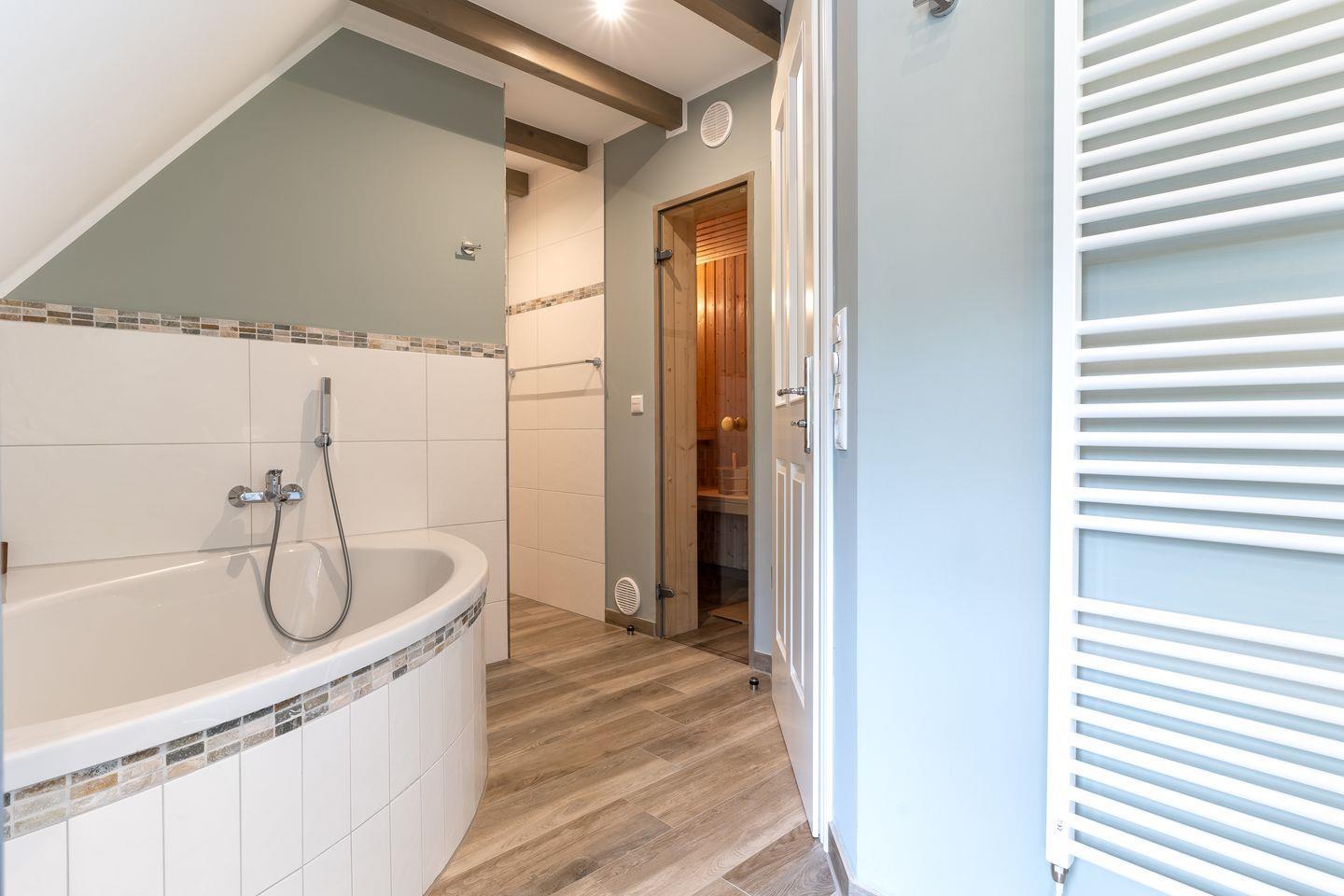 Im großen Badezimmer des Summerdiek 10 finden Sie neben dem Waschbecken auch die Sauna des Hauses, eine Badewanne sowie bodengleiche Dusche und Toilette. Im zweiten Badezimmer befinden sich neben dem Waschbecken noch eine bodengleiche Dusche, die Toilette und der hauseigene Waschtrockner.