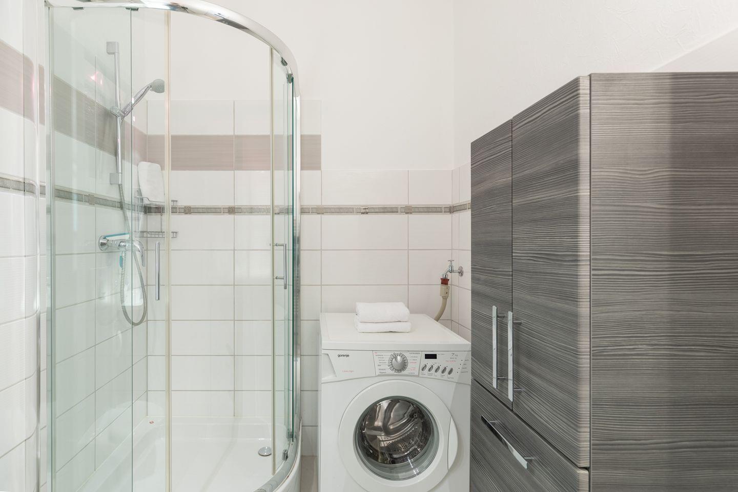 Das modernisierte und hell gestaltete Bad ist mit einer Dusche, Waschbecken und WC ausgestattet. Es verfügt zusätzlich über eine Handtuchheizung und eine Waschmaschine.