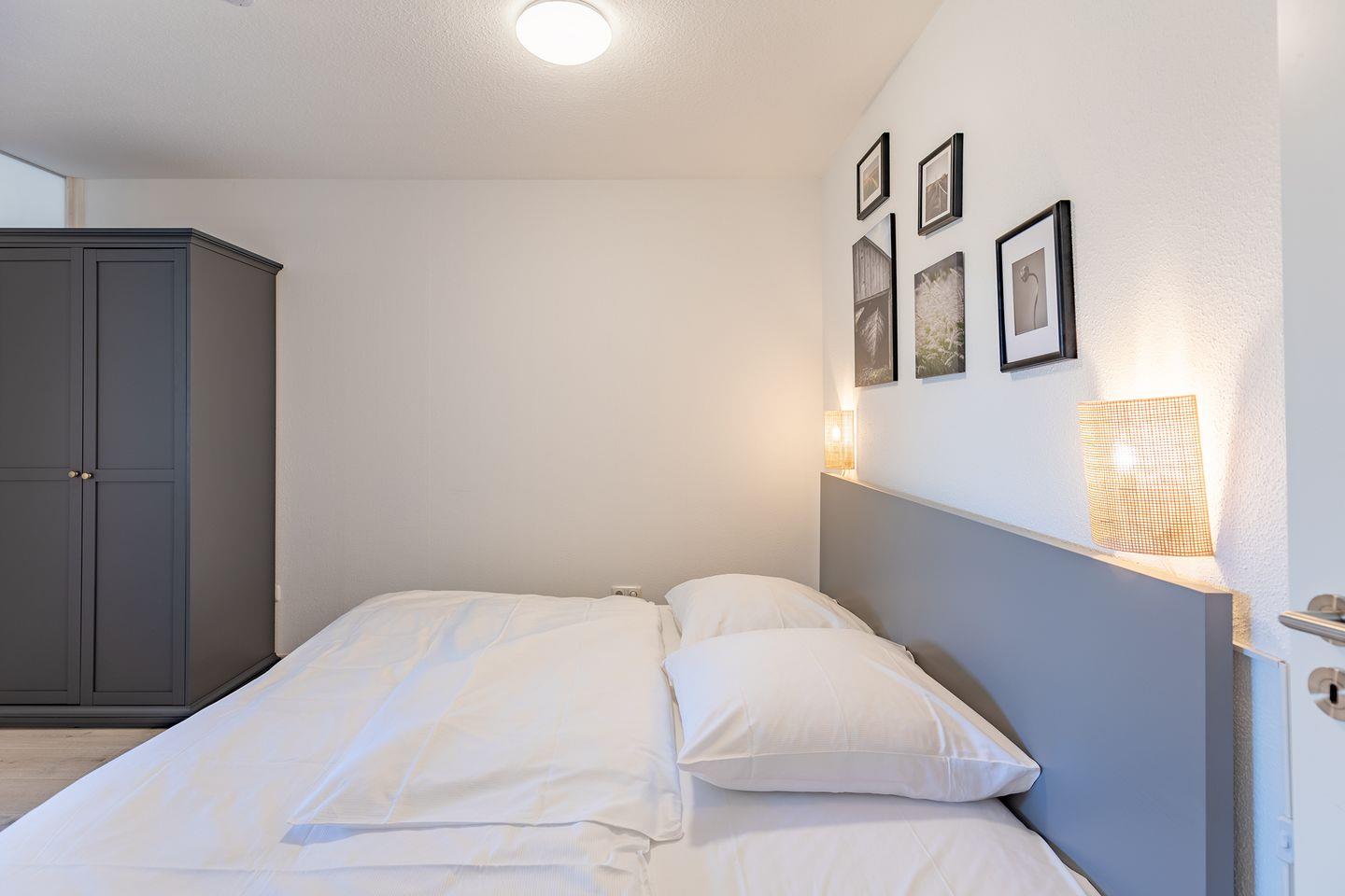 Am Abend finden Sie Erholung im separaten Schlafzimmer mit Doppelbett (180 × 200 cm, Durchgangszimmer zum Kinderzimmer) und Kleiderschrank. Von hier aus gelangen Sie zum Kinderzimmer mit einem Etagenbett mit drei Schlafebenen.