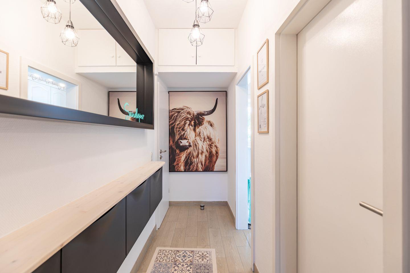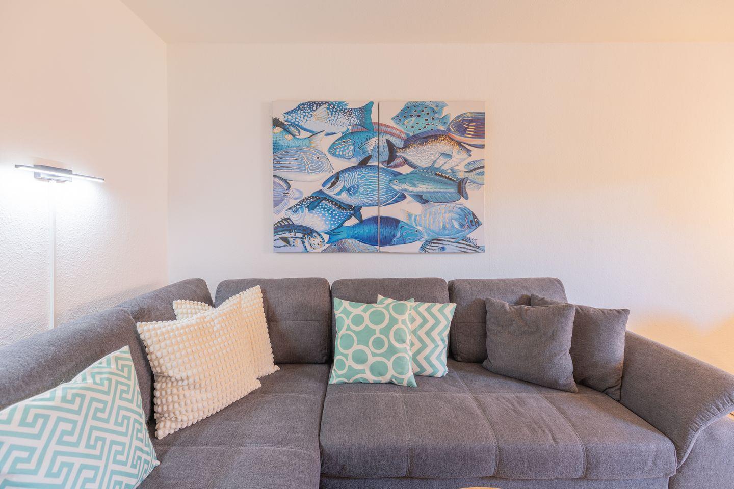 Die 2023 komplett renovierte, ebenerdige Wohnung ist 60 qm groß und geeignet für bis zu 2 Erwachsene und 3 Kinder. Sie betreten einen geschmackvoll eingerichteten Wohn-Ess-Bereich mit Sofaecke und großem Flachbild-TV.