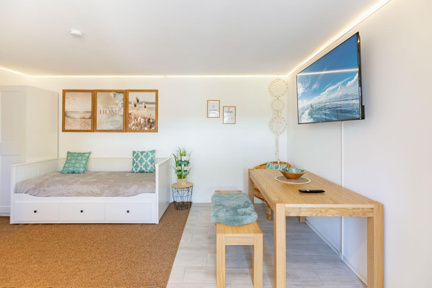 Die 2023 komplett renovierte, ebenerdige Wohnung ist 20 qm groß und geeignet für bis zu 2 Erwachsene. Sie verfügt über einen Essbereich, ein Kojenbett mit einer Stehlampe, dass Sie zum Schlafen ausziehen können und tagsüber als Sofa benutzen können und eine kleine Kochnische mit 2-Plattenkochfeld, Mikrowelle mit Backofenfunktion und Kühlschrank. Das moderne Duschbad rundet das Bild ab.