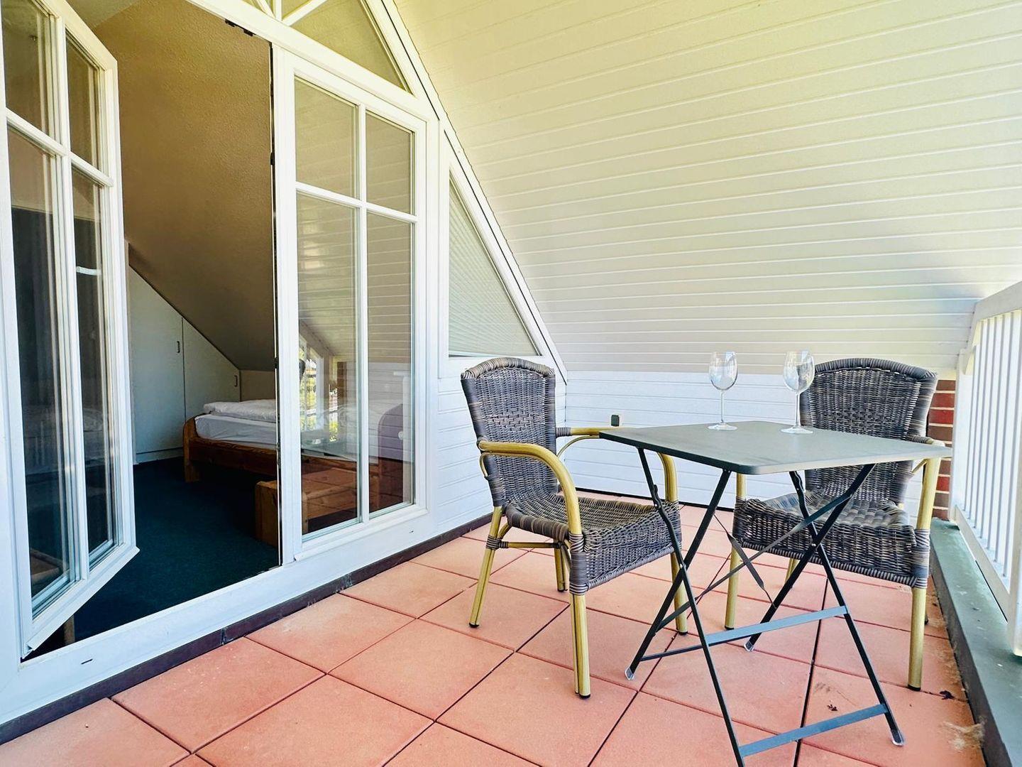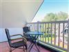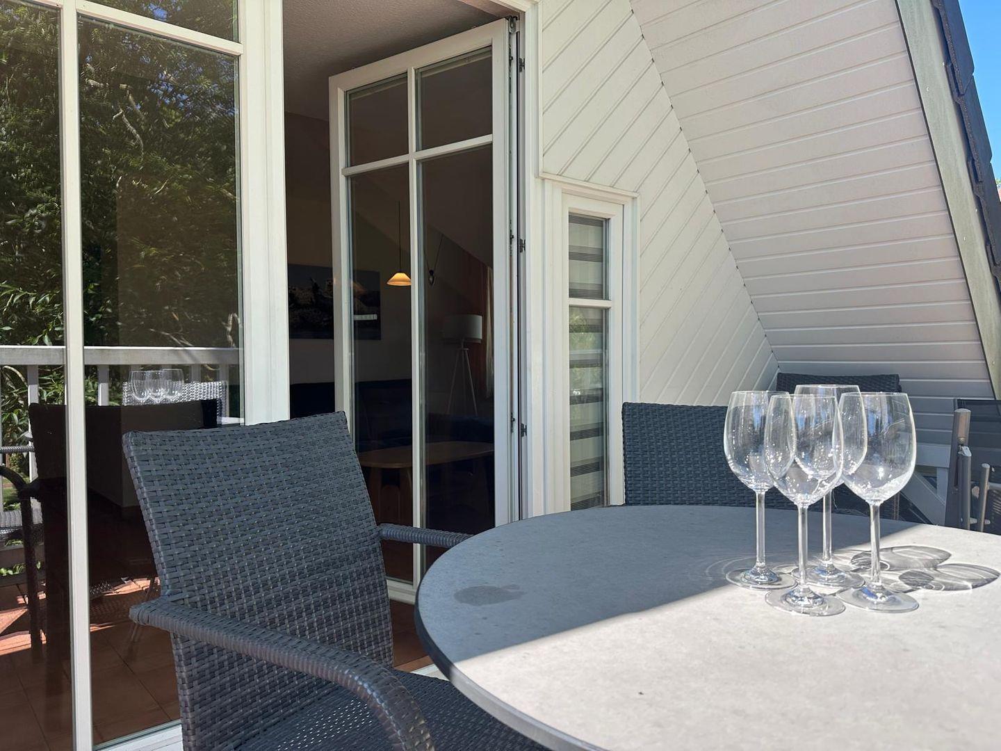 Genießen Sie entspannte Momente auf dem zum Garten ausgerichteten, möblierten Balkon mit Polsterauflagen und Sonnenschirm. Eine möblierte Loggia zur Straßenseite rundet das Angebot ab.