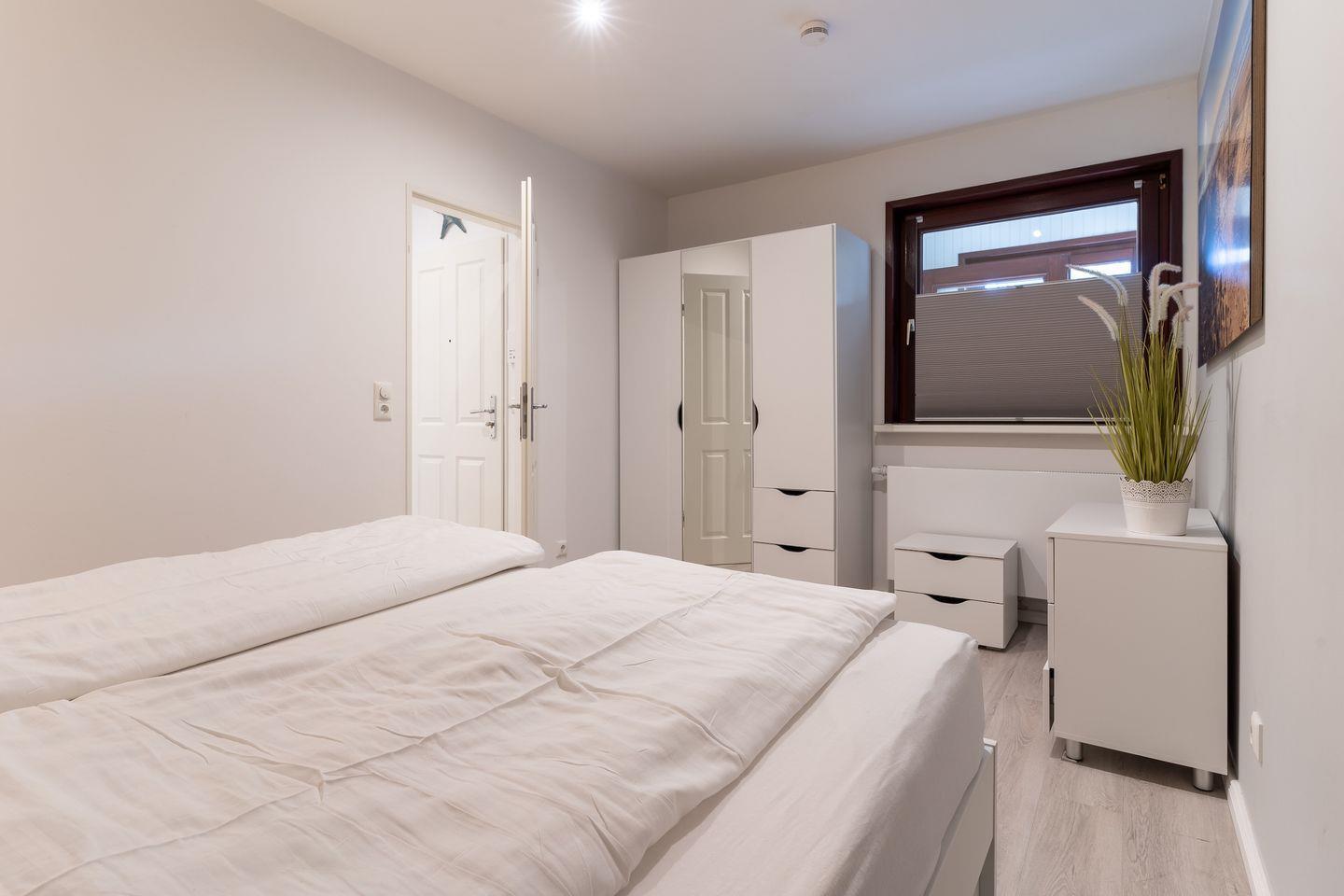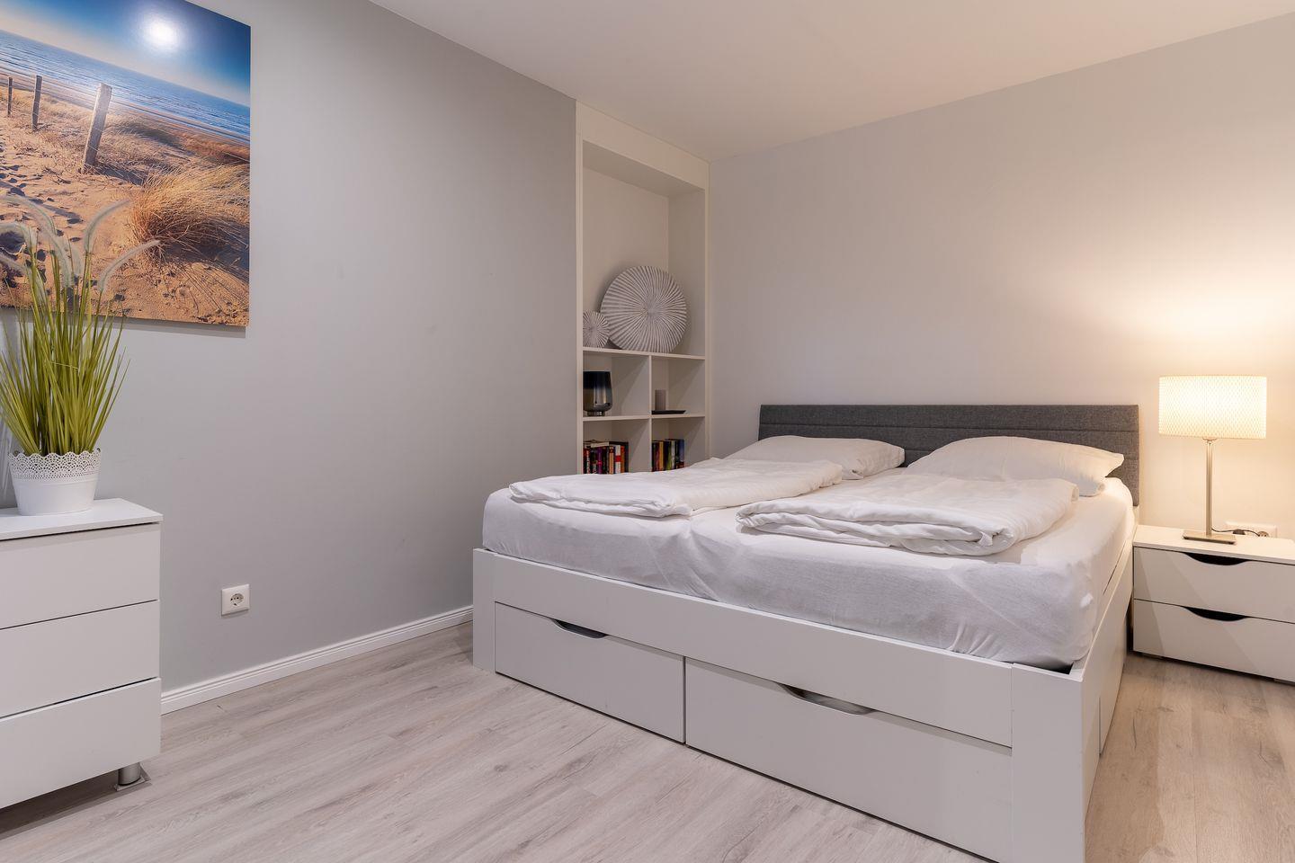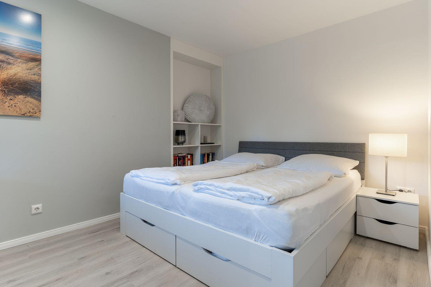 Für die Versorgung im Urlaub sorgt die vollumfassend ausgestattete, in den Raum integrierte Küche der Ferienwohnung. Hier stehen neben Cerankochfeld und Backofen noch Kühlschrank, Mikrowelle und Nespresso-Maschine bereit. Orangenpresse und Milchaufschäumer gehören ebenfalls zum Inventar. Im einladenden Schlafzimmer mit innenliegendem Fenster steht ein komfortables 180x200cm Doppelbett zur Verfügung. Zur modernen Ferienwohnung gehören weiterhin Duschbad mit WC und Haartrockner. Alle Fenster der Ferienwohnung sind mit Verdunklungsplissees ausgestattet. Die große Fensterfront ist mit elektrischem Außenrollo ausgestattet, um Licht und Sichtschutz nach Belieben regulieren zu können. Feriengästen steht kostenlos ein Waschtrockner zur Verfügung.