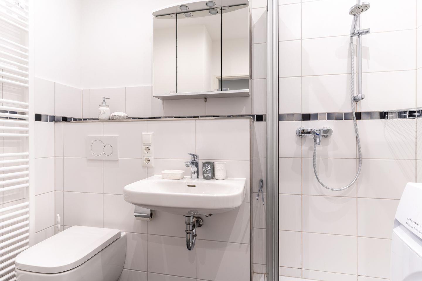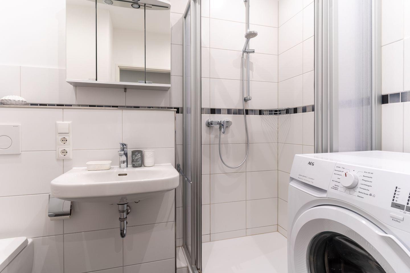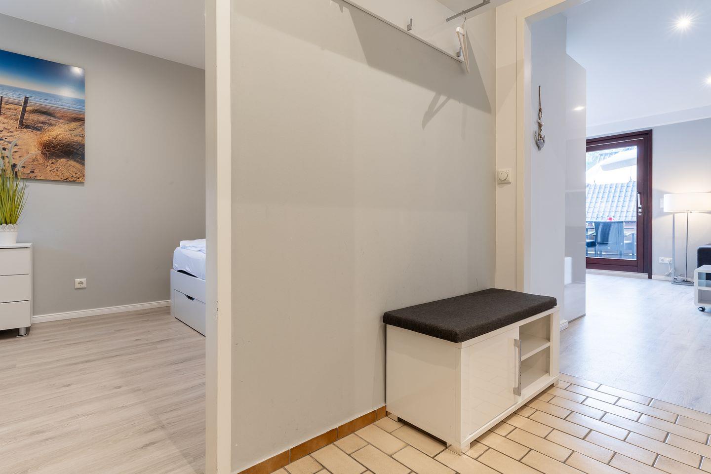Für die Versorgung im Urlaub sorgt die vollumfassend ausgestattete, in den Raum integrierte Küche der Ferienwohnung. Hier stehen neben Cerankochfeld und Backofen noch Kühlschrank, Mikrowelle und Nespresso-Maschine bereit. Orangenpresse und Milchaufschäumer gehören ebenfalls zum Inventar. Im einladenden Schlafzimmer mit innenliegendem Fenster steht ein komfortables 180x200cm Doppelbett zur Verfügung. Zur modernen Ferienwohnung gehören weiterhin Duschbad mit WC und Haartrockner. Alle Fenster der Ferienwohnung sind mit Verdunklungsplissees ausgestattet. Die große Fensterfront ist mit elektrischem Außenrollo ausgestattet, um Licht und Sichtschutz nach Belieben regulieren zu können. Feriengästen steht kostenlos ein Waschtrockner zur Verfügung.