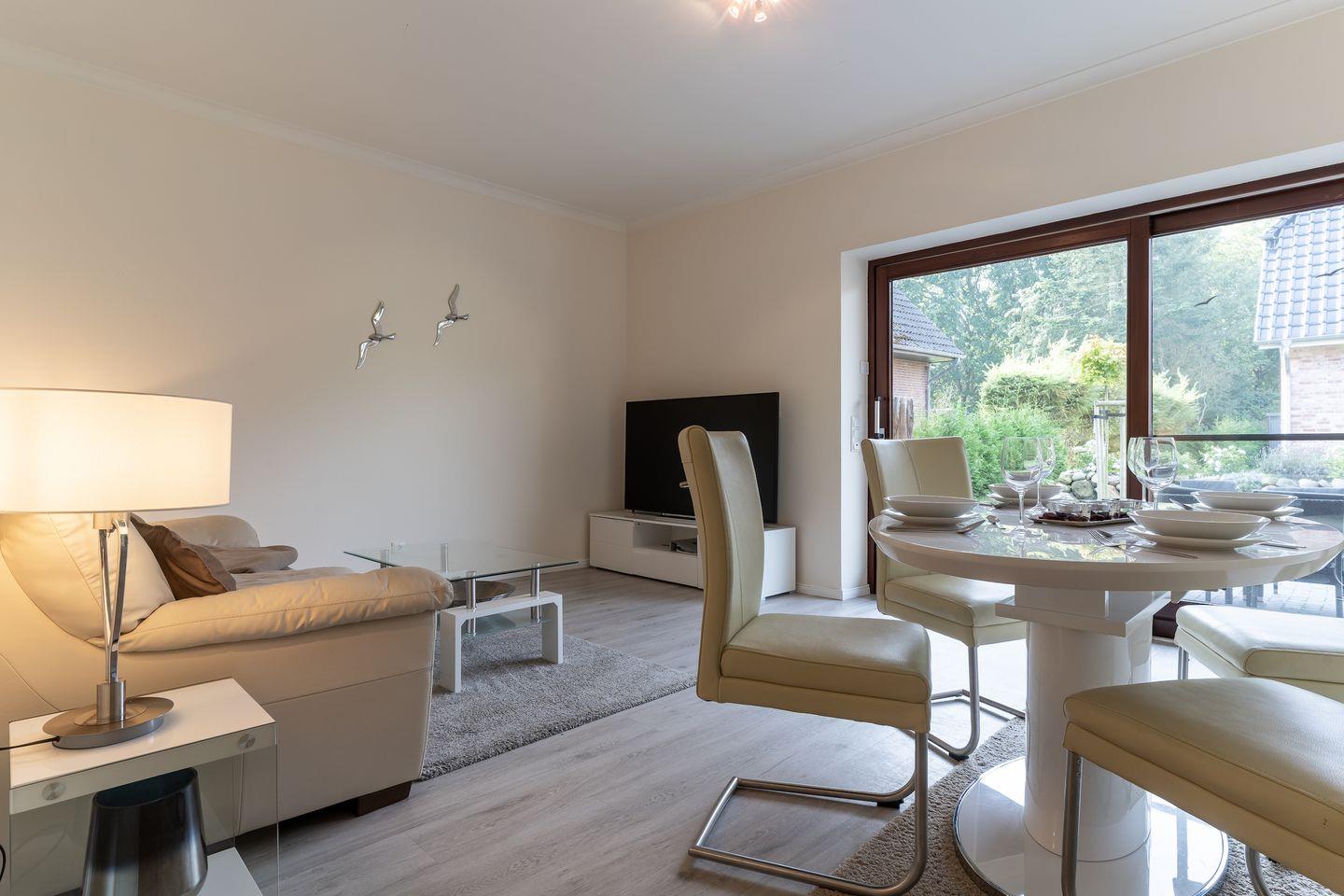 Hier genießen Sie bei Abendsonne ein herrliches Beisammensein im Freien. Auch der Urlaub mit Hund ist in der modernen Ferienwohnung hier möglich, bis zu 2 Hunde begleiten die Familie in den Urlaub nach St. Peter Ording. Das moderne Wohnzimmer wirkt durch die große Fensterfront wunderbar hell und freundlich. Zur Ausstattung dort gehören ein edles Ledersofa und der große Esstisch, an dem die ganze Familie Platz findet.