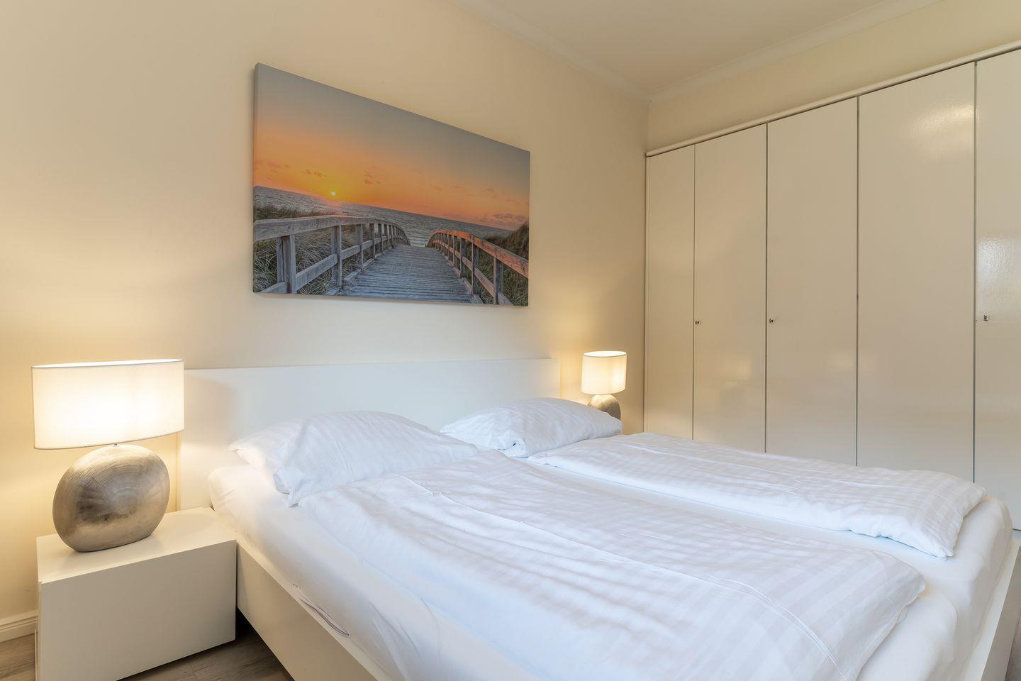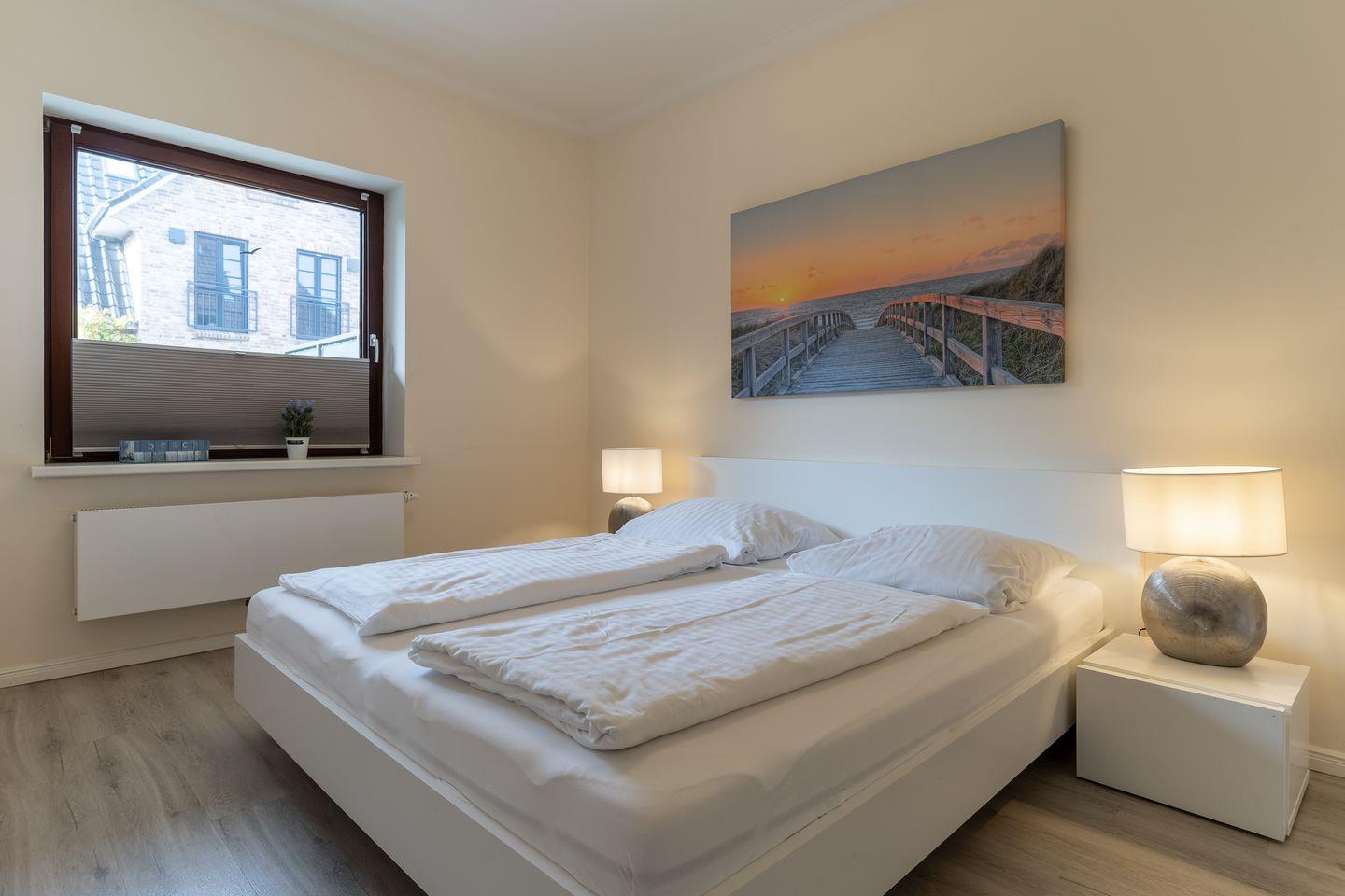 Für die Versorgung im Urlaub sorgt die vollumfassend ausgestattete Küche der Ferienwohnung. Hier stehen unter anderem Cerankochfeld und Backofen sowie Kühlschrank, Mikrowelle und Nespresso-Maschine bereit. Orangenpresse und Milchaufschäumer gehören ebenfalls zum Inventar. Im hellen, einladenden Schlafzimmer steht ein komfortables 180x200cm Doppelbett zur Verfügung. Zur edlen Ferienwohnung gehören weiterhin Duschbad mit WC, Haartrockner und Schminkspiegel. Alle Fenster der Ferienwohnung sind mit Fliegenschutzgitter und Verdunklungsplissees ausgestattet. Die große Fensterfront ist mit elektrischem Außenrollo ausgestattet, um Licht und Sichtschutz nach Belieben regulieren zu können. Feriengästen steht zudem ein kostenfrei nutzbarer Waschtrockner zur Verfügung.