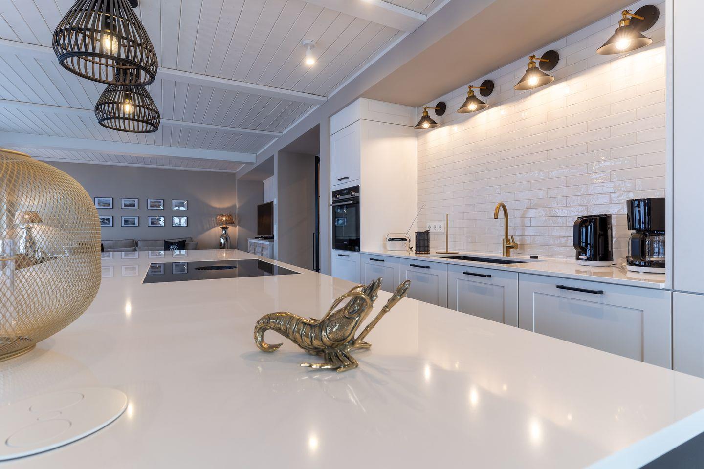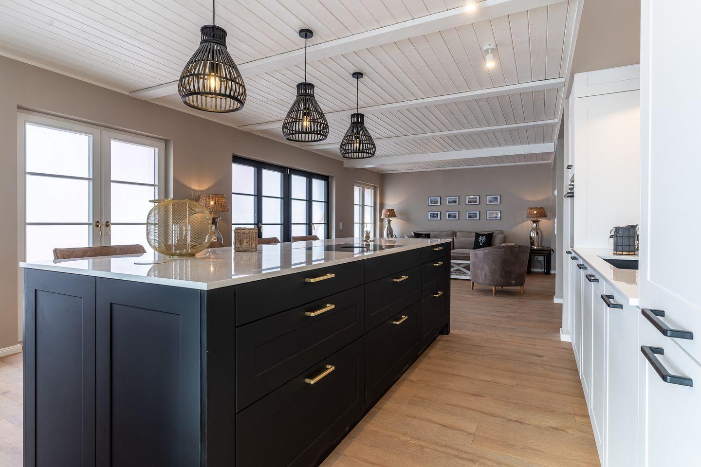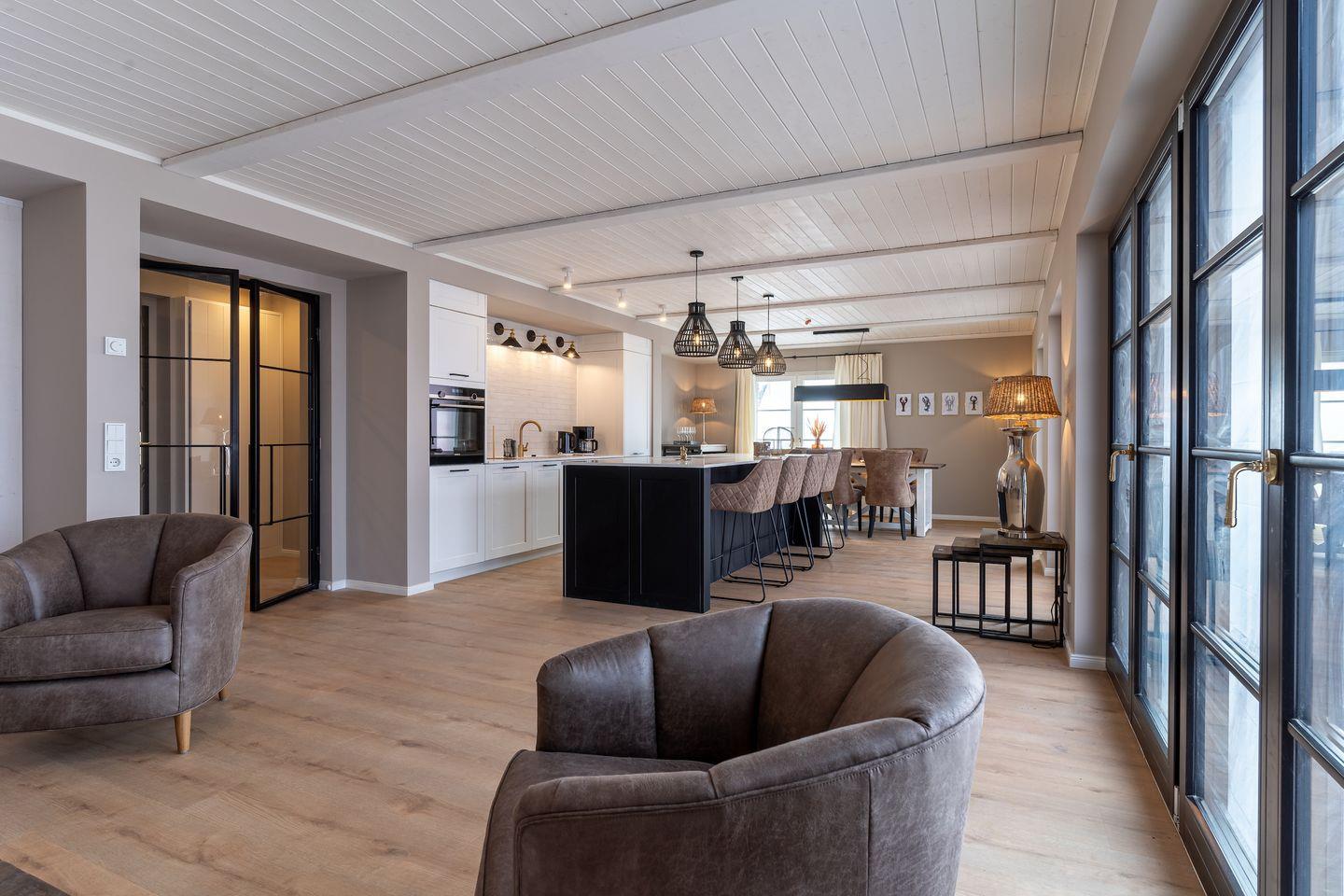 Im Wohnbereich erwartet Sie ein loftartiges Gefühl, denn das lichtdurchflutete Wohnzimmer, die offene Küche sowie das wunderschöne Esszimmer mit luxuriösen Möbeln gehen alle ineinander über. Die Küche verfügt über hochwertige Elektrogeräte und genügend Platz zum gemeinsamen Kochen, sowie verweilen.
