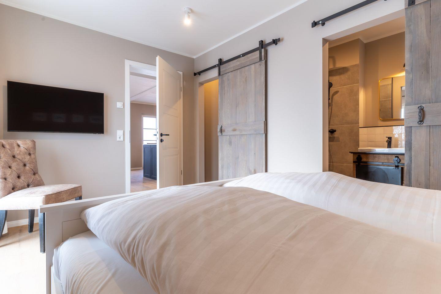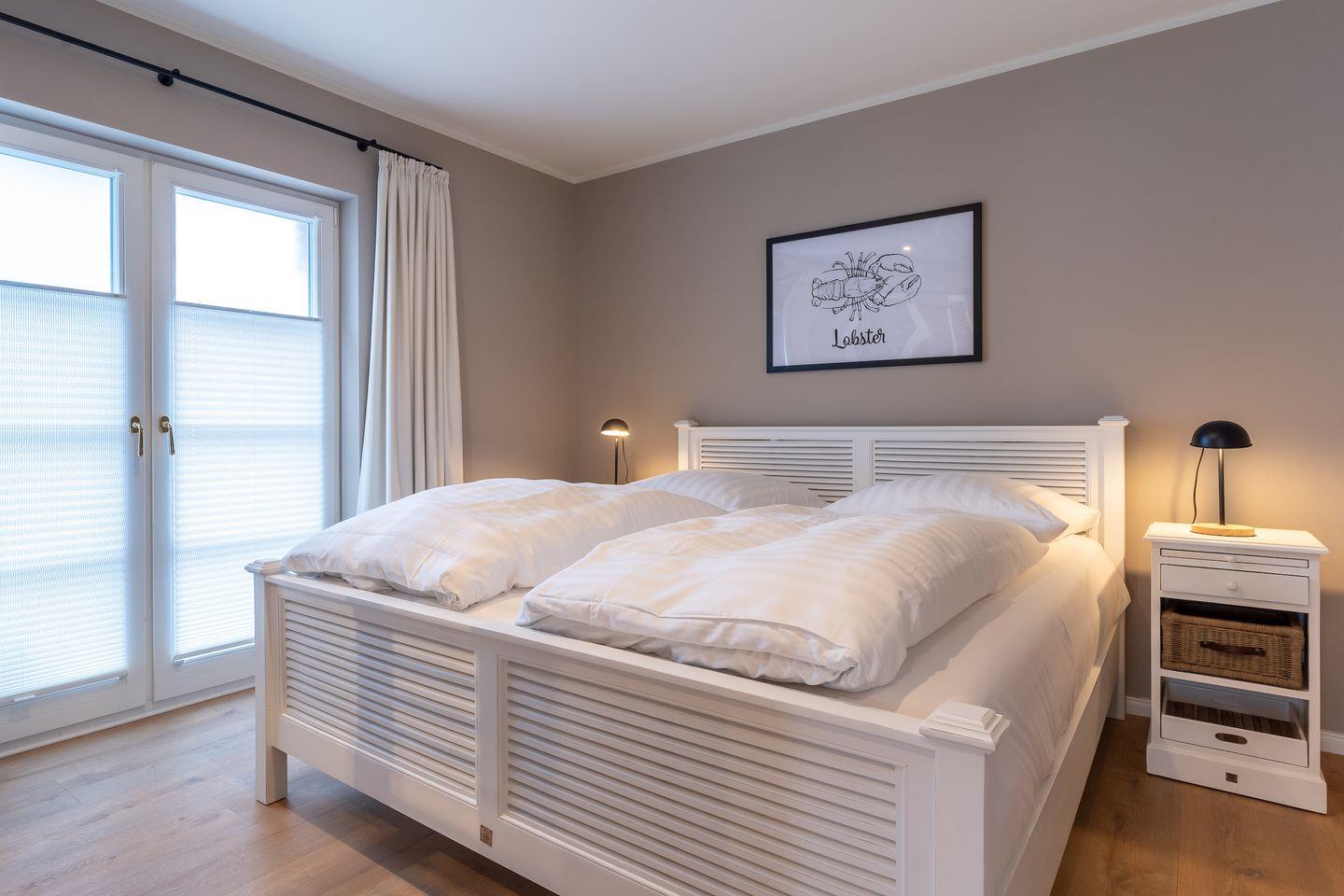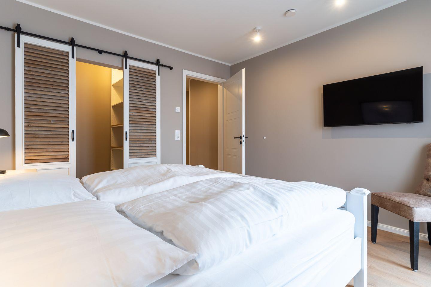 Angrenzend befinden sich die beiden weiteren Schlafzimmer, die ebenfalls über ein Doppelbett, einen TV sowie ein Ankleidezimmer verfügen. Die Zimmer sind hell und freundlich mit stilvollen Möbeln eingerichtet.