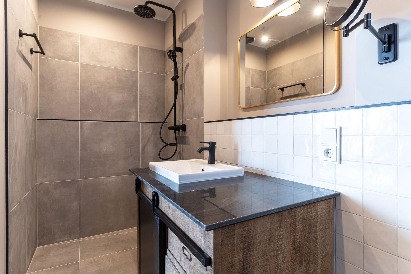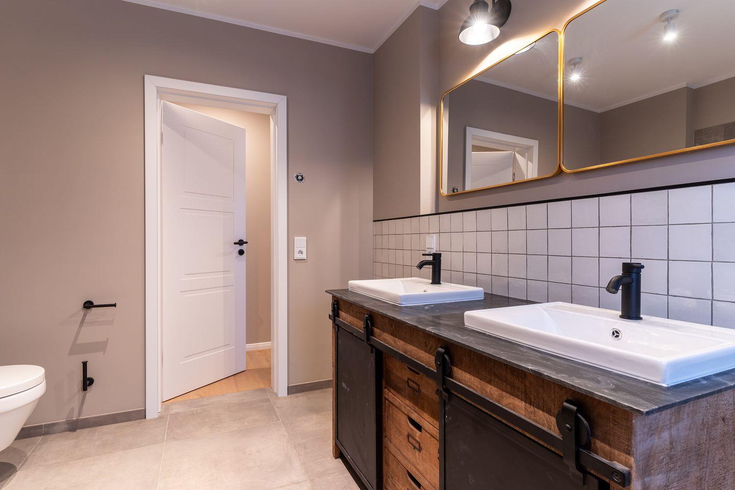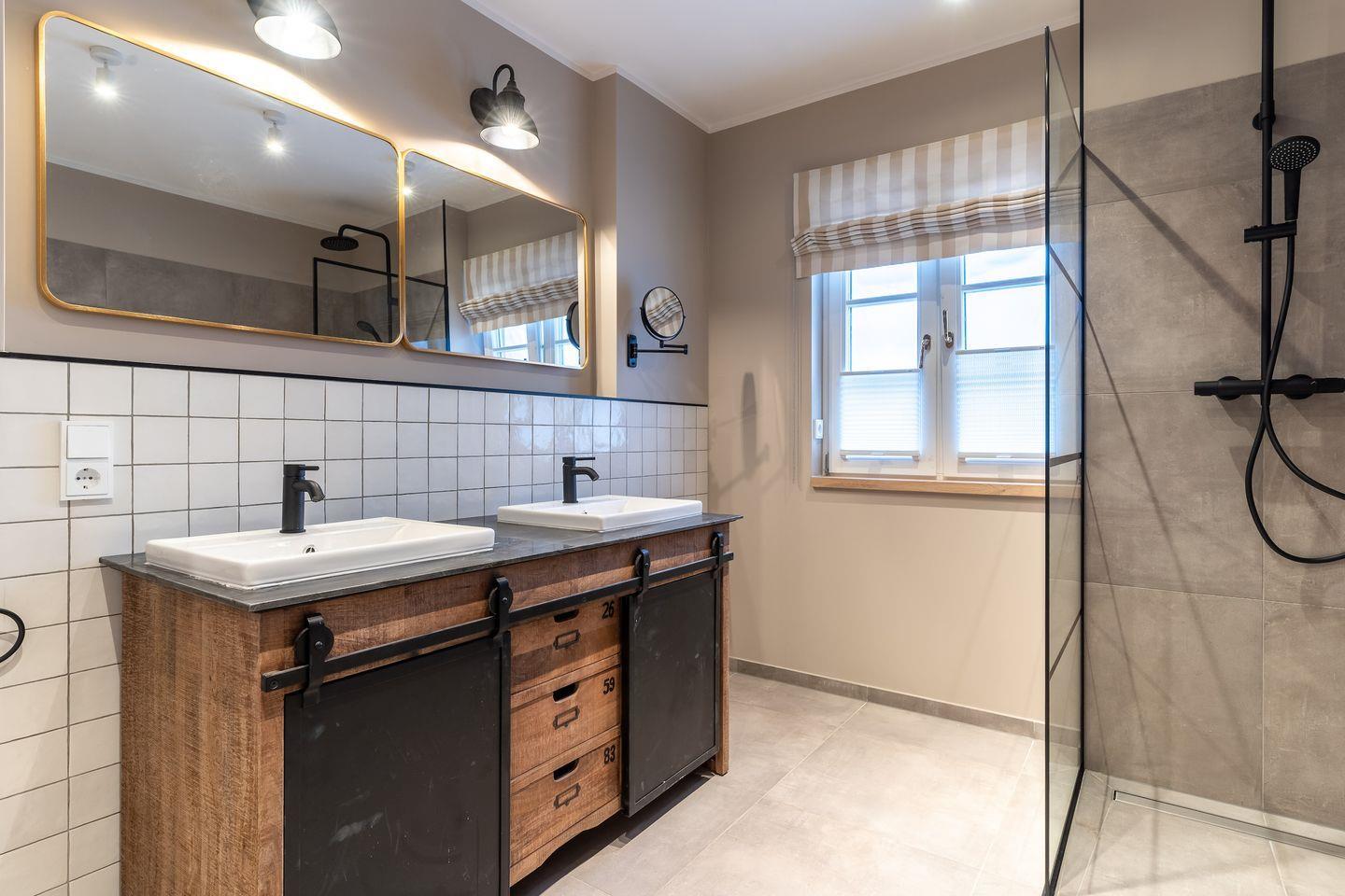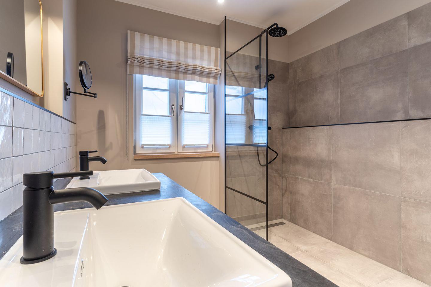 Über einen schönen Flur gelangt man in ein voll ausgestattetes Badezimmer mit einer Rainshower-Glas-Dusche, einem WC sowie einem großzügigen Doppelwaschtisch.