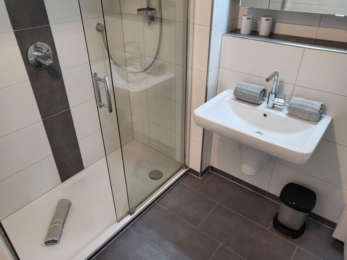 Das moderne und hochwertige Badezimmer ist mit einer bodengleichen Dusche und einem WC ausgestattet.