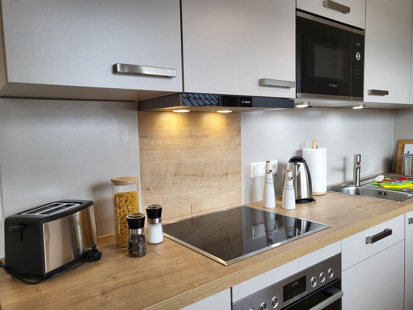 Die separate Küche ist hochwertig und vollumfassend mit Cerankochfeld, Backofen, Geschirrspüler, einem Kühlschrank mit separaten Gefrierfach, Mikrowelle, Kaffemaschine, Toaster und weiteren Kleingeräten usw. ausgestattet.
