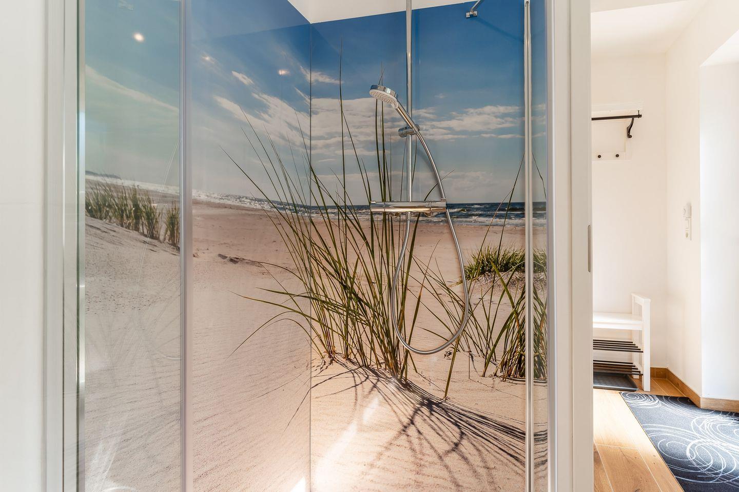 Das moderne Badezimmer bietet eine Dusche, eine Toilette und alle notwendigen Annehmlichkeiten, um sich nach einem erlebnisreichen Tag zu erfrischen.