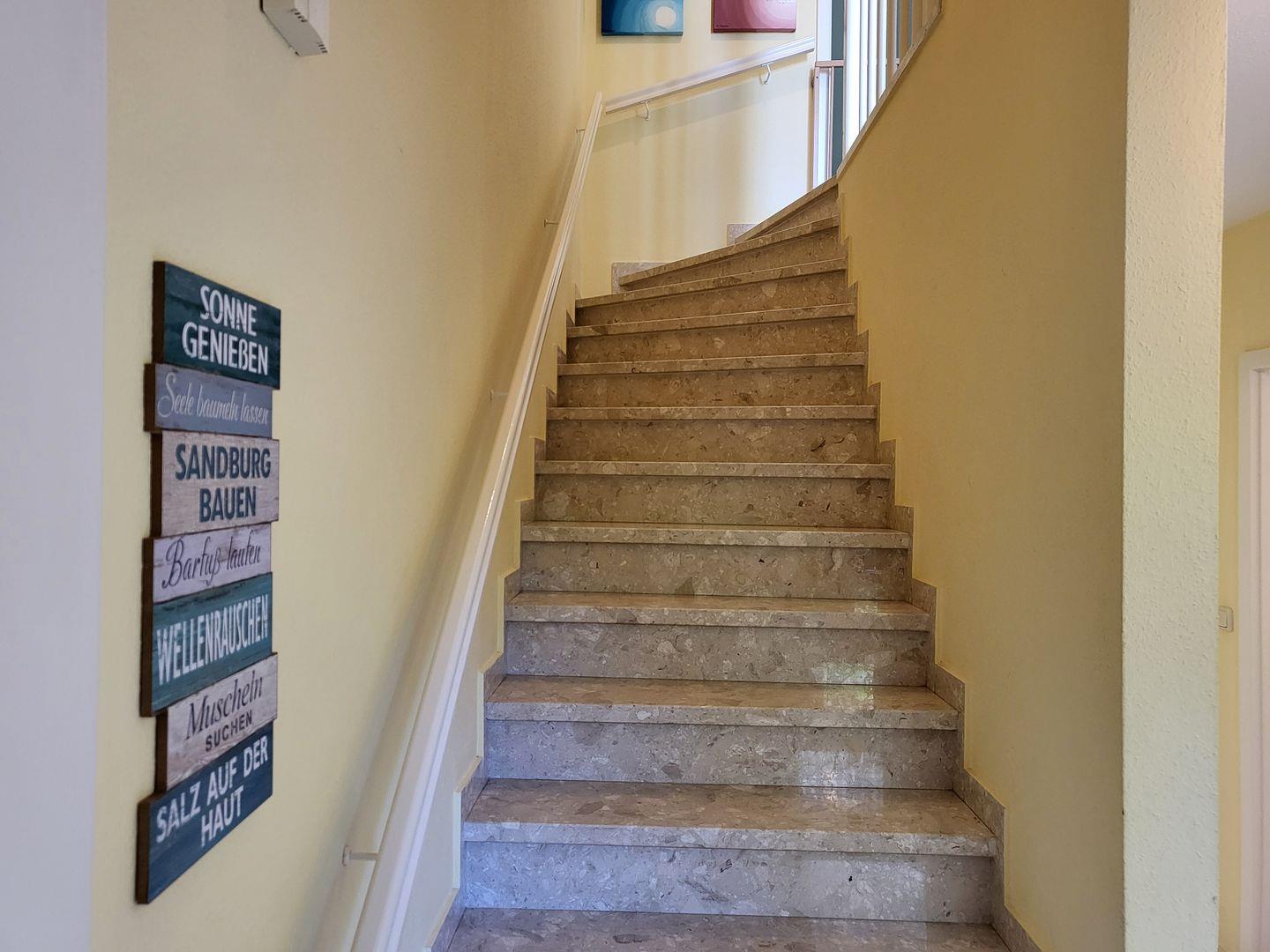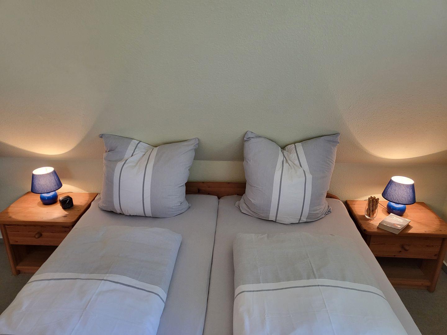 Ins Obergeschoß gelangen sie über den Treppenaufgang im Flur. Dort sind zwei separate Schlafzimmer,eines mit Doppelbett und eines mit zwei Einzelbetten und ein Duschbad mit WC und Fenster.