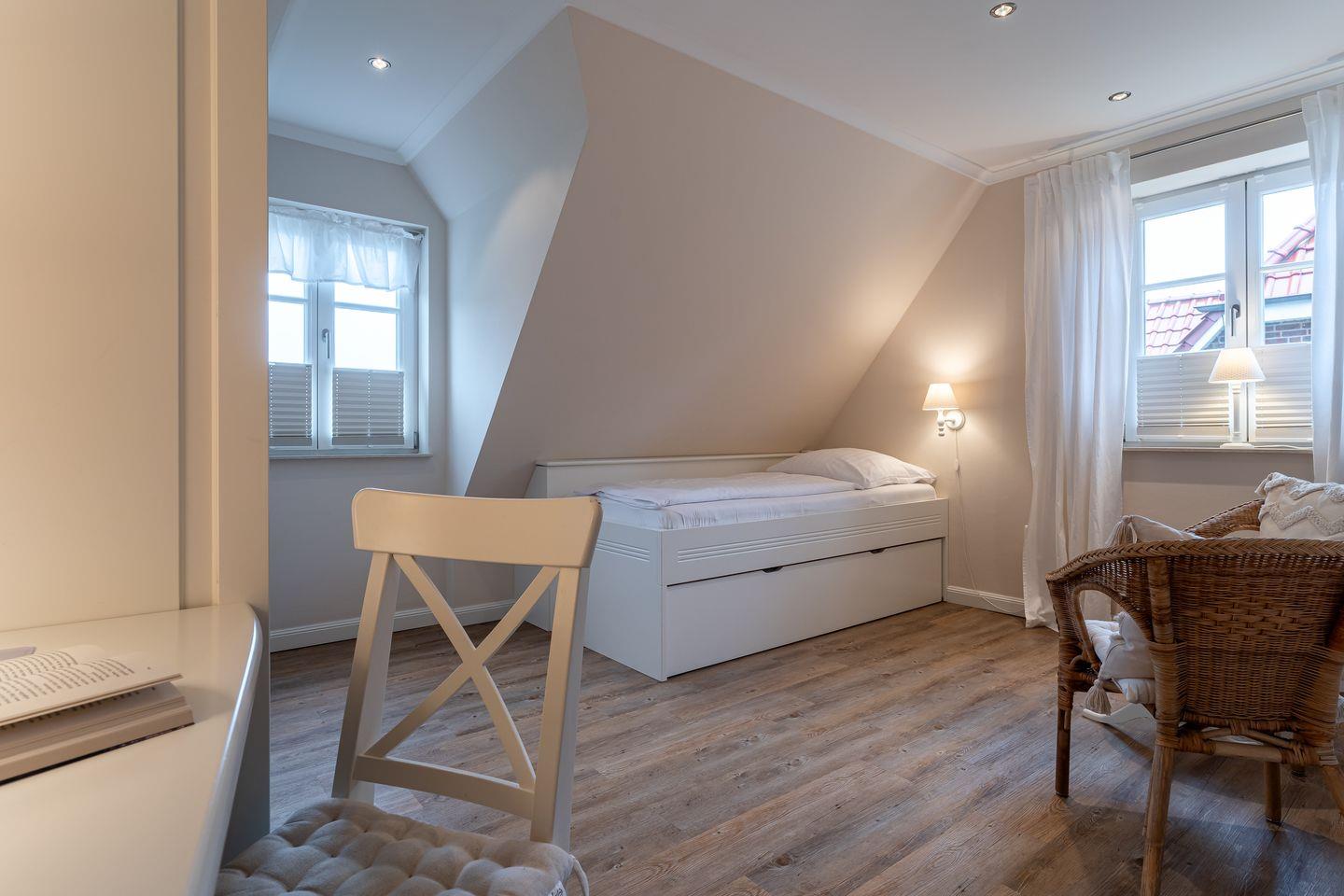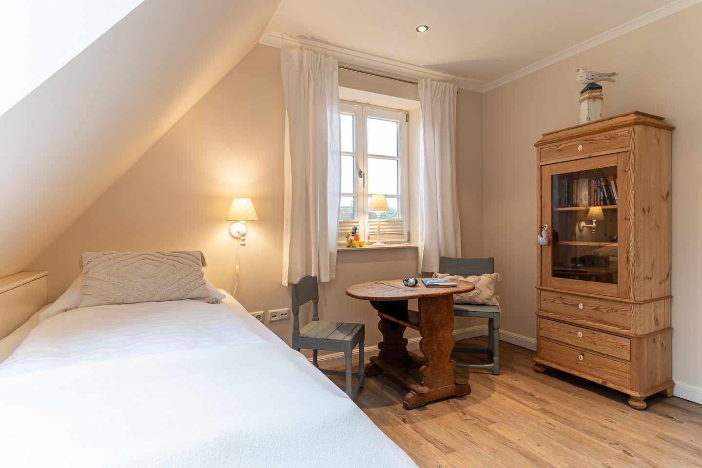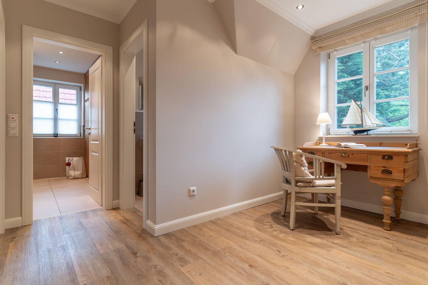 Obergeschoss: ein separater Arbeitsbereich mit Schreibtisch, ein Schlafzimmer mit Doppelbett (180 x 200 cm), Sitzecke und Arbeitsplatz, ein Schlafzimmer mit Einzelbett (80 x 200 cm), Sitzecke und Arbeitsplatz, ein Schlafzimmer mit Einzelbett (80 x 200 cm), ein Duschbad / WC mit angegliederter Sauna, ein separates Gäste-WC