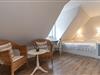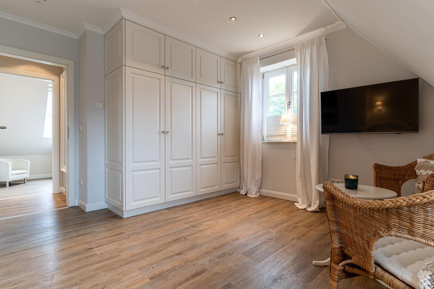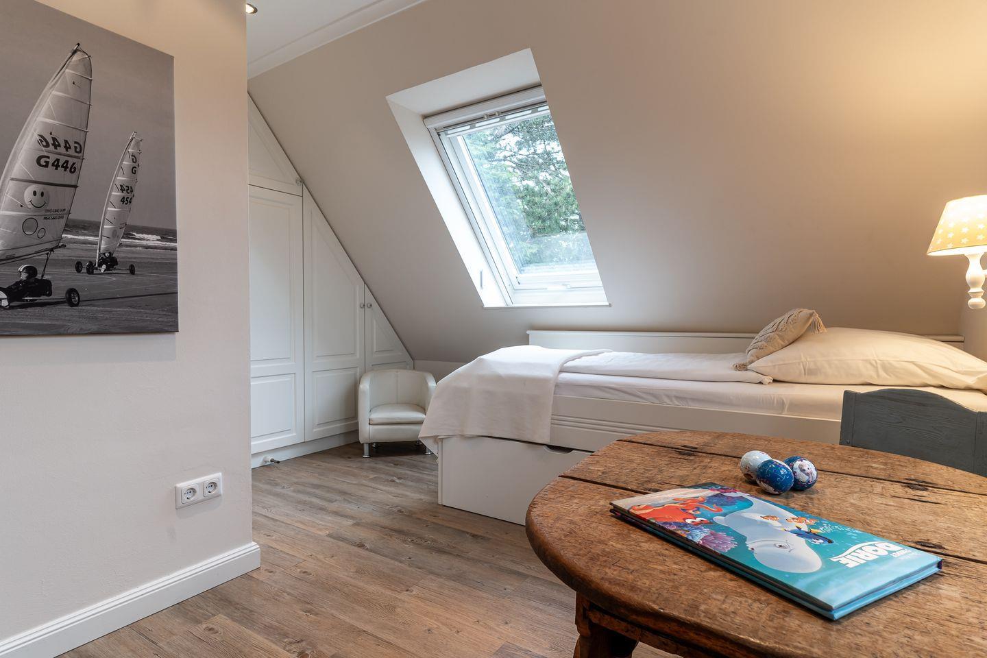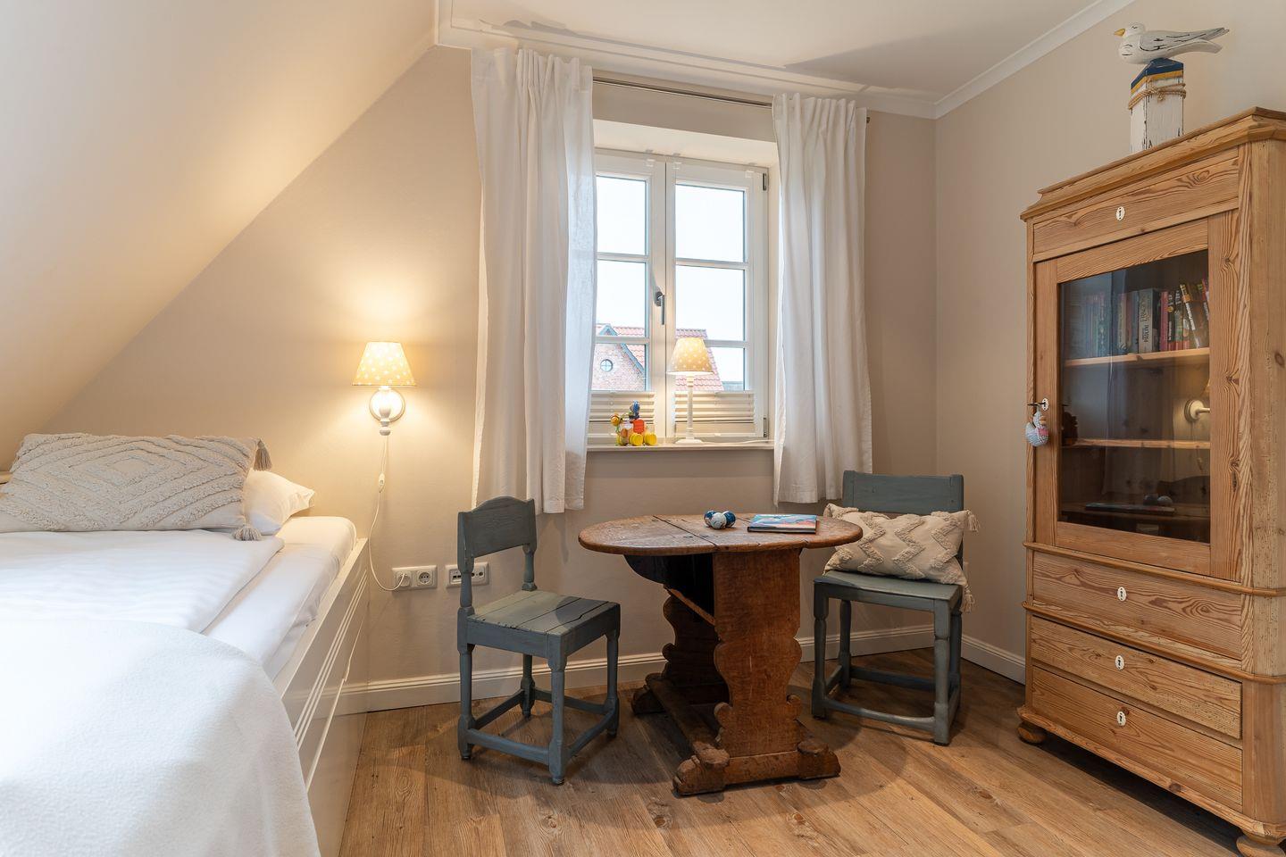 Obergeschoss: ein separater Arbeitsbereich mit Schreibtisch, ein Schlafzimmer mit Doppelbett (180 x 200 cm), Sitzecke und Arbeitsplatz, ein Schlafzimmer mit Einzelbett (80 x 200 cm), Sitzecke und Arbeitsplatz, ein Schlafzimmer mit Einzelbett (80 x 200 cm), ein Duschbad / WC mit angegliederter Sauna, ein separates Gäste-WC